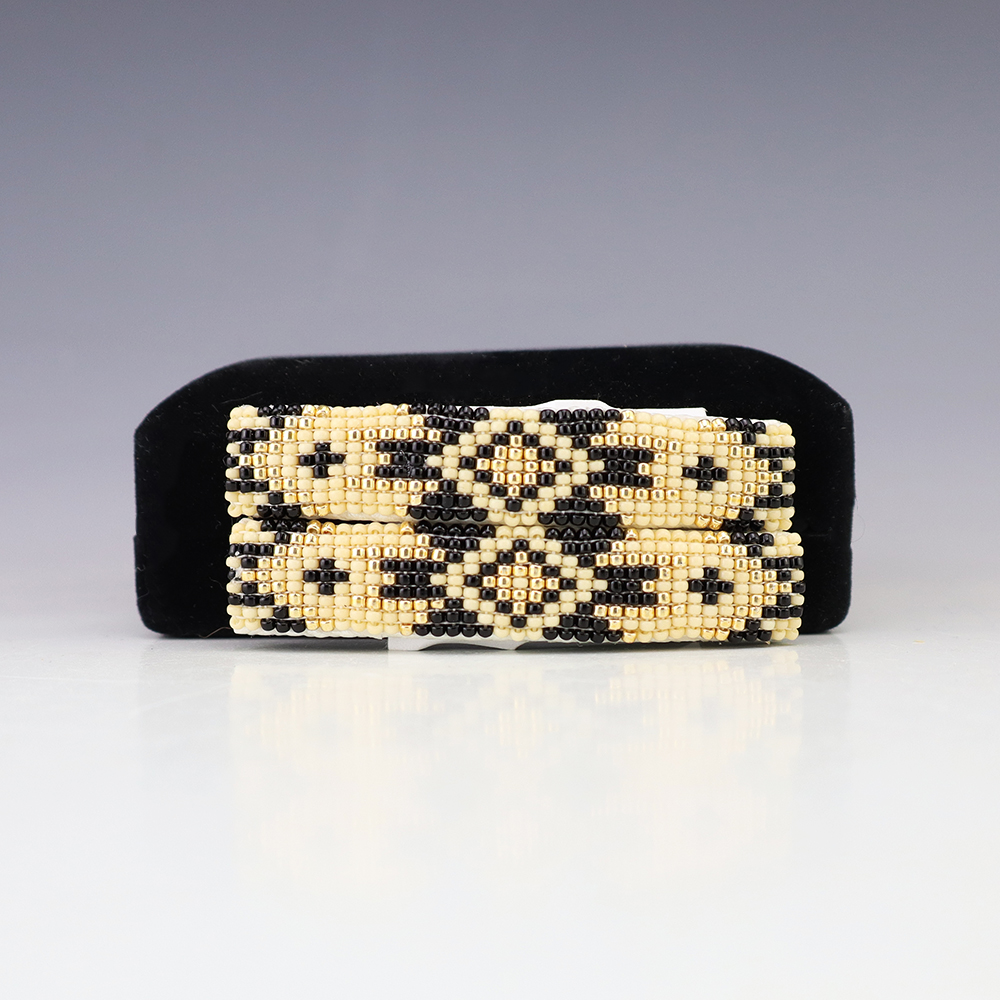 Navajo artist Sharon Hunt hand beaded these beautiful barrettes. Great colors that compliment the design. Sharon uses tiny seed beads to create his jewelry and backs it with soft leather.