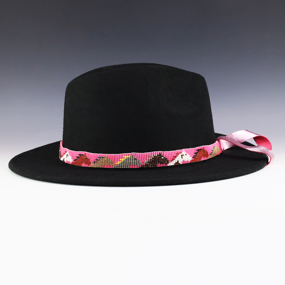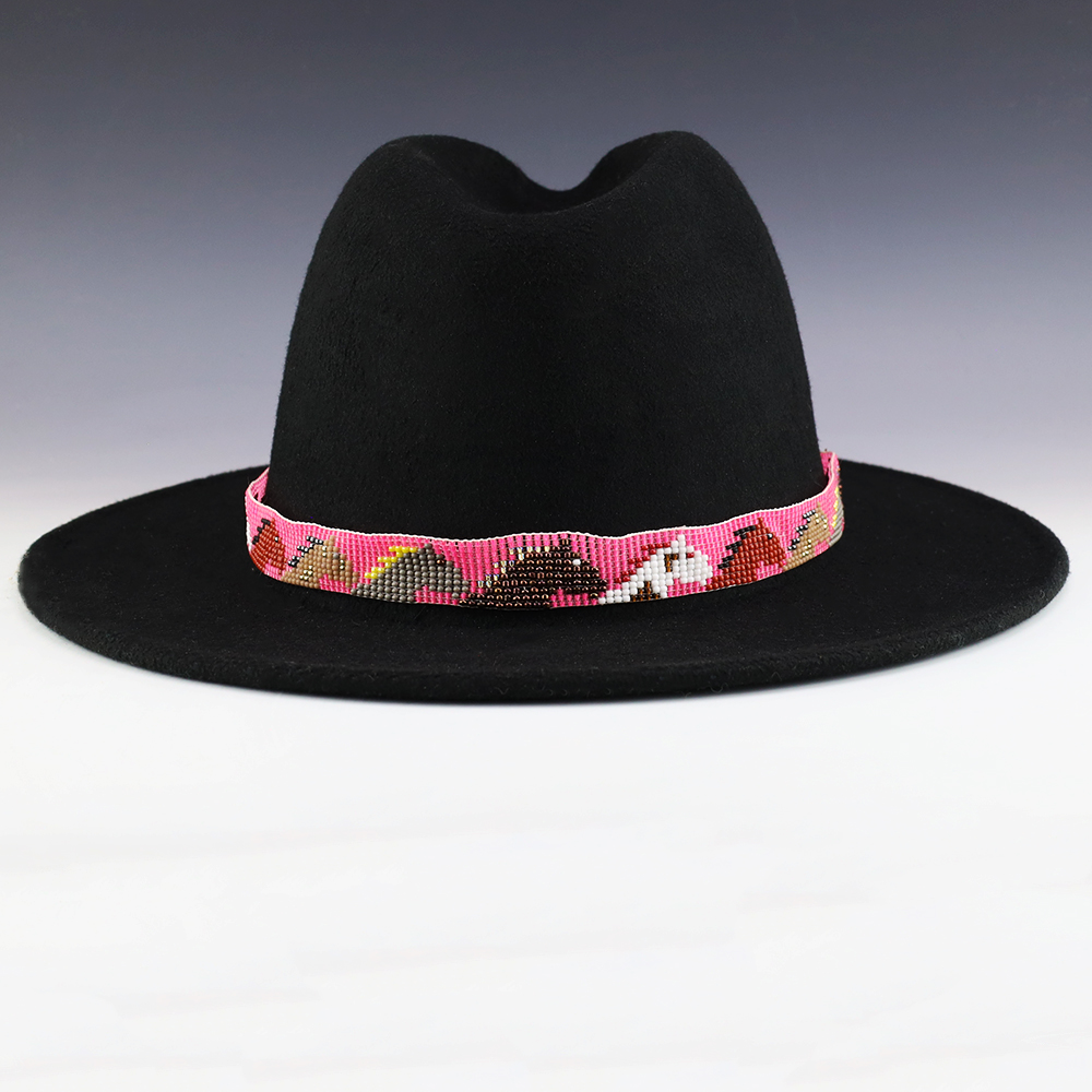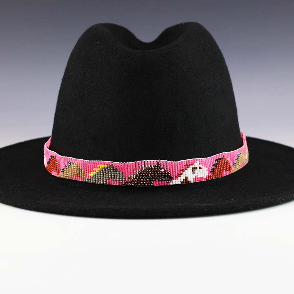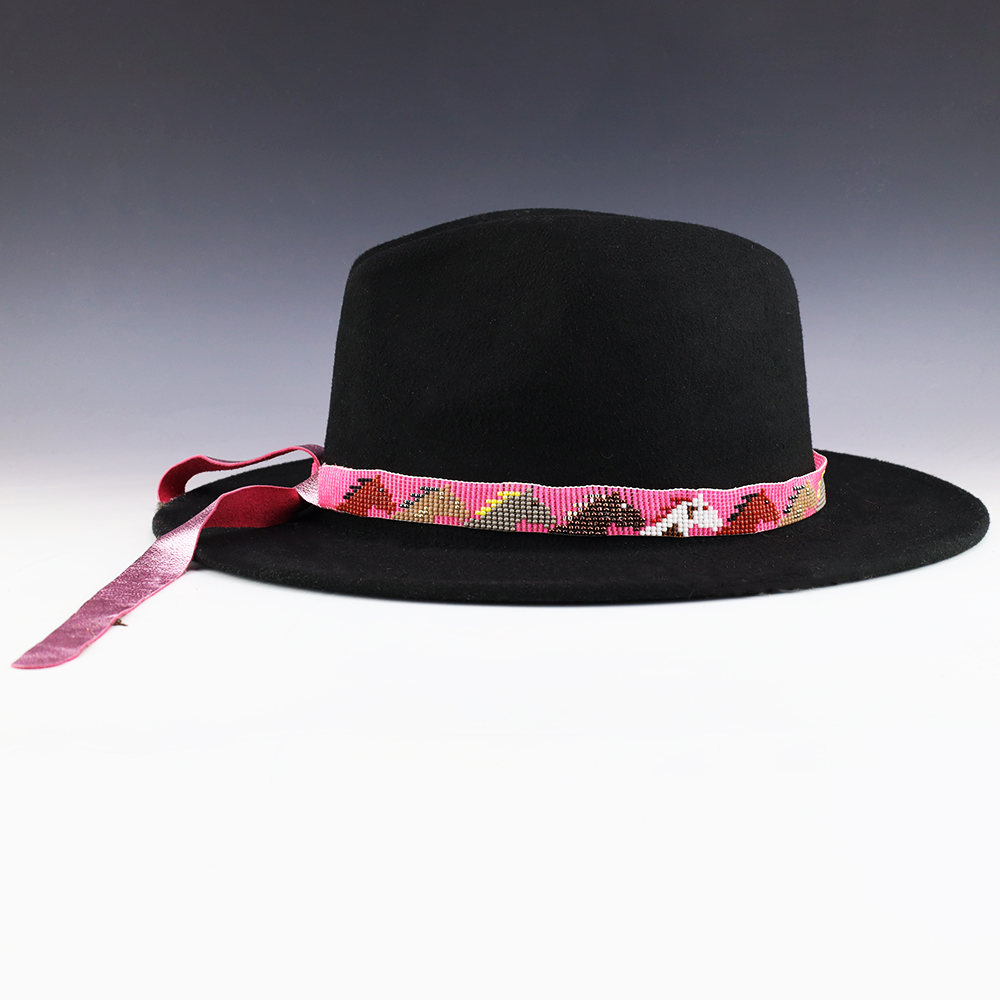 Great colors and patterns in this hand made beaded hat band. Tiny seed beads are used and with soft leather on the ends. Hand made by Navajo artist, Charlene Jackson. (Hat not included)