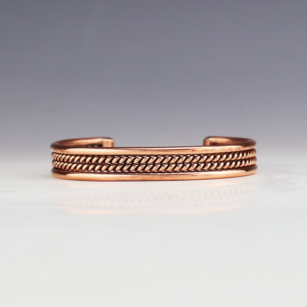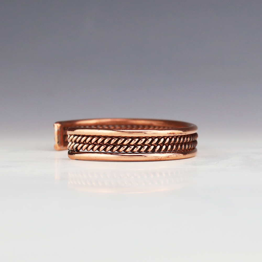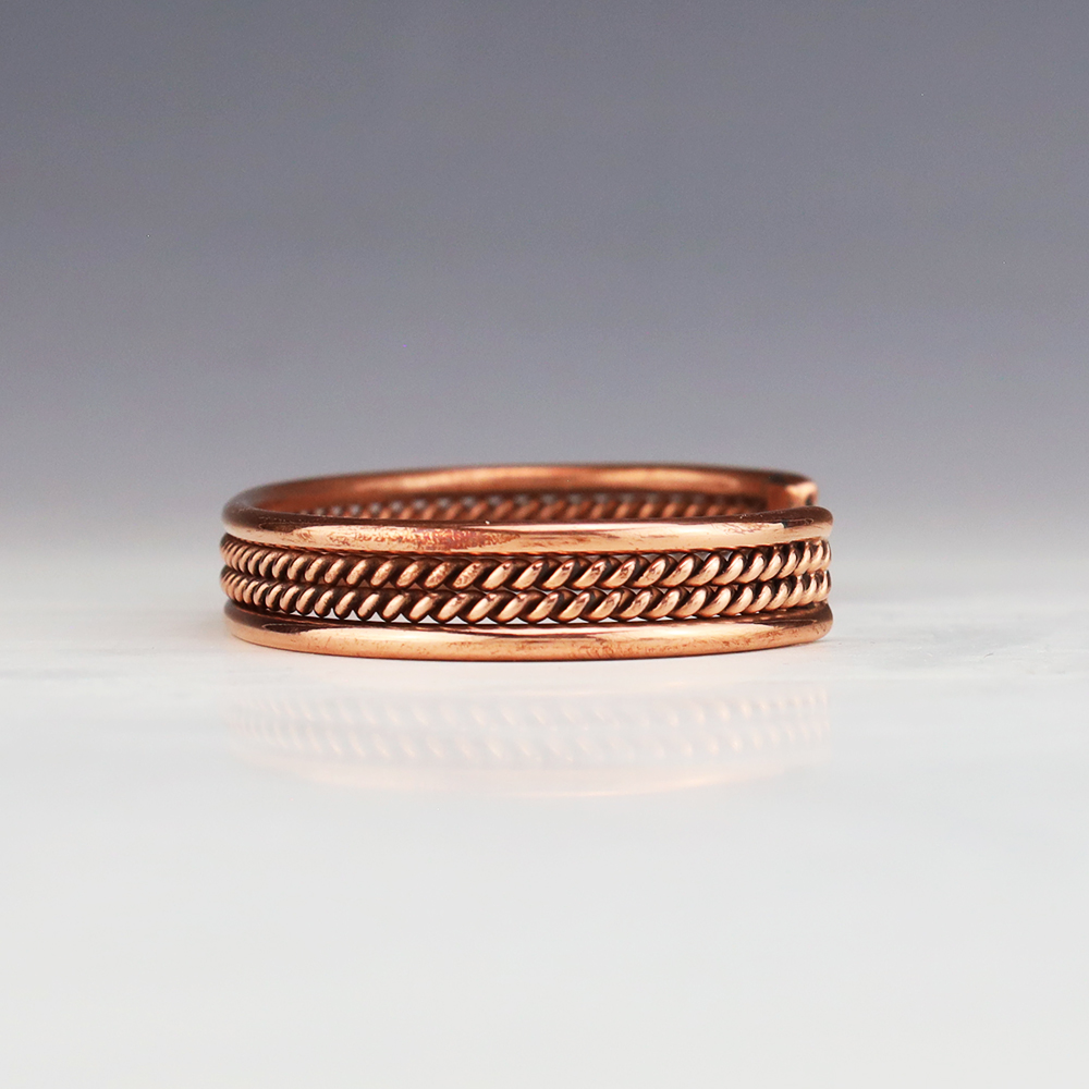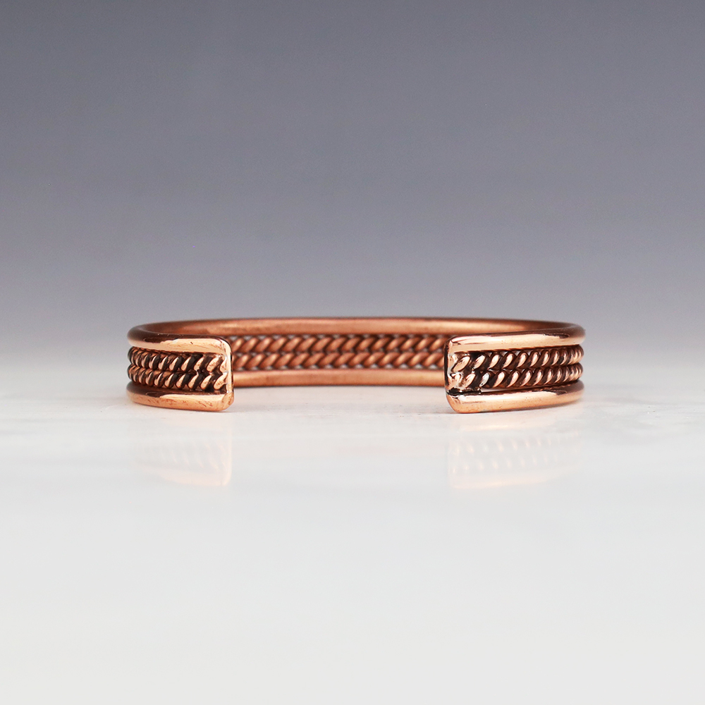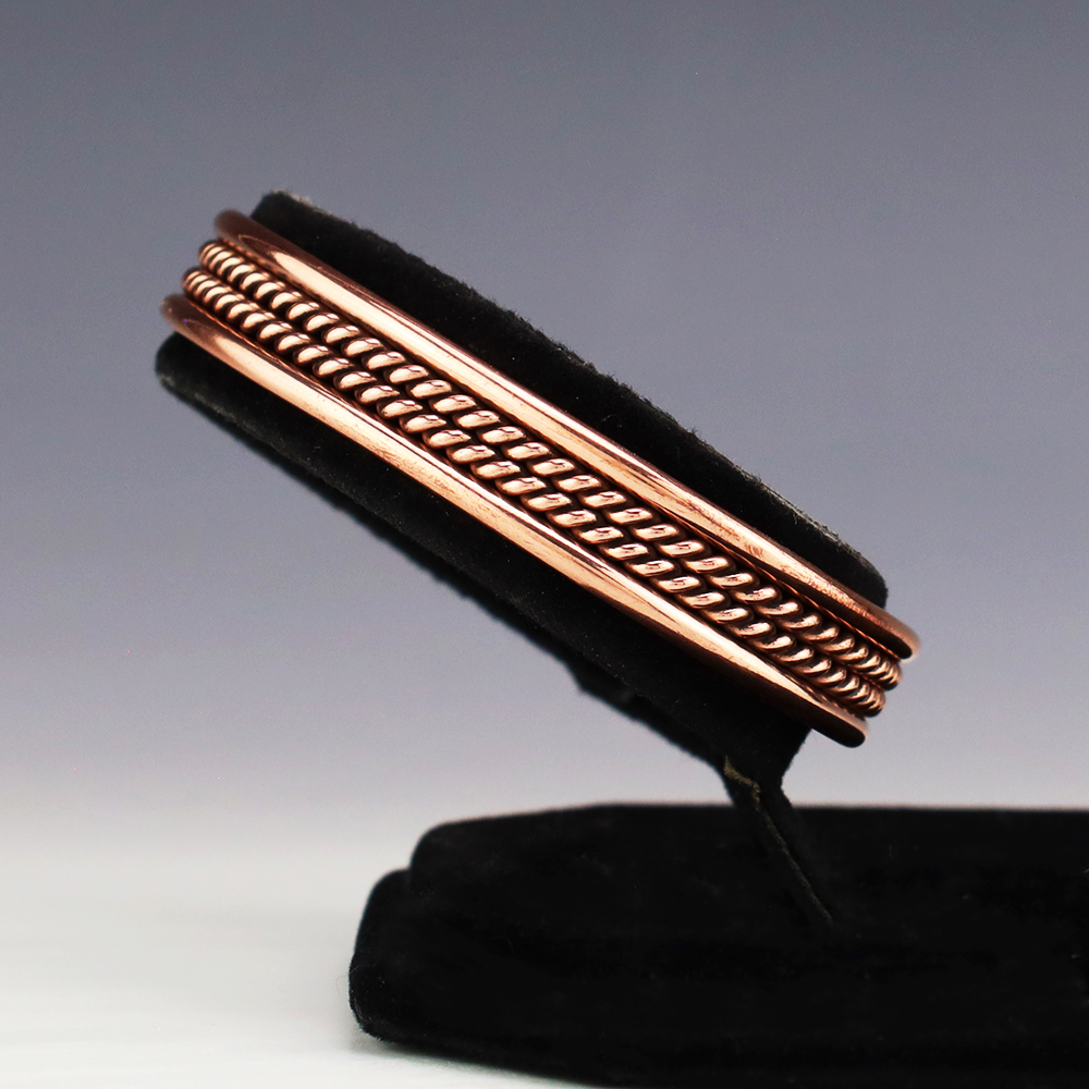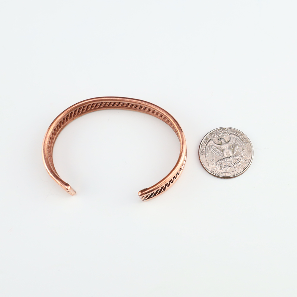 Stellar twist bracelet made out of Copper. Weighs 22 grams. The entire inner circumference is about 6 1/2”, including 1 5/16” opening. (Fits a 6 1/2″ wrist).