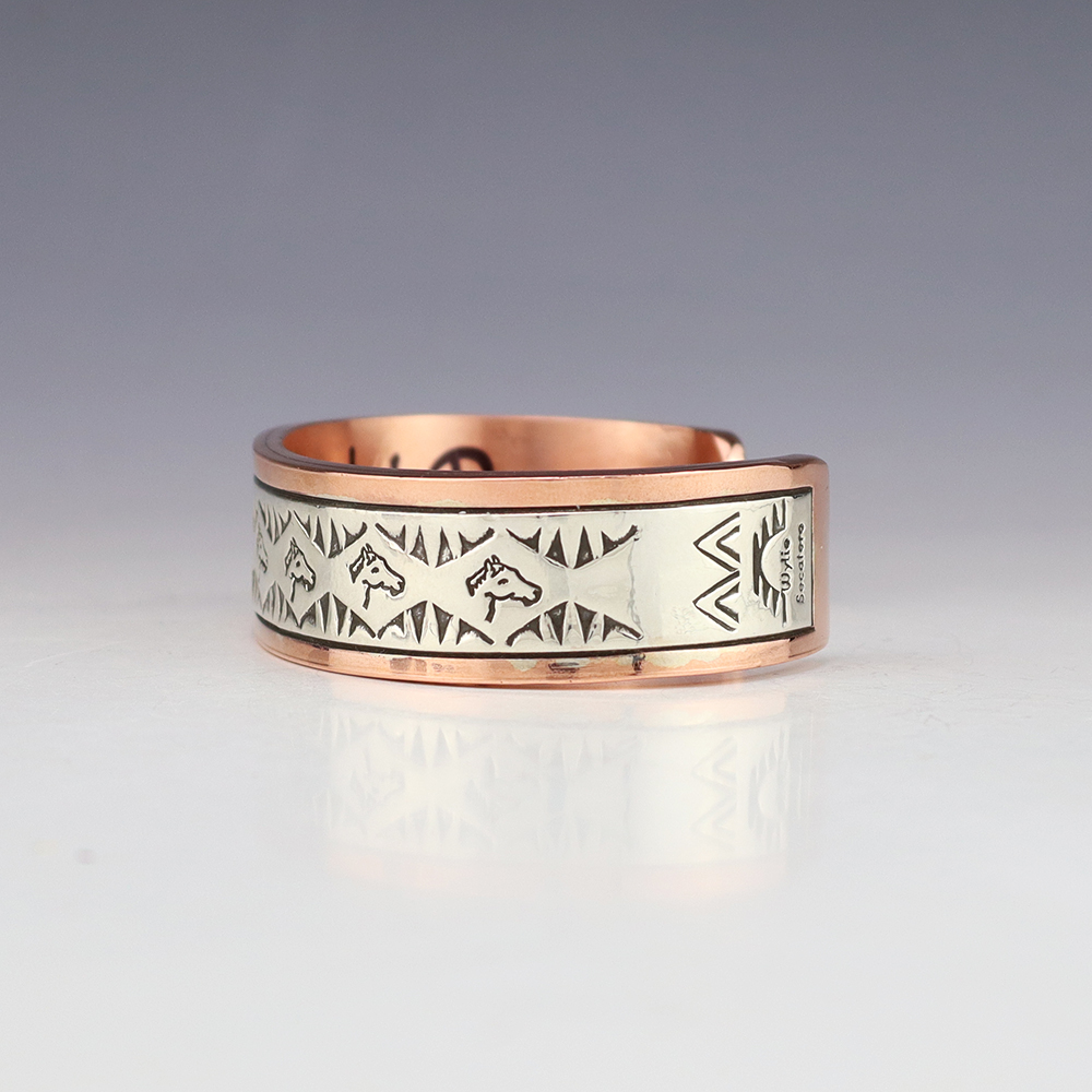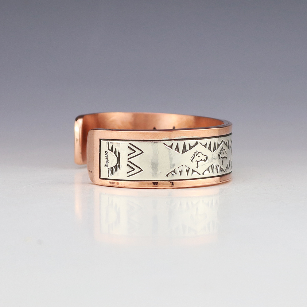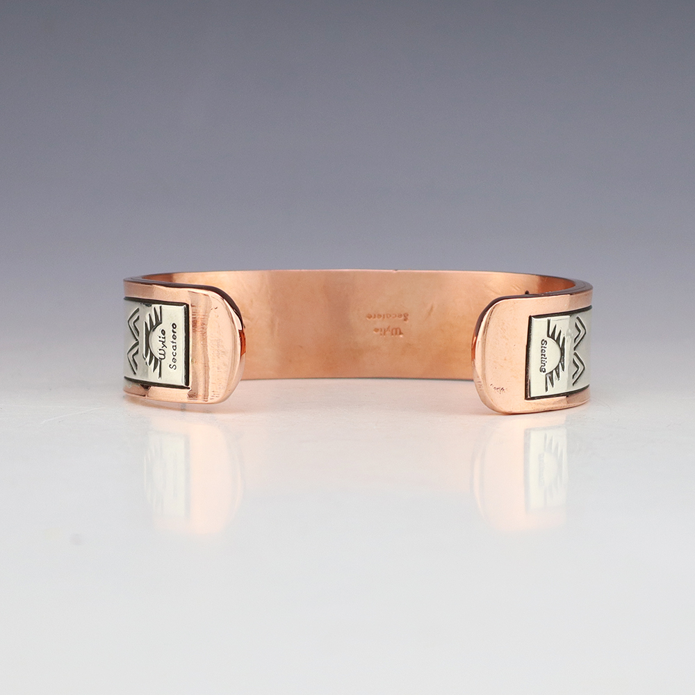 Navajo artist Wylie Secatero made this marvelous bracelet. Sterling silver and Copper with a traditional hand stamped design. Weighs 94 grams. The entire inner circumference is about 8”, including 1 1/2” opening. (Fits a 8″ wrist). Signed