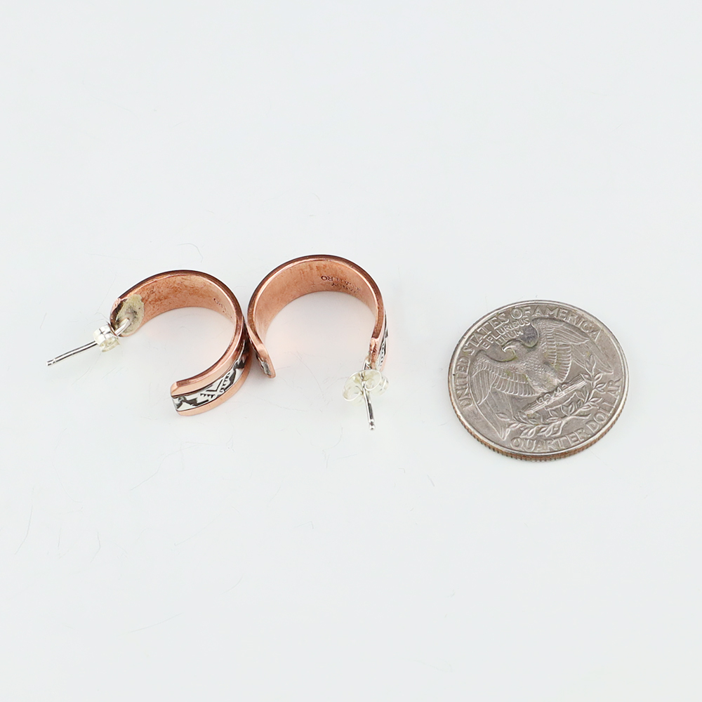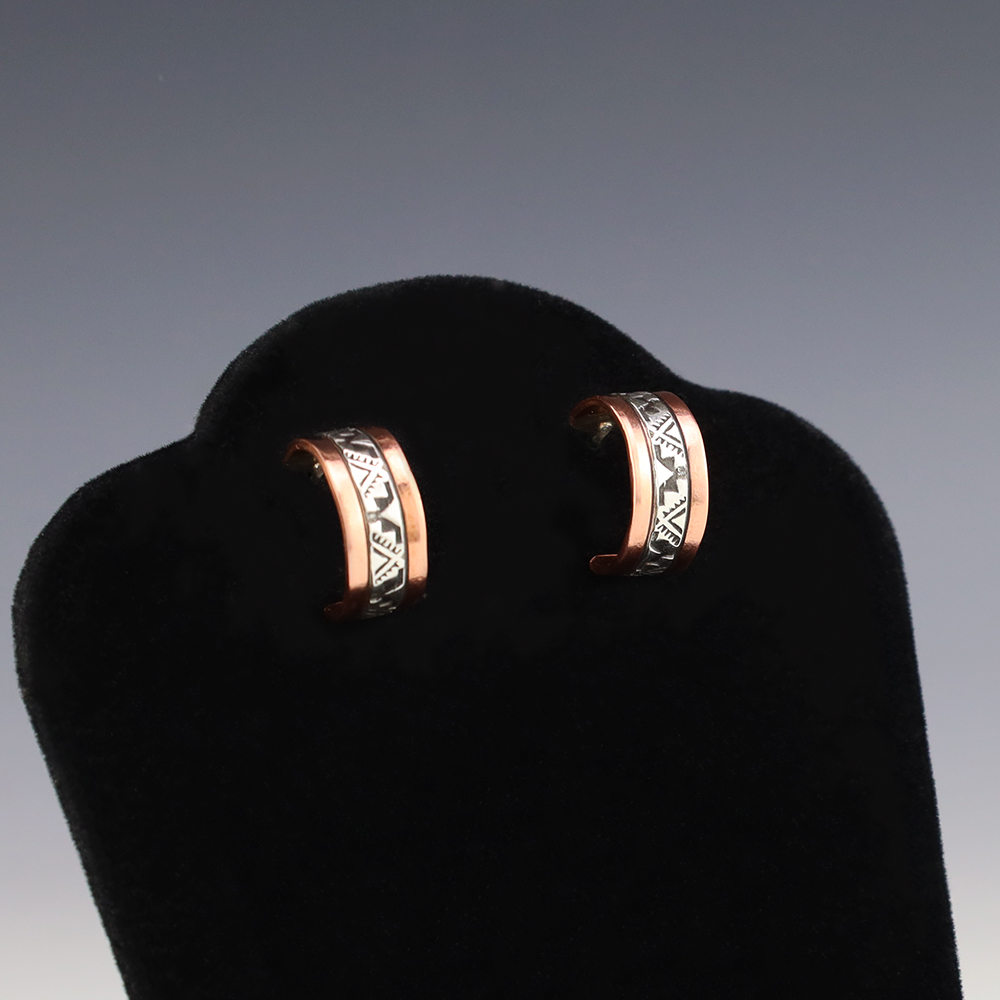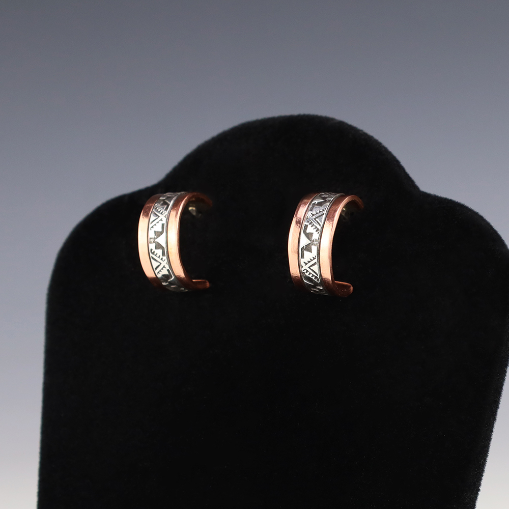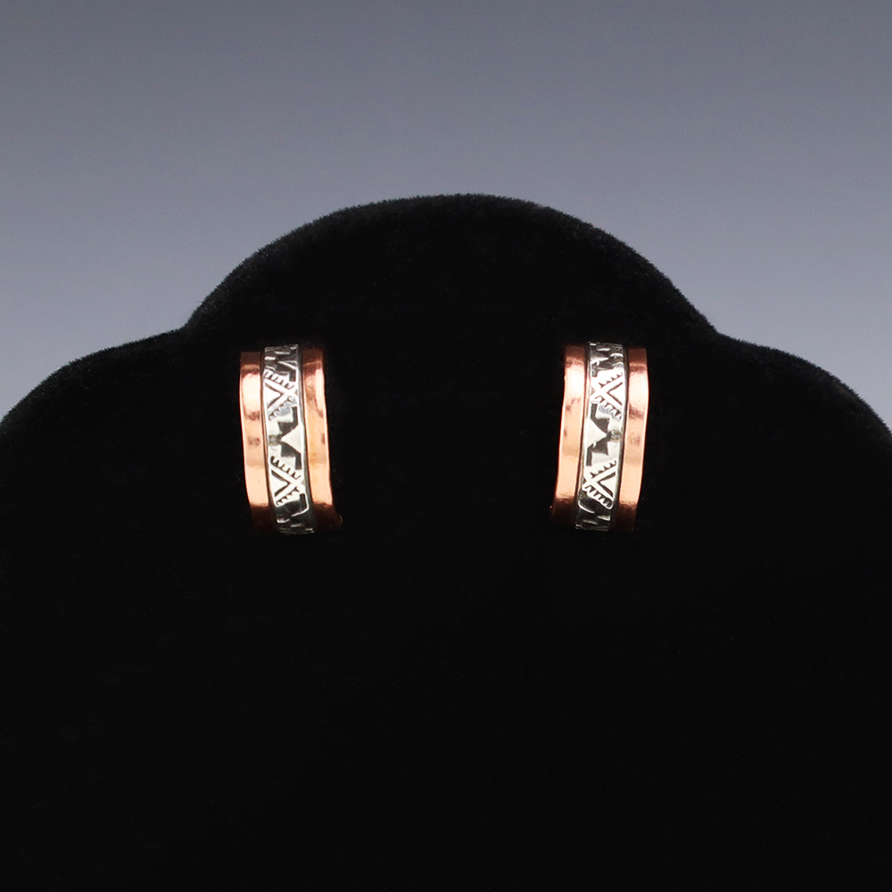 Navajo silversmith Randy Secatero made these lovely earrings out of sterling silver and copper. Great hand stamped design. These earrings will become a versatile accessory in your jewelry collection. Weighs 6 grams. Signed