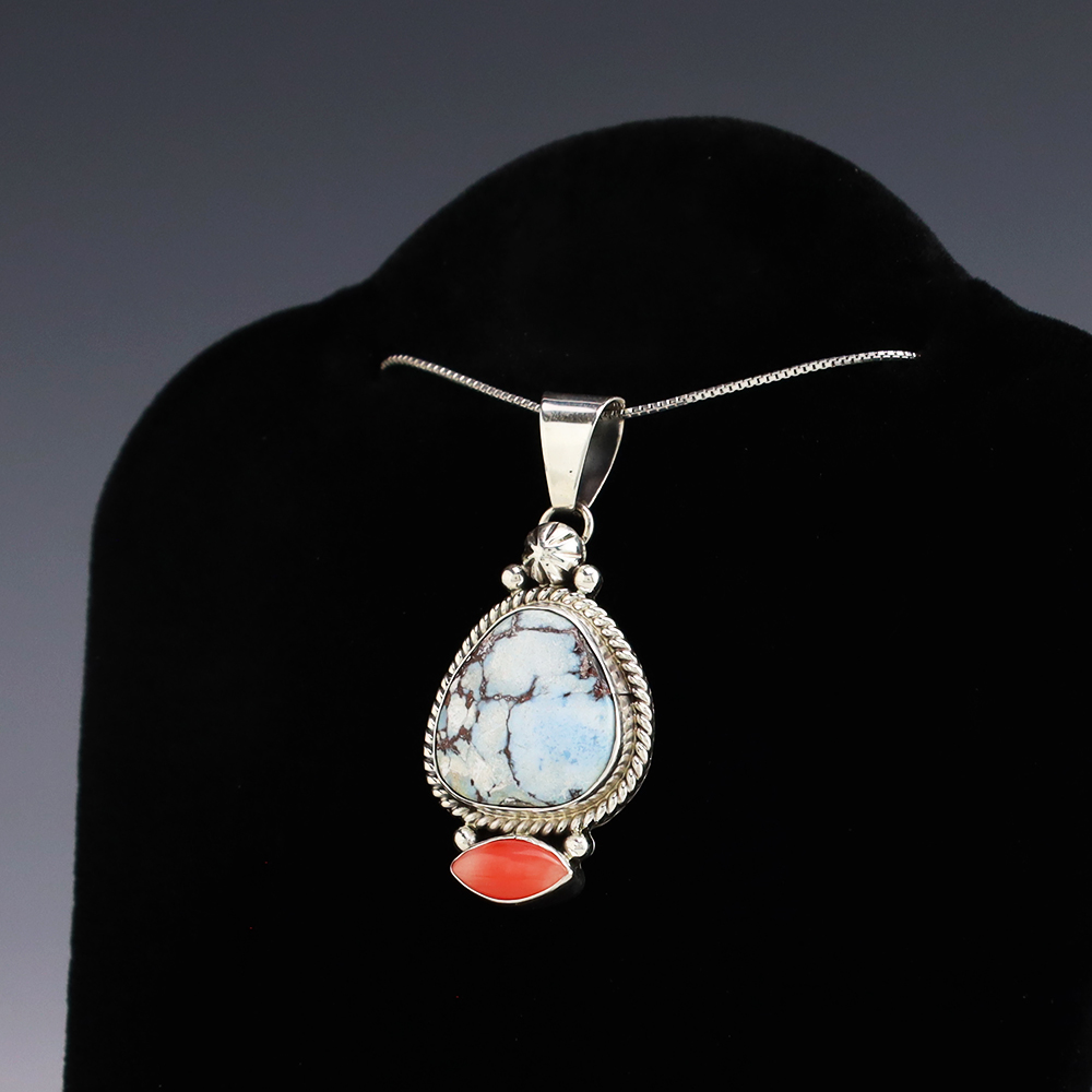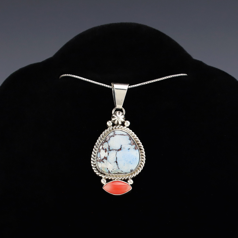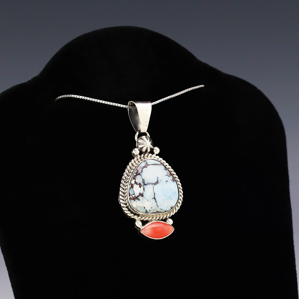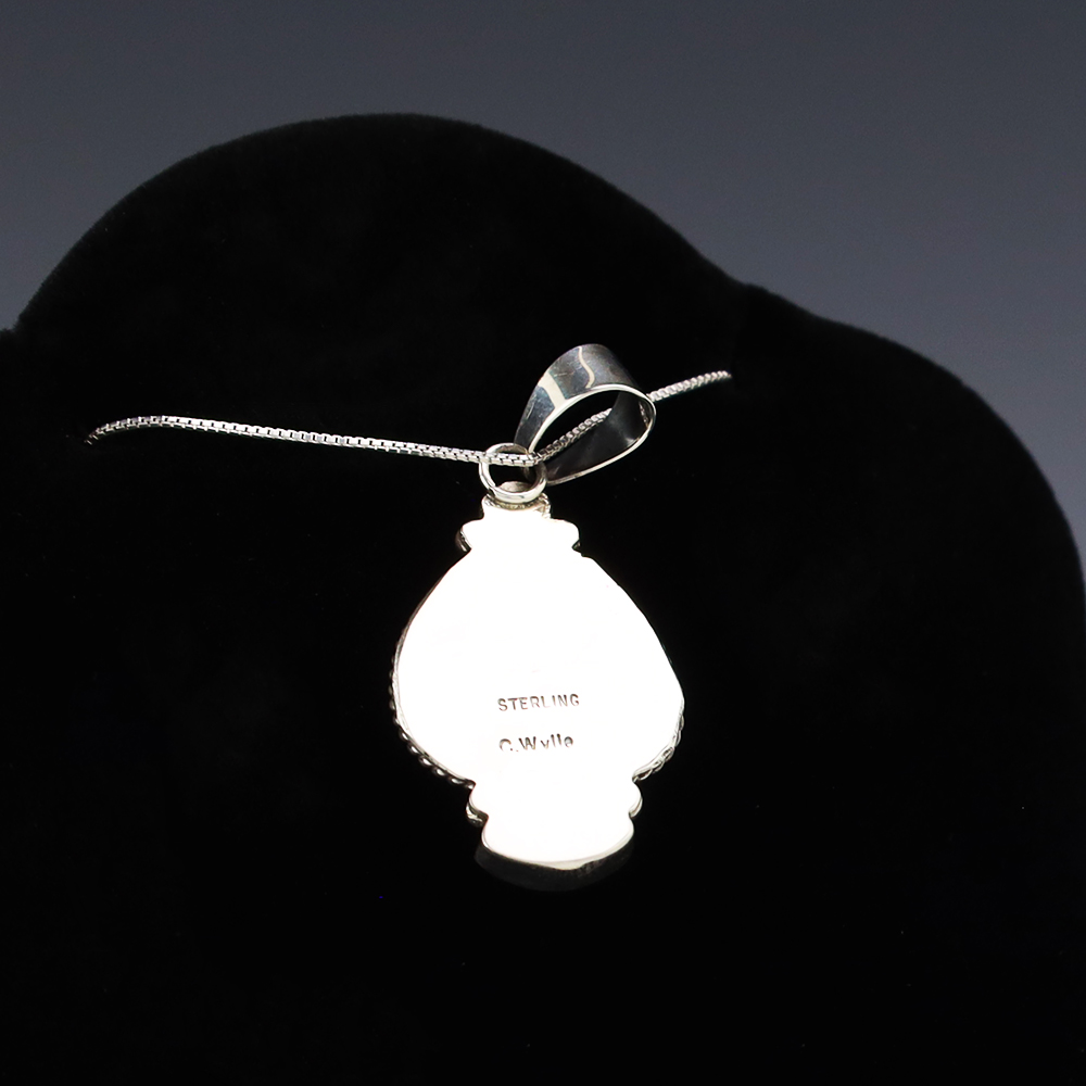 Lovely pendant hand made out of sterling silver, Coral, and Golden Hills Turquoise by Navajo artist Carol Wylie. A timeless beauty that you will enjoy for years to come. Weighs 8 grams. Signed (Chain not included)