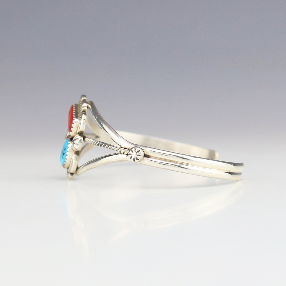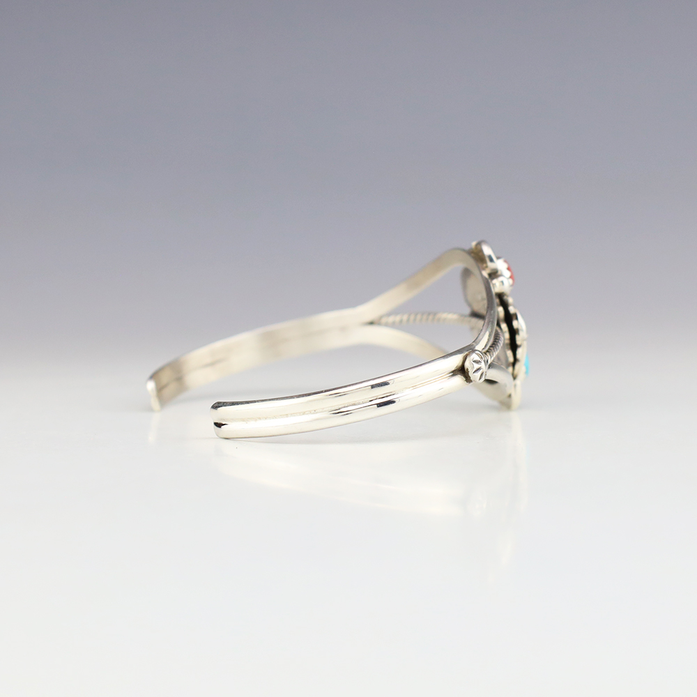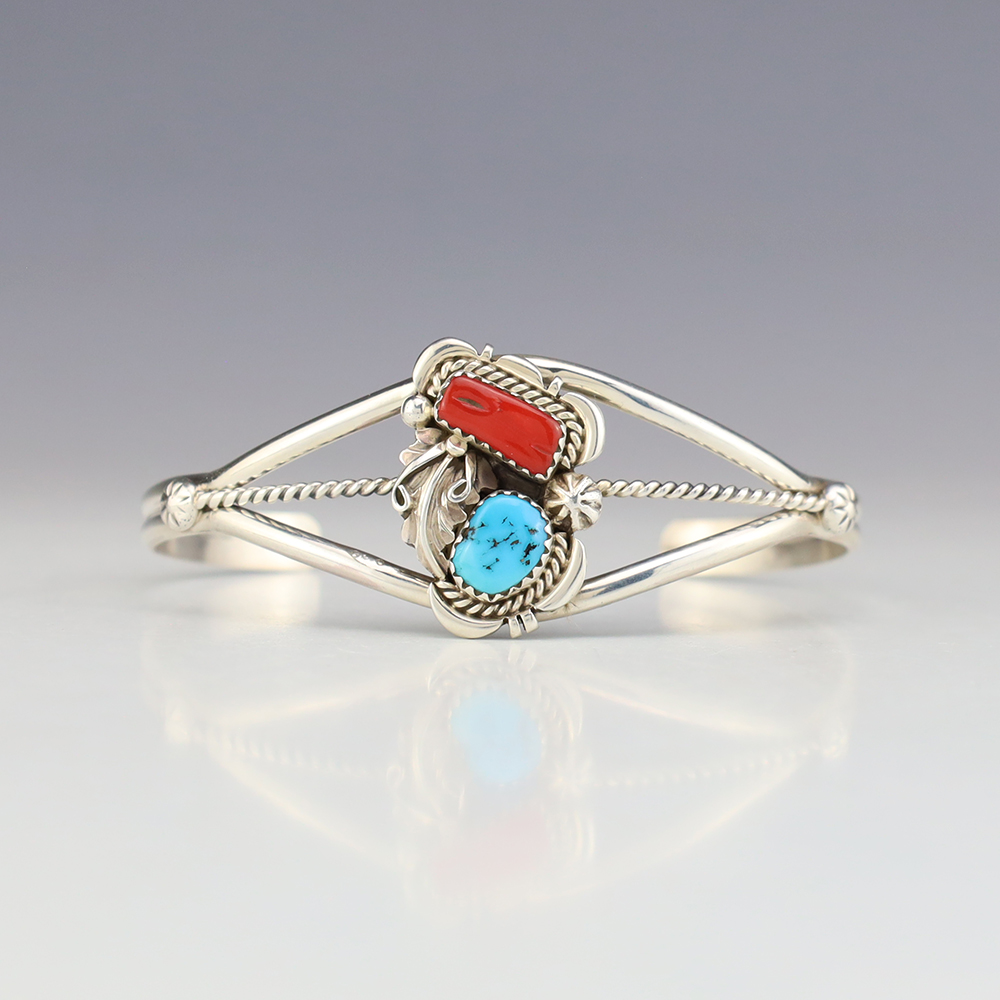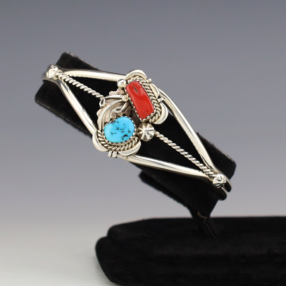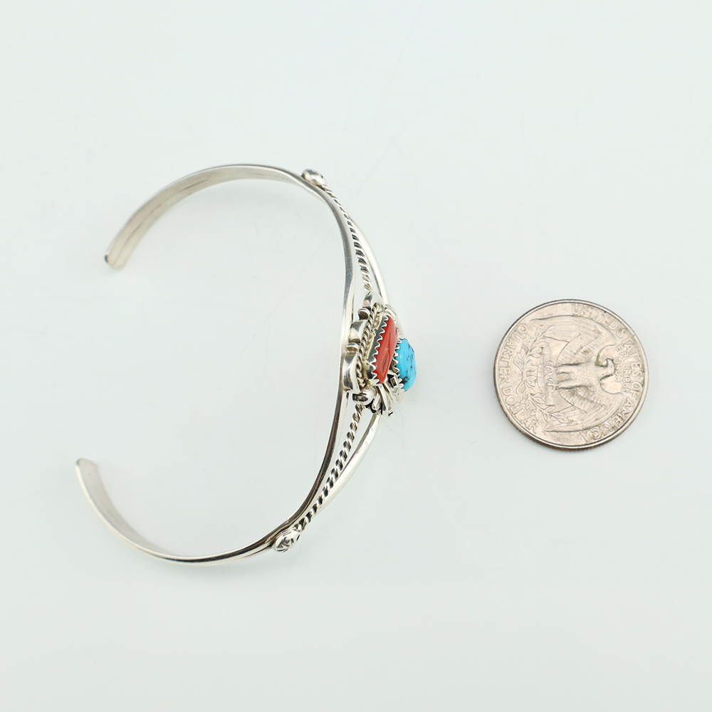 Lovely bracelet made out of sterling silver set with Turquoise and Coral stones. This beautiful bracelet will be a great addition to your Native American jewelry collection. Weighs 8 grams. Signed