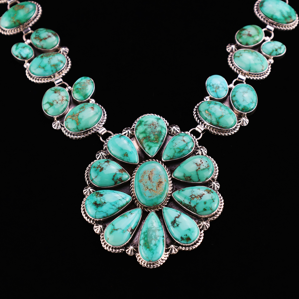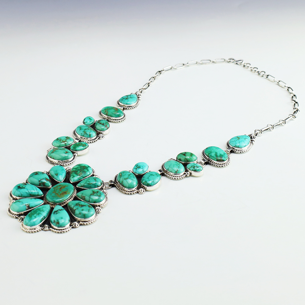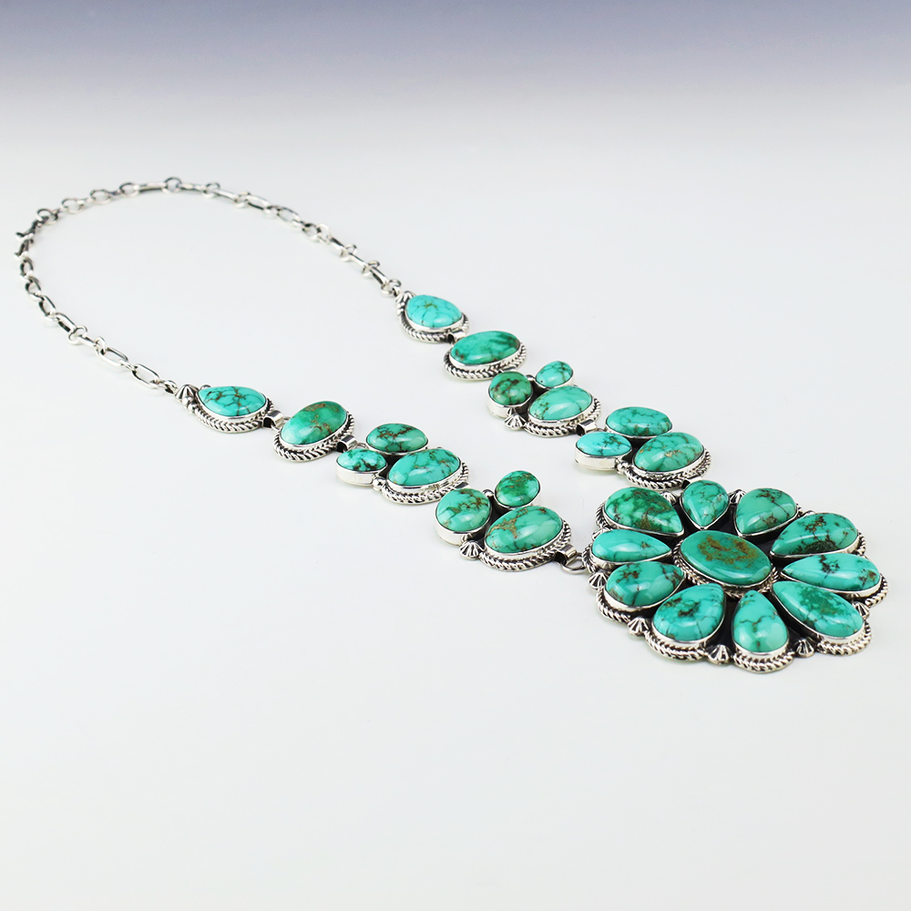 Navajo artist Della Wylie made this gorgeous necklace. Sterling silver with Emerald Valley Turquoise stones. This necklace will elevate your jewelry collection and is so versatile, it will look great with any outfit. Weighs 132 grams. Signed