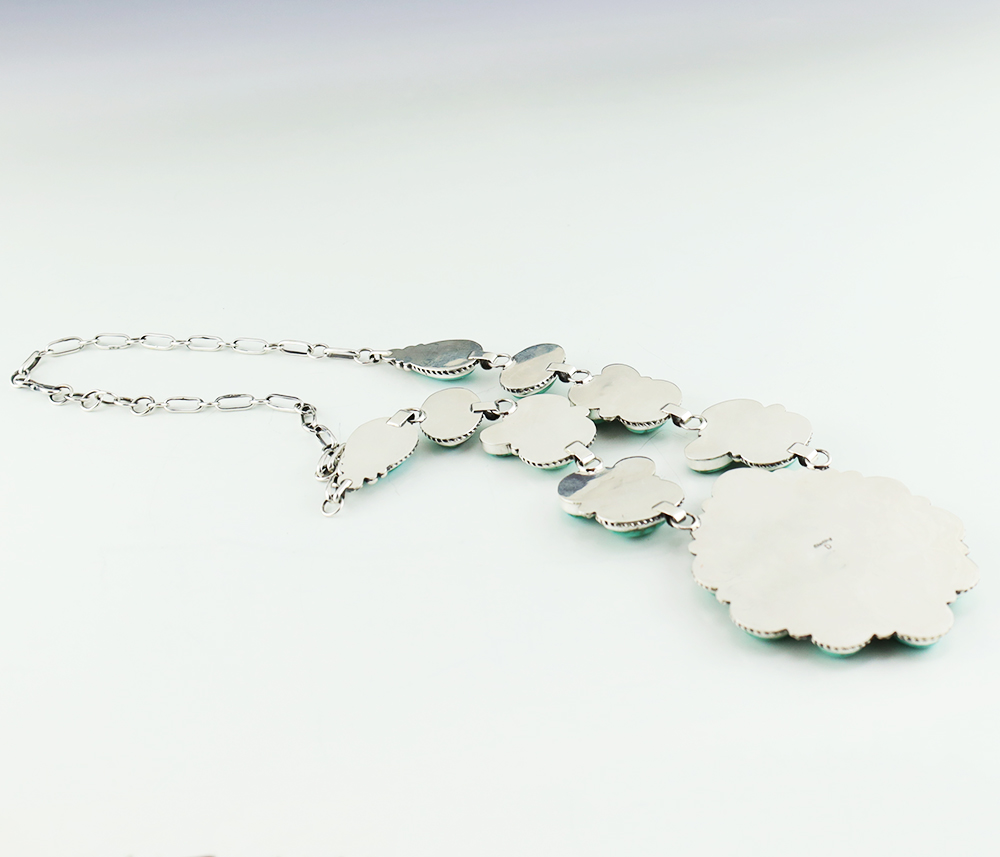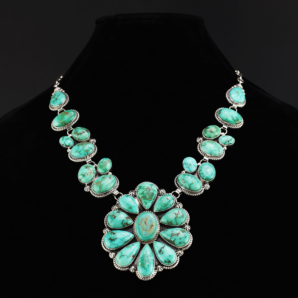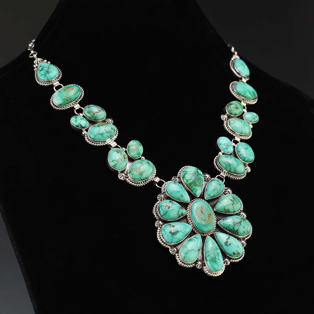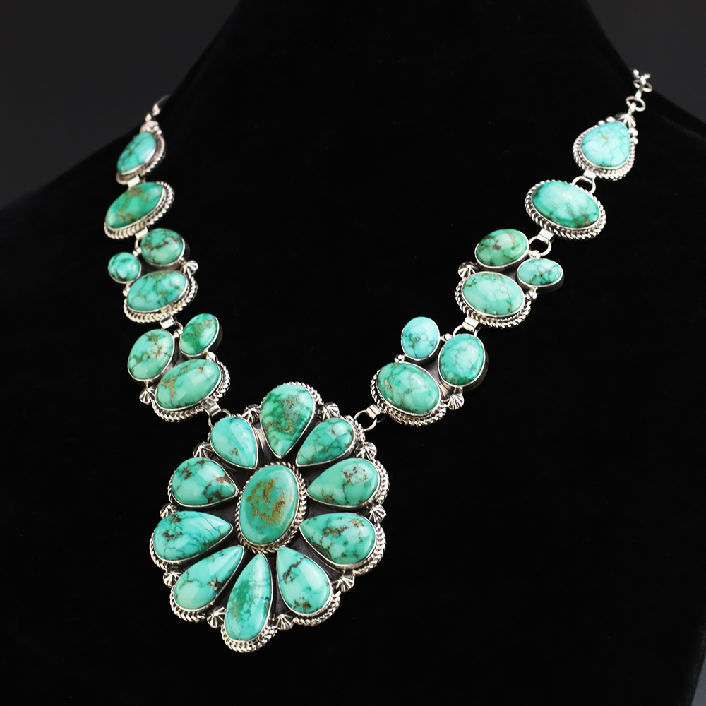 Navajo artist Della Wylie made this gorgeous necklace. Sterling silver with Emerald Valley Turquoise stones. This necklace will elevate your jewelry collection and is so versatile, it will look great with any outfit. Weighs 132 grams. Signed