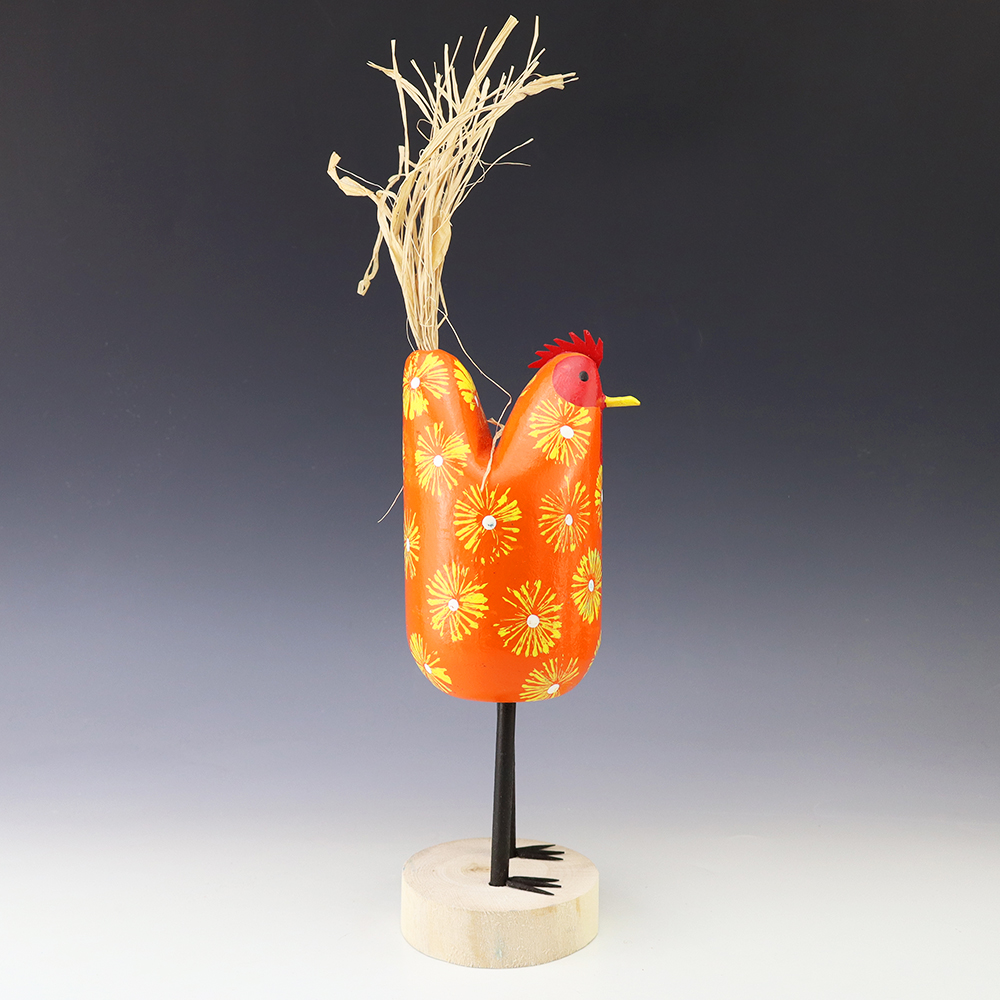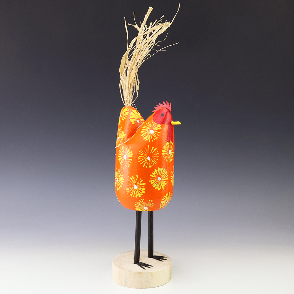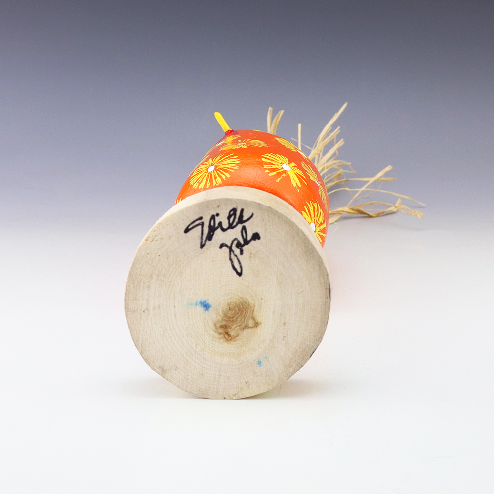 Edith John is the daughter of the late Woody Herbert who was known for his folk art Brahma bulls. Edith started carving while helping her father. Edith’s folk art chickens elicit happiness wherever they roost! Bold colors and patterns, that will brighten your Navajo folk art collection. Hand carved out of wood with a straw tail. Signed