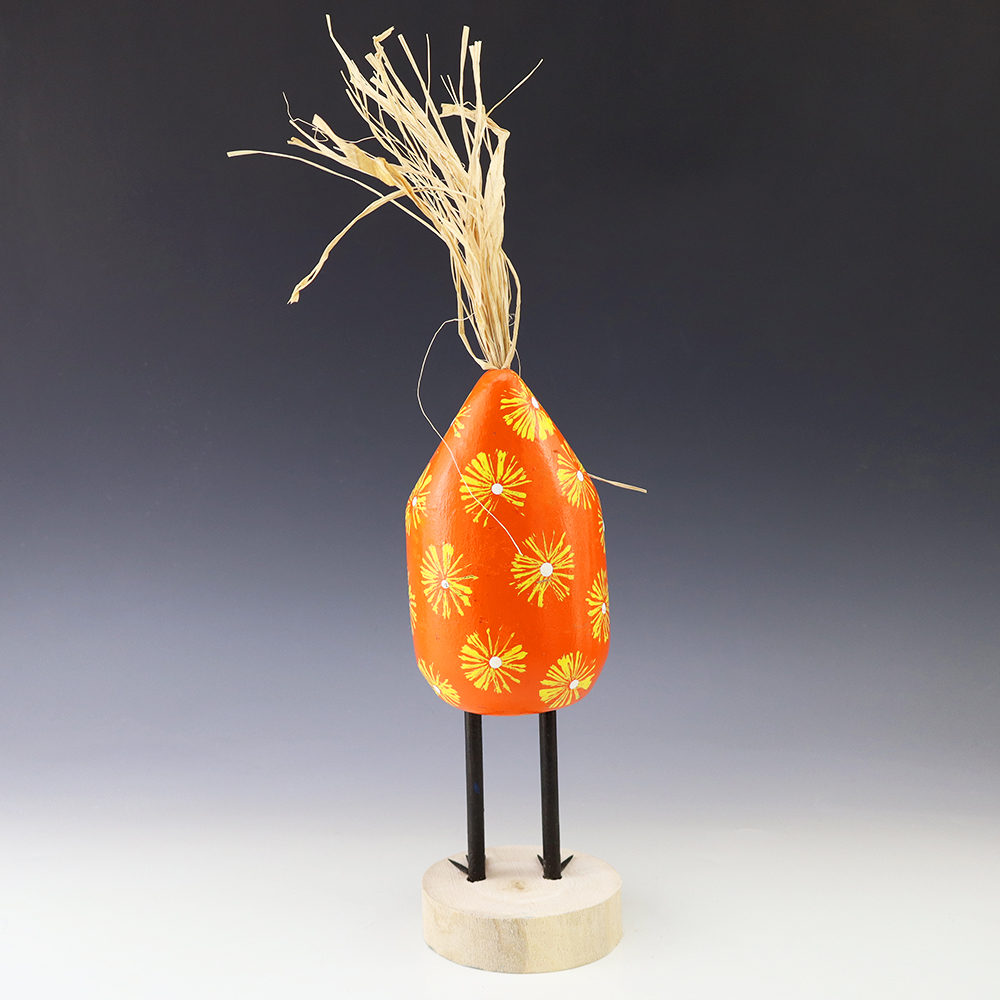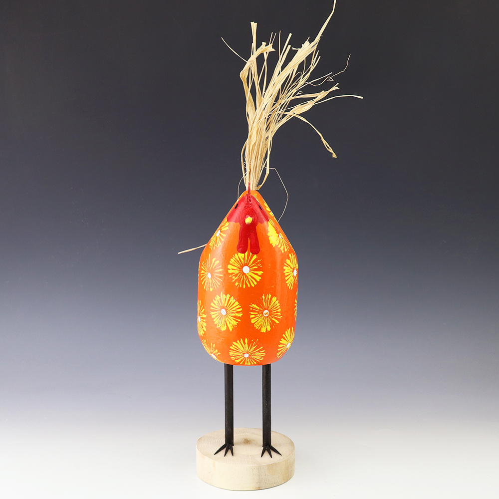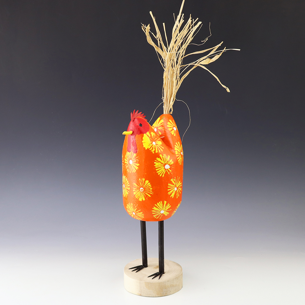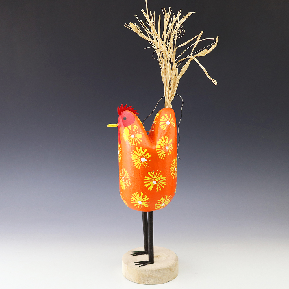 Edith John is the daughter of the late Woody Herbert who was known for his folk art Brahma bulls. Edith started carving while helping her father. Edith’s folk art chickens elicit happiness wherever they roost! Bold colors and patterns, that will brighten your Navajo folk art collection. Hand carved out of wood with a straw tail. Signed