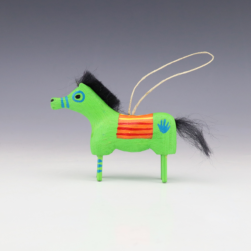 Bold colors and patterns, that will brighten your Navajo folk art collection. Hand carved out of wood with a straw tail by Navajo artist Candie John. Signed 9 3/8” tall x 2 7/8” long x 2 1/2” wide (height is to top of straw tail) Artist card included In recent...