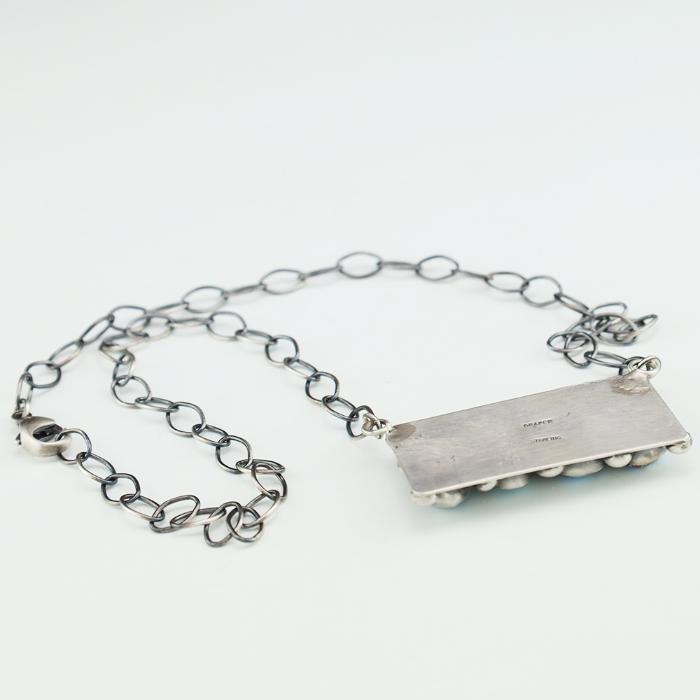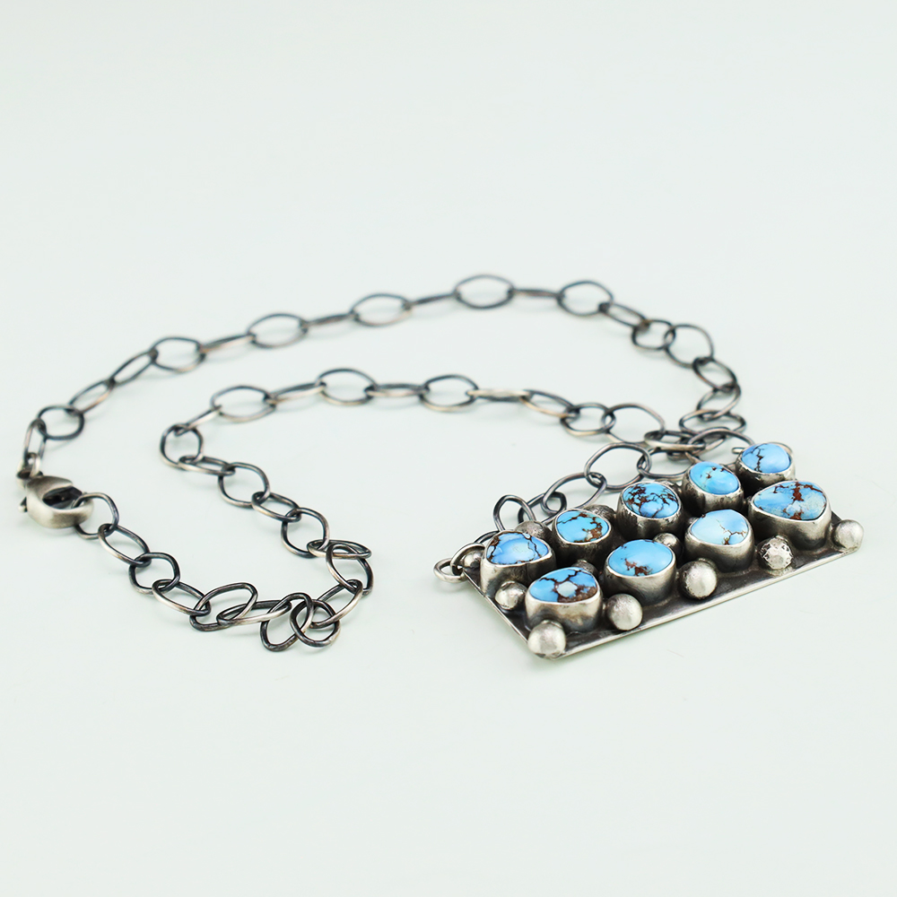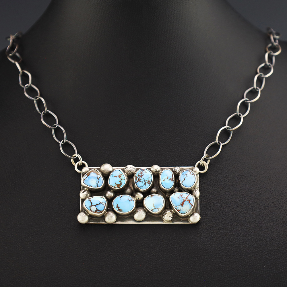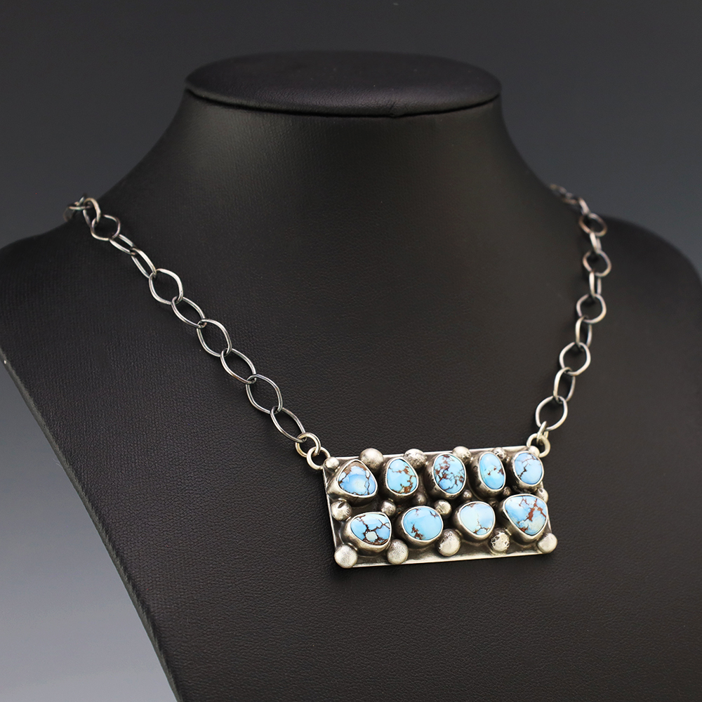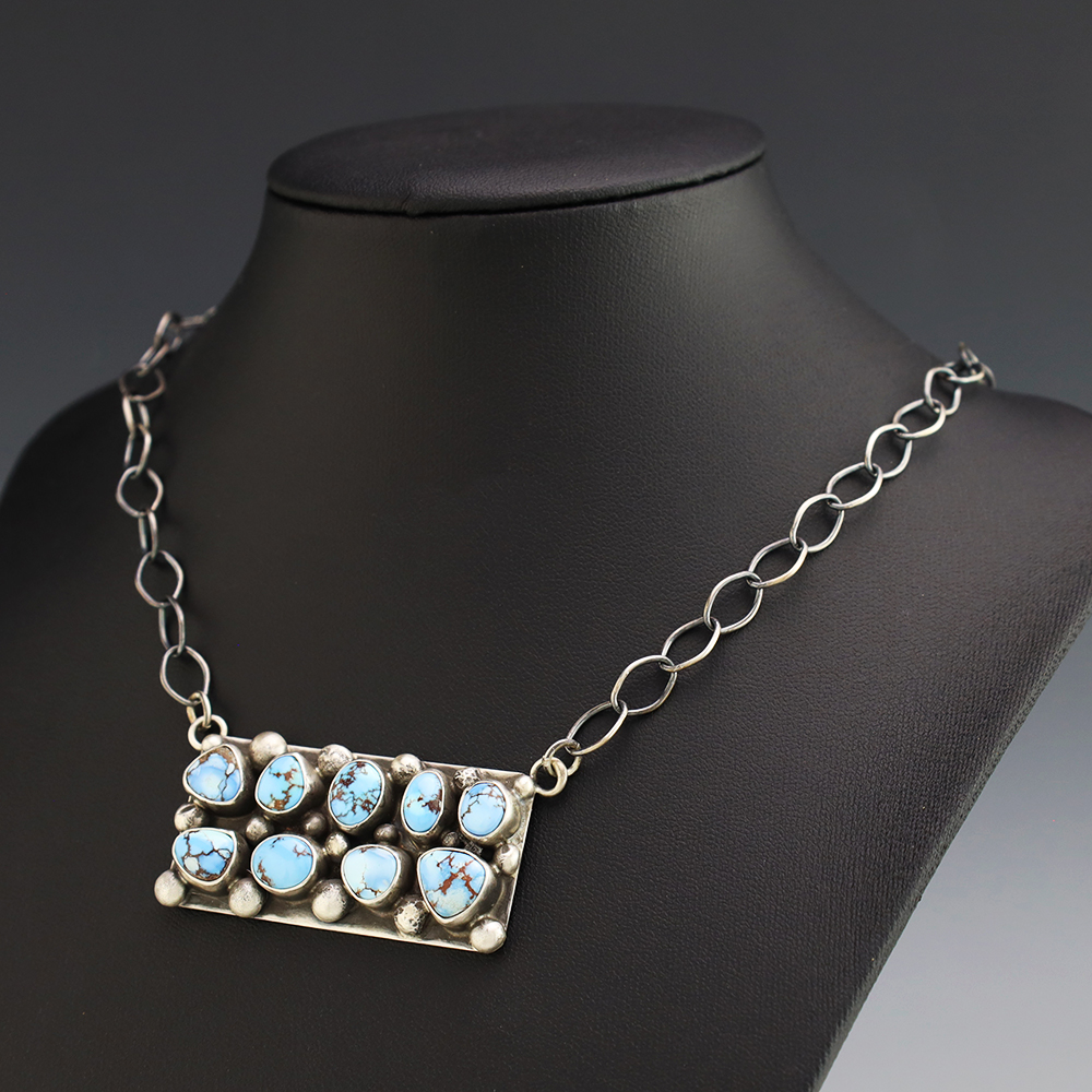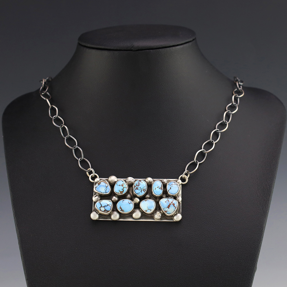 Navajo artist Joelias Draper made this beautiful necklace. Sterling silver with Golden Hills Turquoise stones. This necklace will elevate your jewelry collection and is so versatile, it will look great with any outfit. Weighs 32 grams. Signed