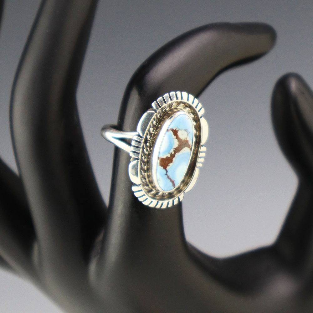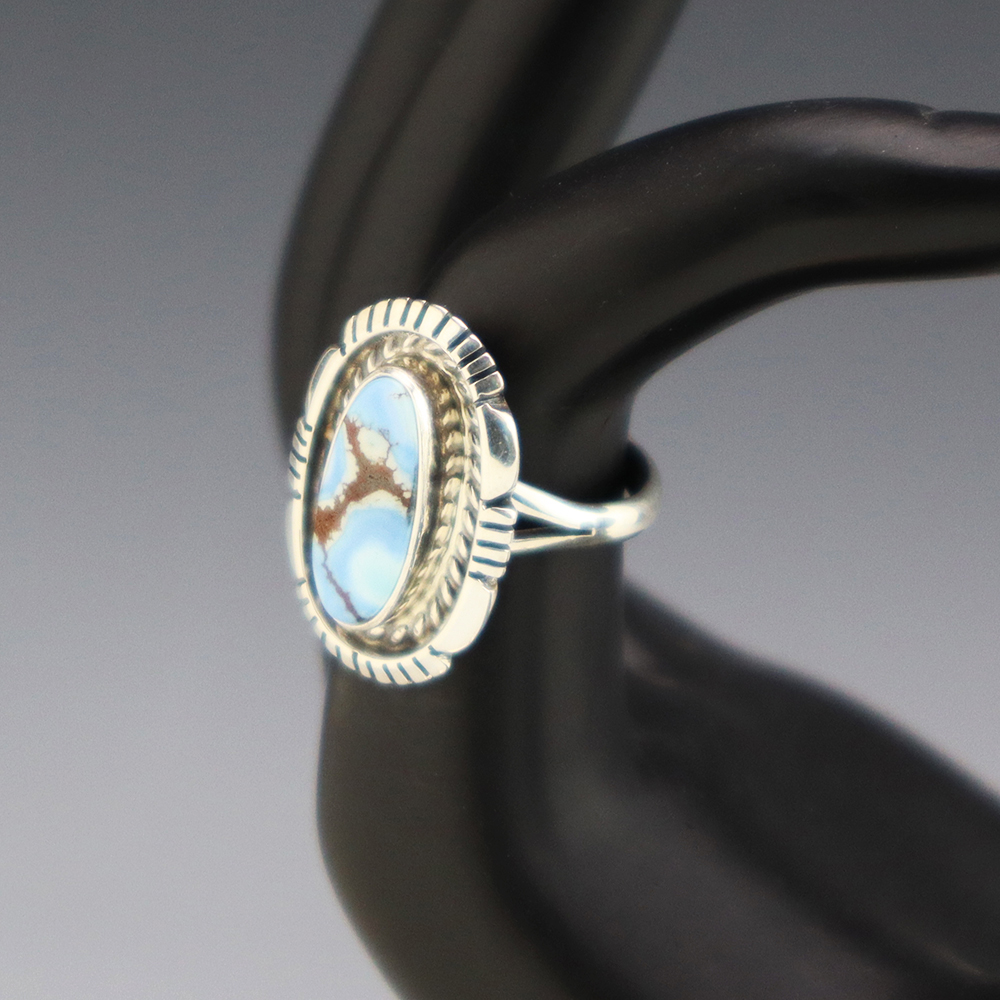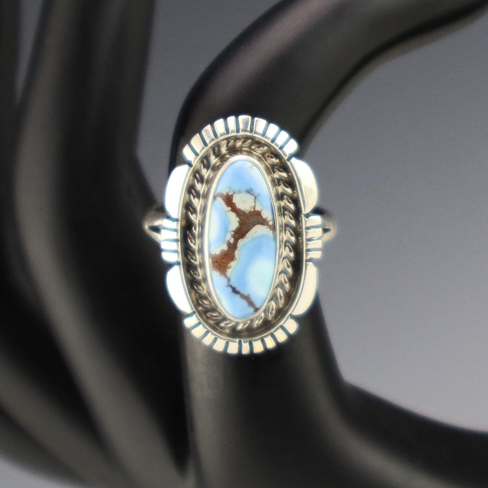 This ring is a great representation of hand made Navajo jewelry and will make a statement on your hand. A beautiful piece of Golden Hills Turquoise is set into a sterling silver setting. Hand made by Navajo silversmith Norvin Johnson. Weighs 6 grams. Size 6 3/4. Signed