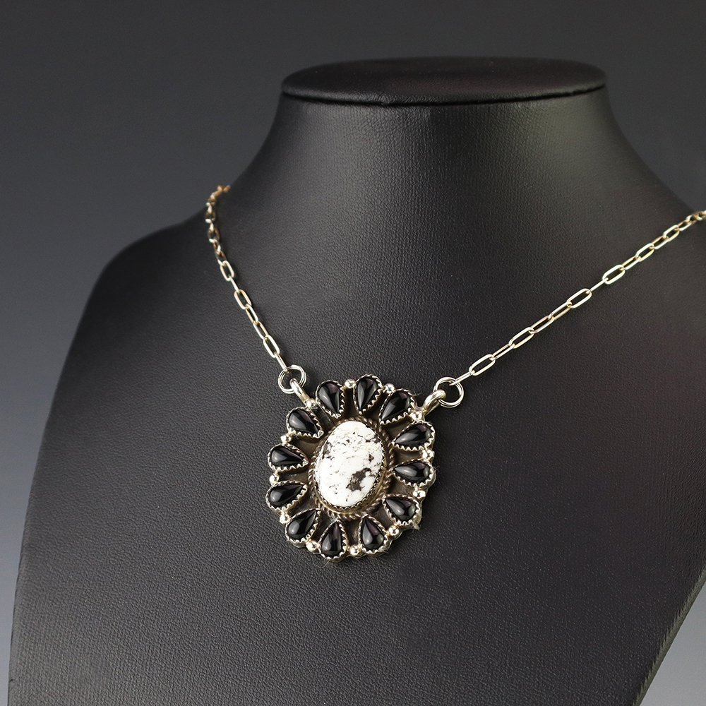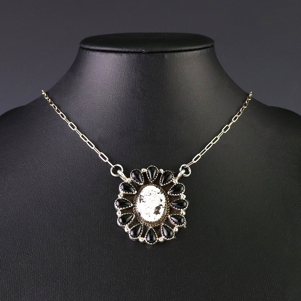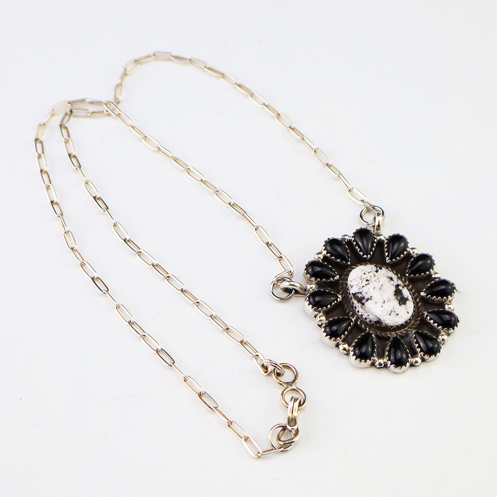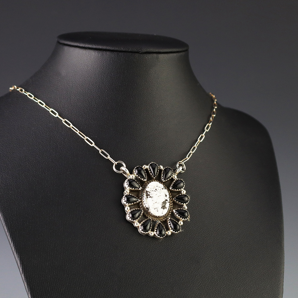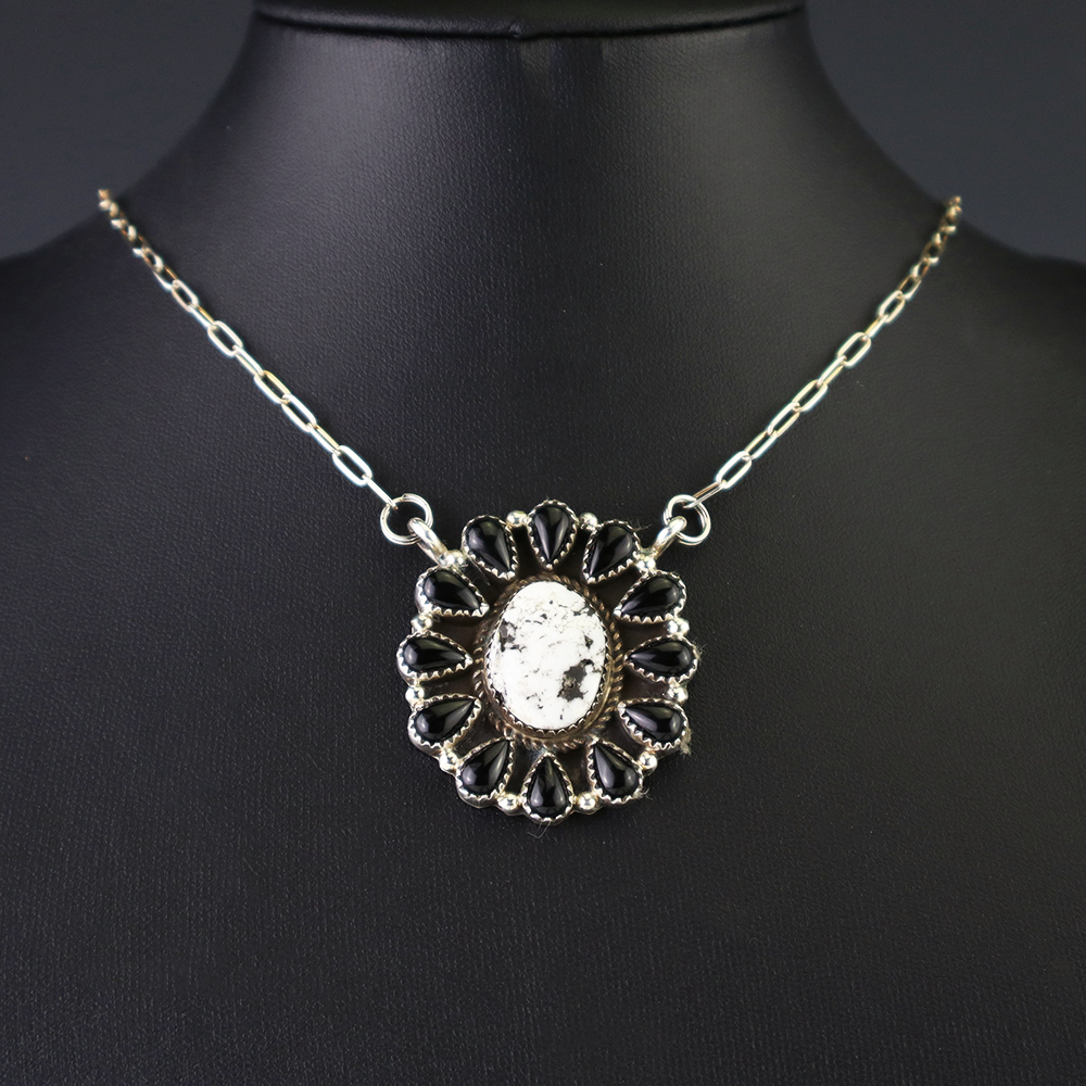 Navajo artist Geraldine James made this beautiful necklace. Sterling silver with White Buffalo and Onyx stones. This necklace will elevate your jewelry collection and is so versatile, it will look great with any outfit. Weighs 16 grams. Signed