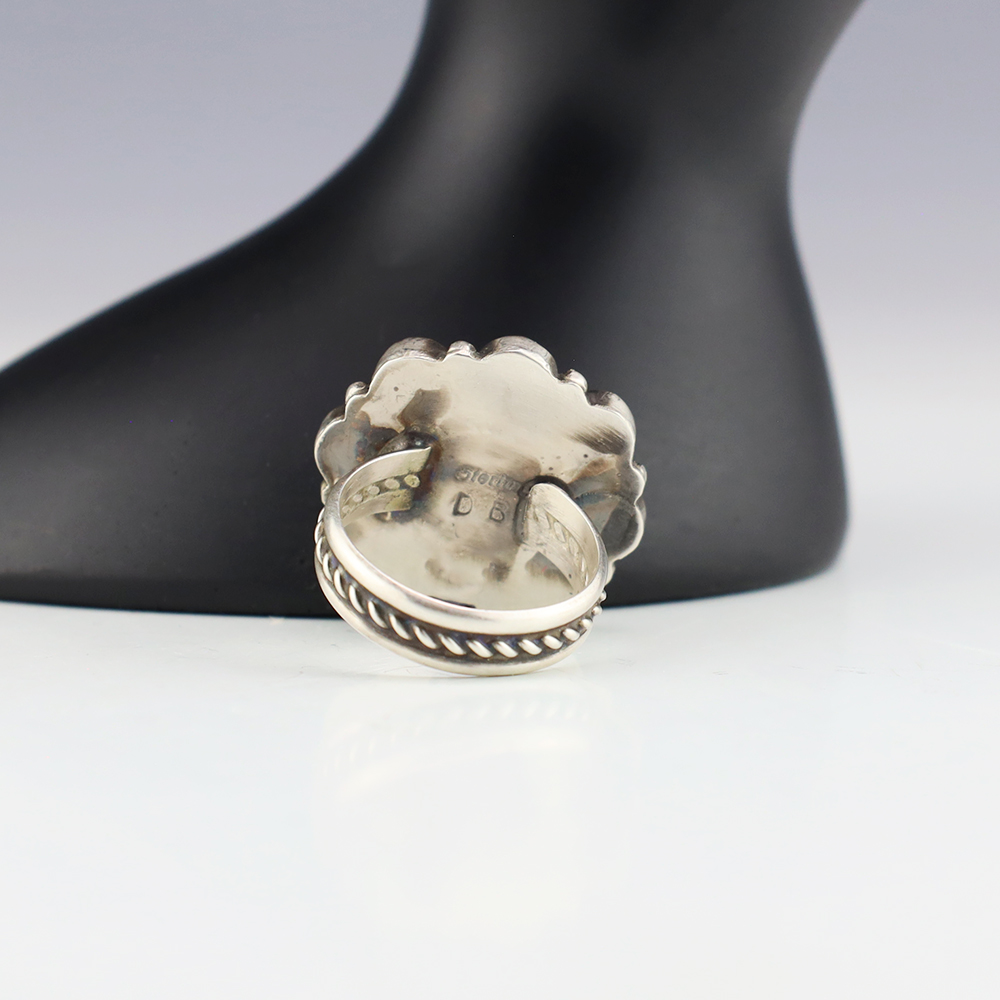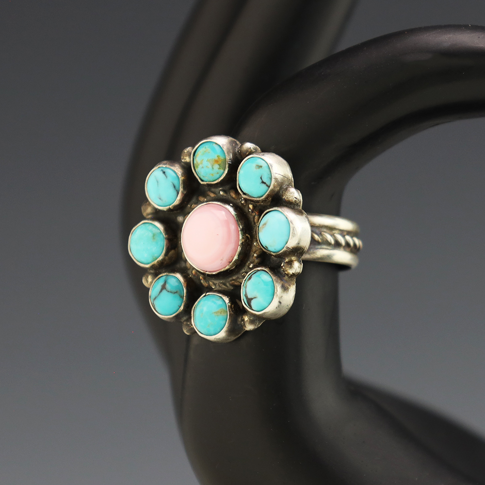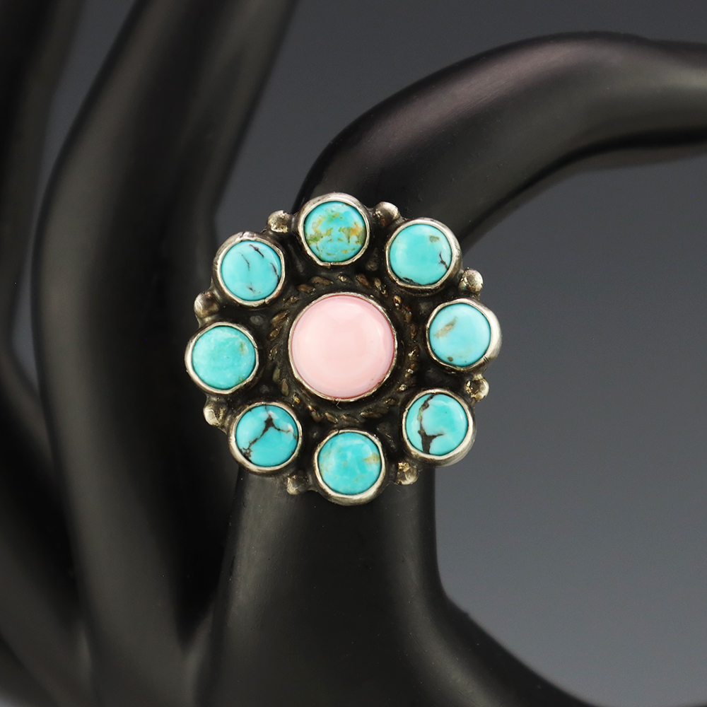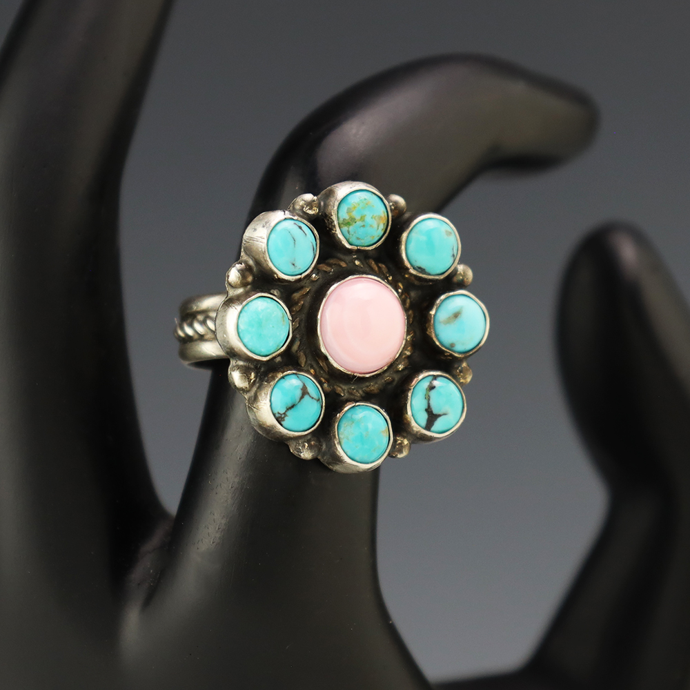 This ring is a great representation of hand made Navajo jewelry and will make a statement on your hand. Beautiful pieces of Turquoise and Pink Conch are set into a sterling silver setting. Hand made by Navajo artist Devin Brown. Weighs 8 grams. Size 7 1/2 and slightly adjustable. Signed
