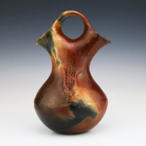 Navajo potter Antionette Sherman hand crafted this magnificent pottery vase. Amazing colors! The prepared cast clay pot is hand etched with a bear and geometric designs. Then the vase is hand painted and kiln fired. Signed 6 1/2″ x 5 1/2″ x 5 1/2″ Artist card included Although Navajo potters...