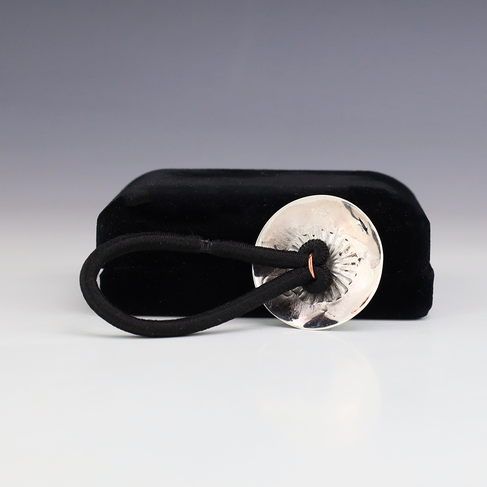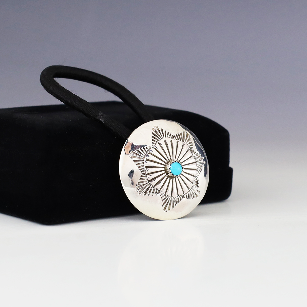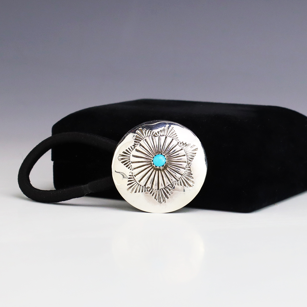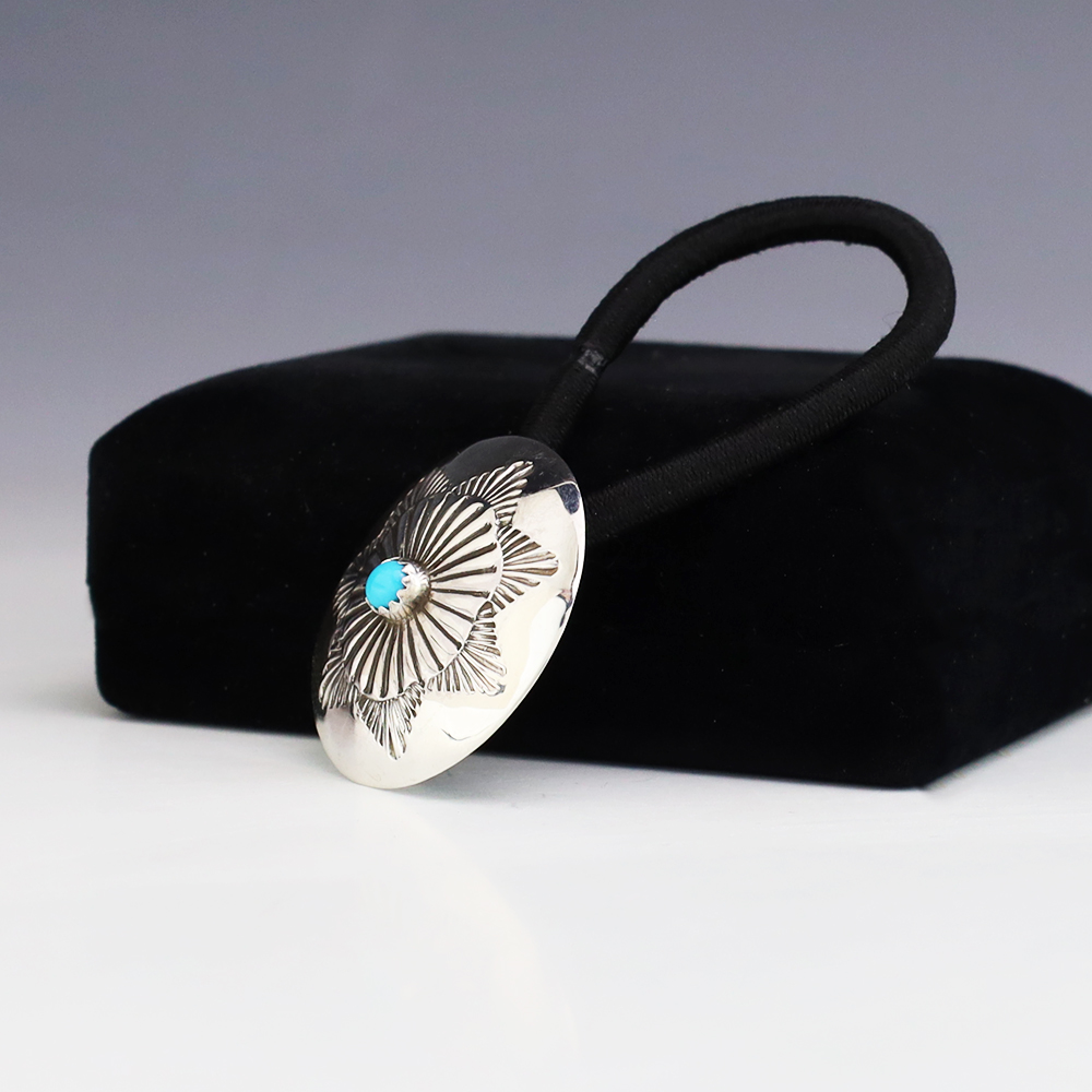 Great design! This ponytail holder is sterling silver with a Turquoise stone. Navajo barrettes and ponytail holders look absolutely amazing in your hair. Weighs 4 grams.