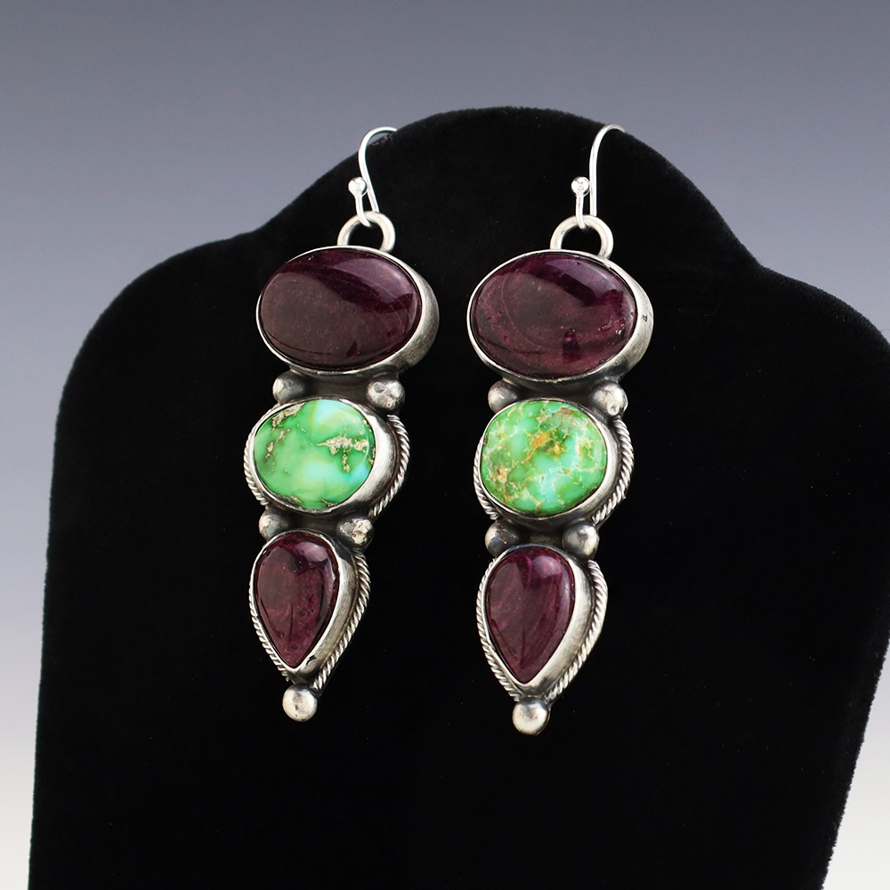 Lovely earrings hand made out of sterling silver, Spiny Oyster, and Sonoran Gold Turquoise. Hand made by Navajo silversmith Danny Henio. These fabulous earrings will become a versatile accessory in your jewelry collection. Weighs 22 grams. Signed.