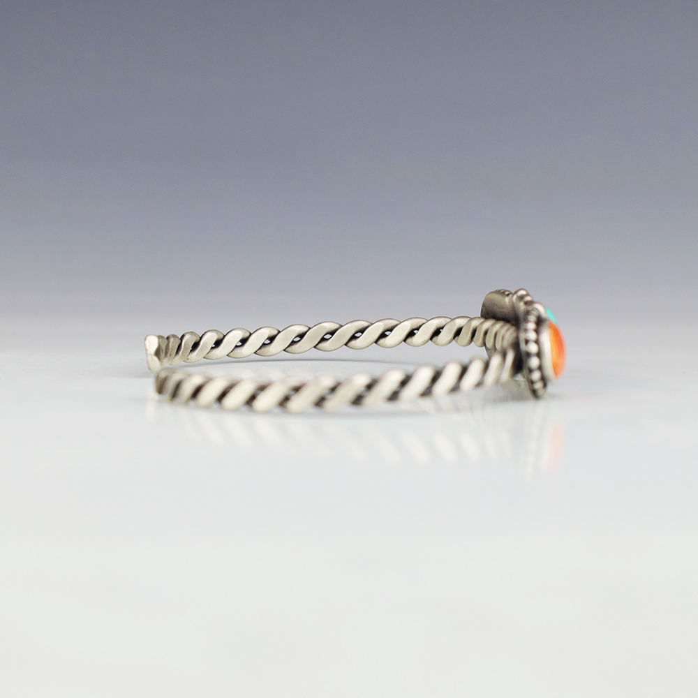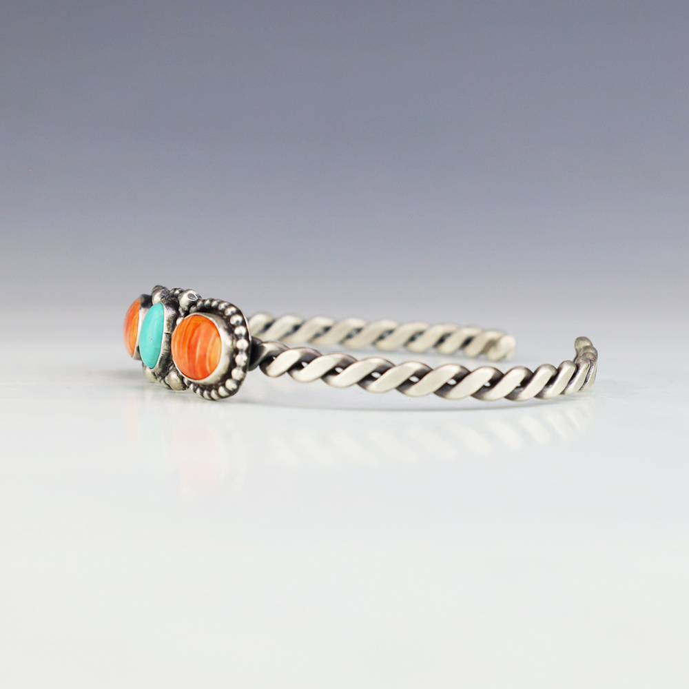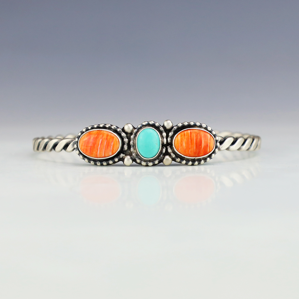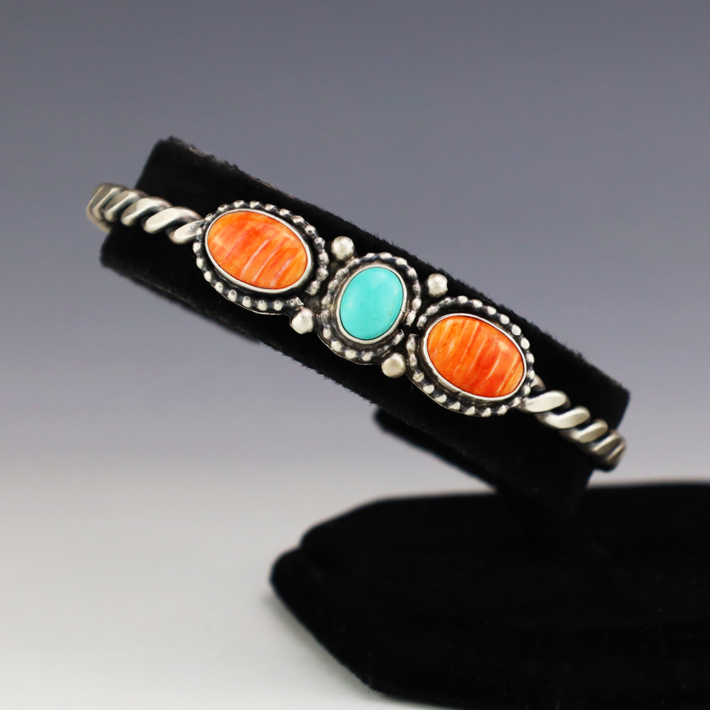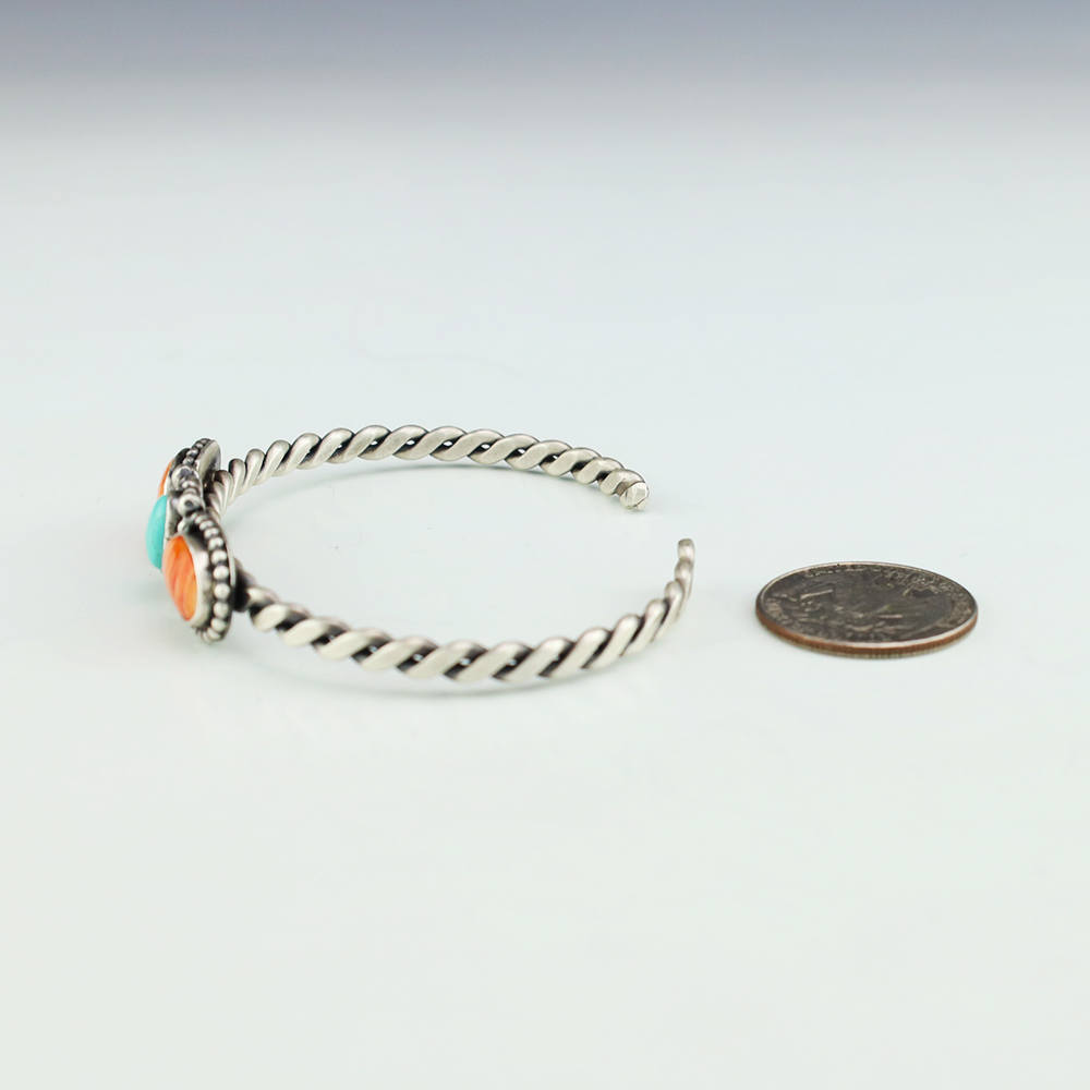 Gorgeous bracelet out of sterling silver and set it with Spiny Oyster and Turquoise stones. Weighs 18 grams. The entire inner circumference is about 7 5/8”, including 1” opening. (Fits a 7 5/8″ wrist) Signed