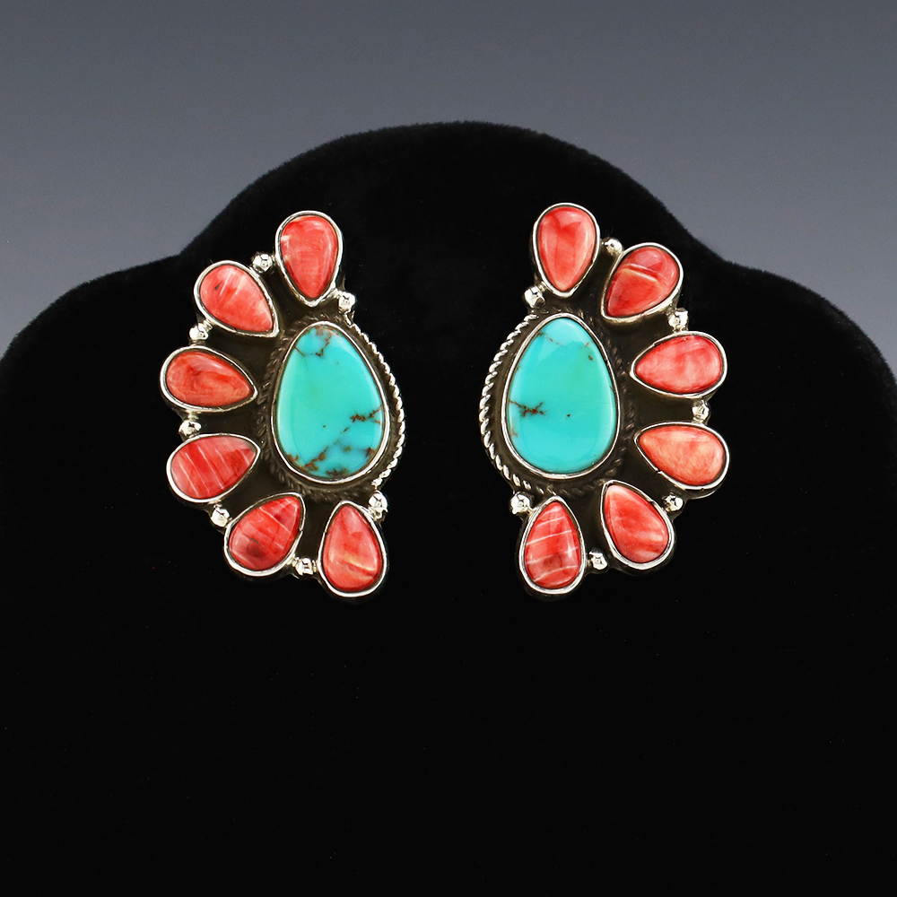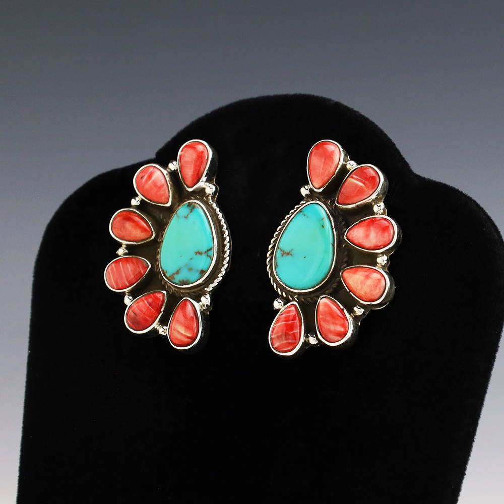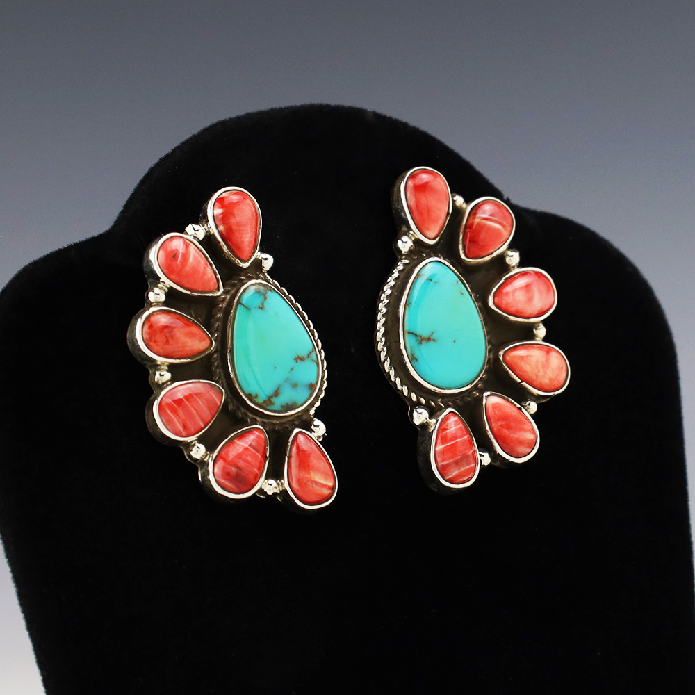 Gorgeous earrings hand made out of sterling silver, Turquoise, and Spiny Oyster by Navajo silversmith Geraldine James. These wonderful earrings will become a versatile accessory in your jewelry collection. Weighs 20 grams. Signed
