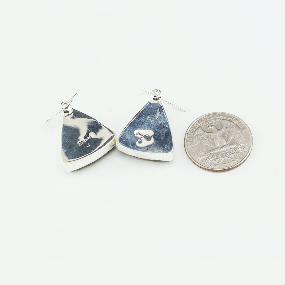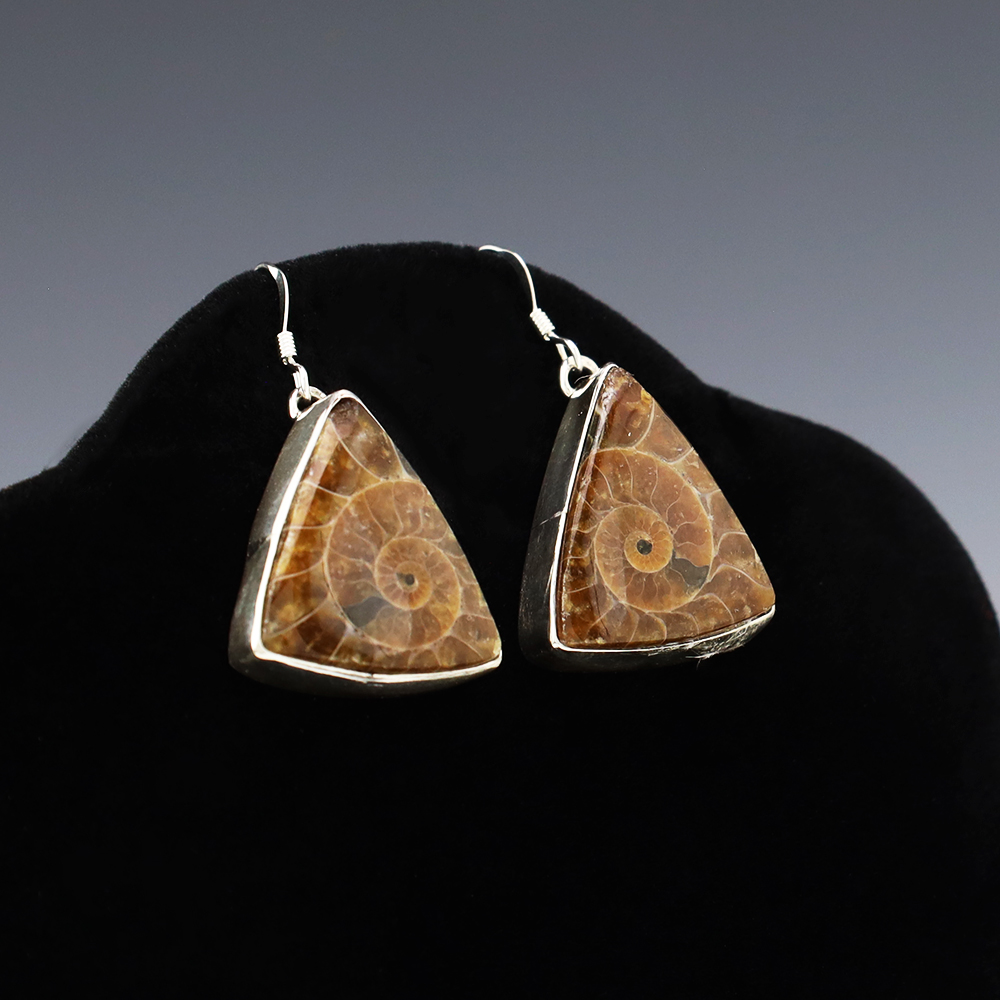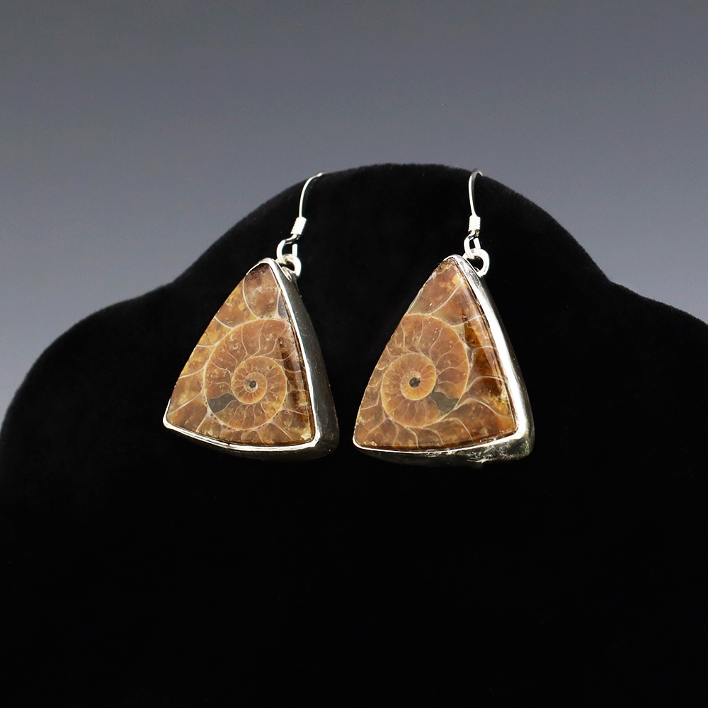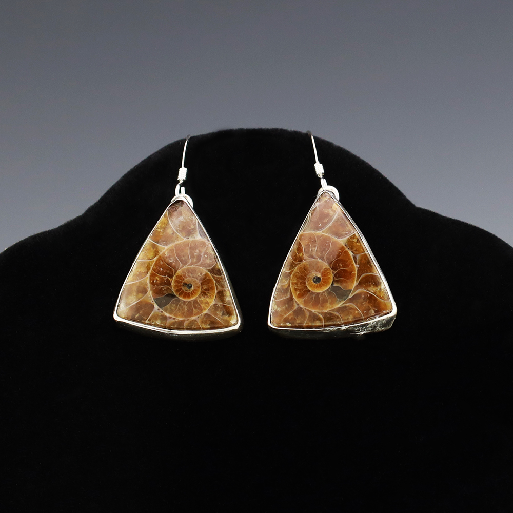 Lovely earrings made out of sterling silver and set with Ammonites. These fabulous earrings will become a versatile accessory in your jewelry collection. Weighs 10 grams. Signed.
