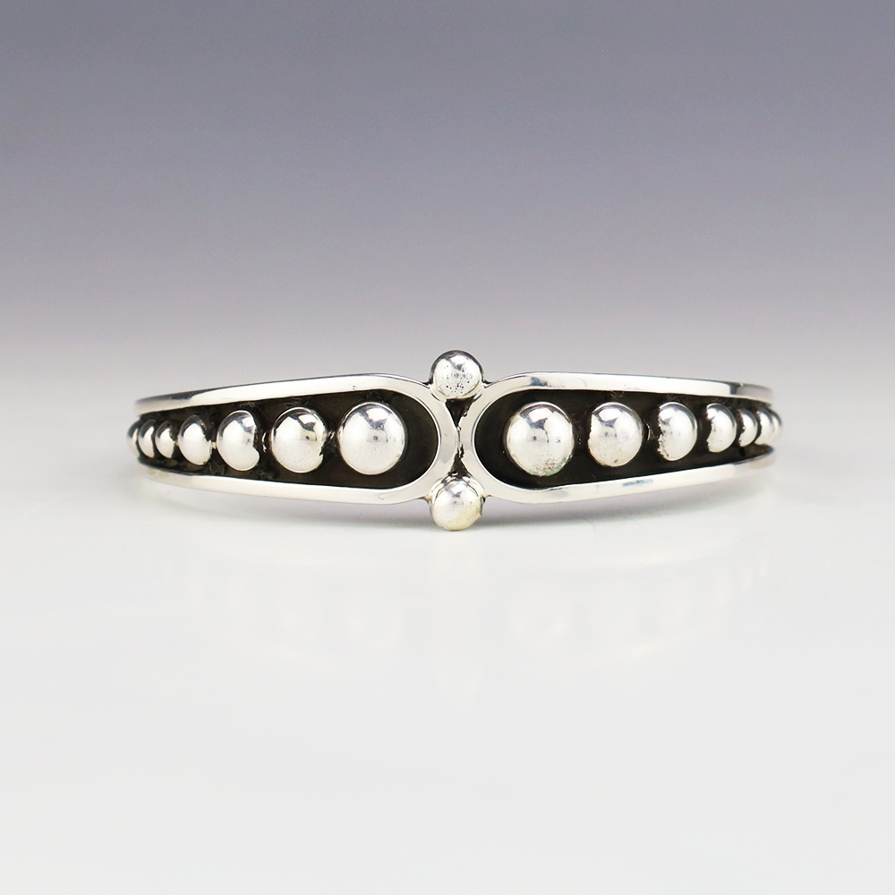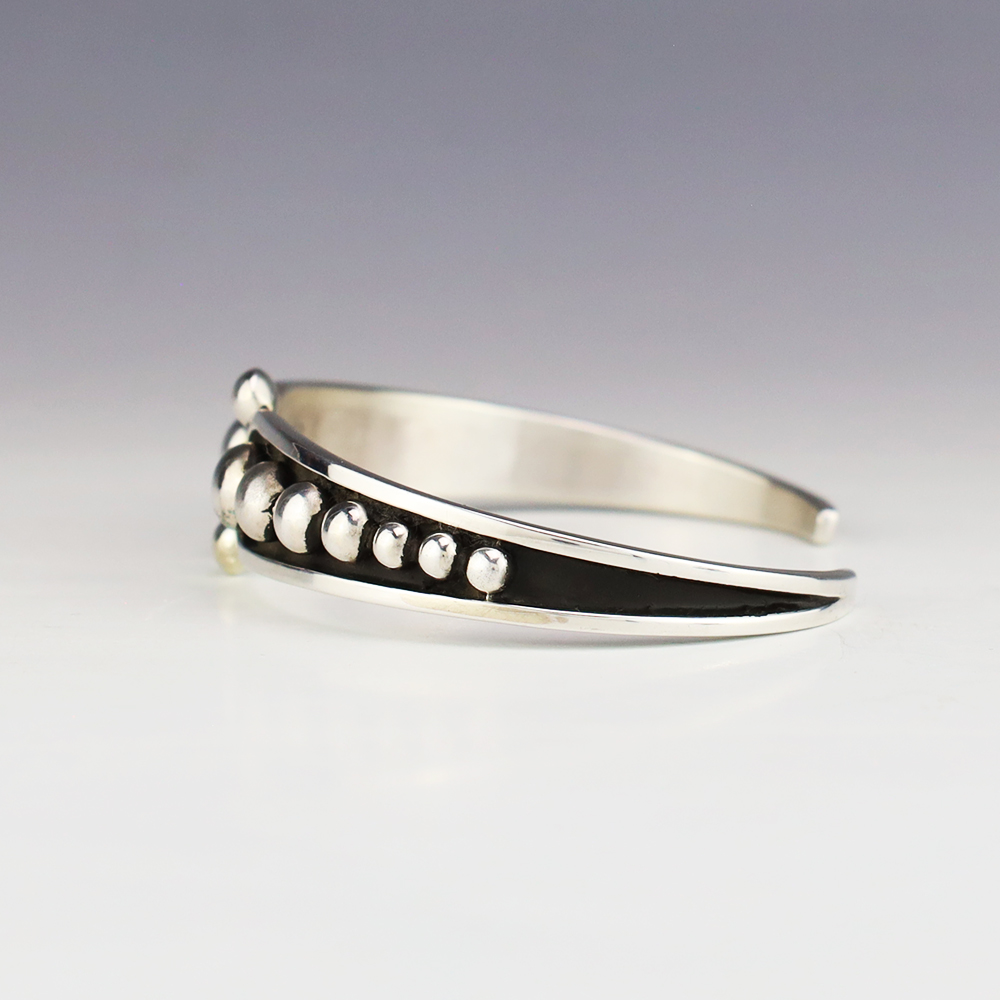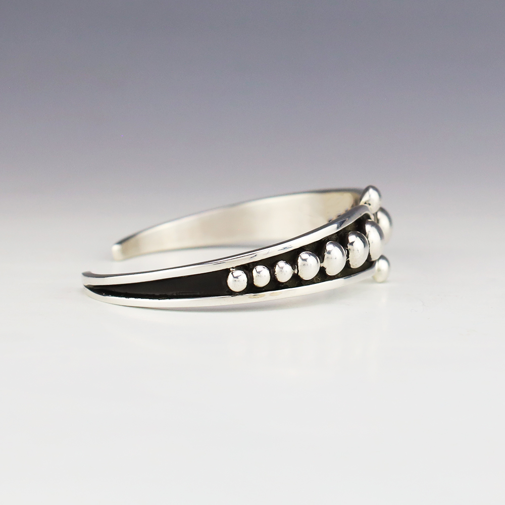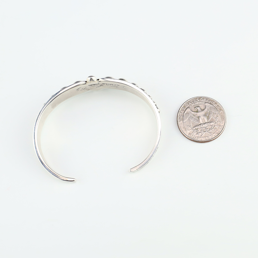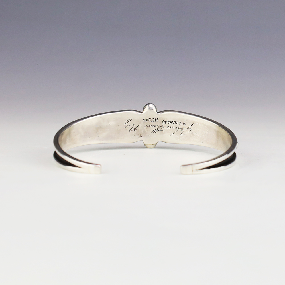 Navajo artist Johnathan Nez hand crafted this magnificent bracelet out of sterling silver. Weighs 22 grams. The entire inner circumference is about 6 1/2”, including 1 1/16” opening. (Fits a 6 1/2″ wrist). Signed
