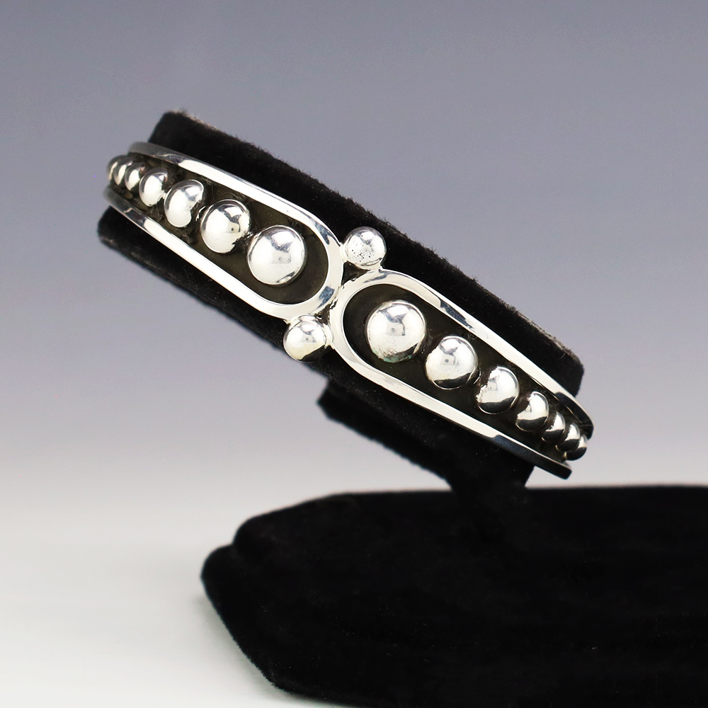 Navajo artist Johnathan Nez hand crafted this magnificent bracelet out of sterling silver. Weighs 22 grams. The entire inner circumference is about 6 1/2”, including 1 1/16” opening. (Fits a 6 1/2″ wrist). Signed