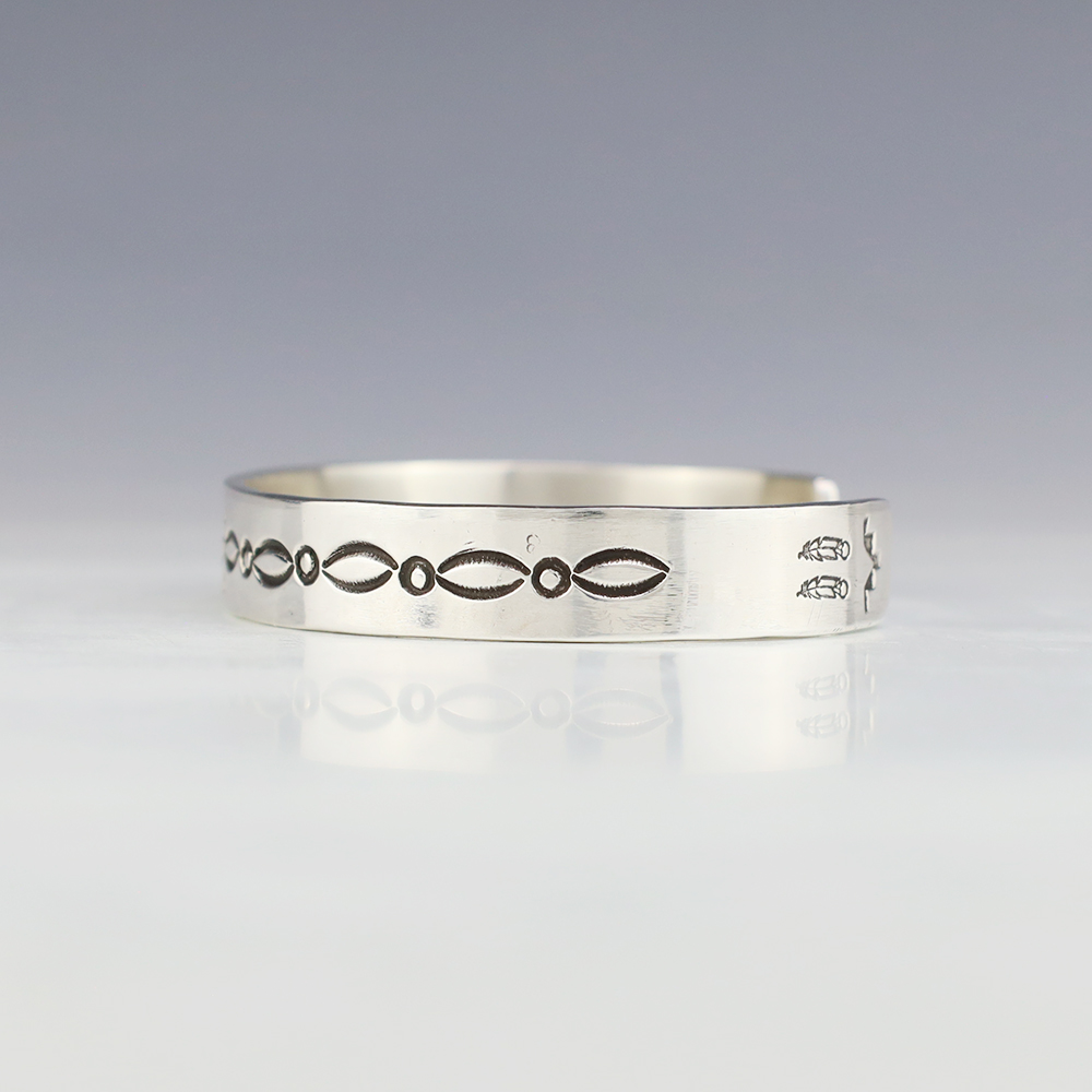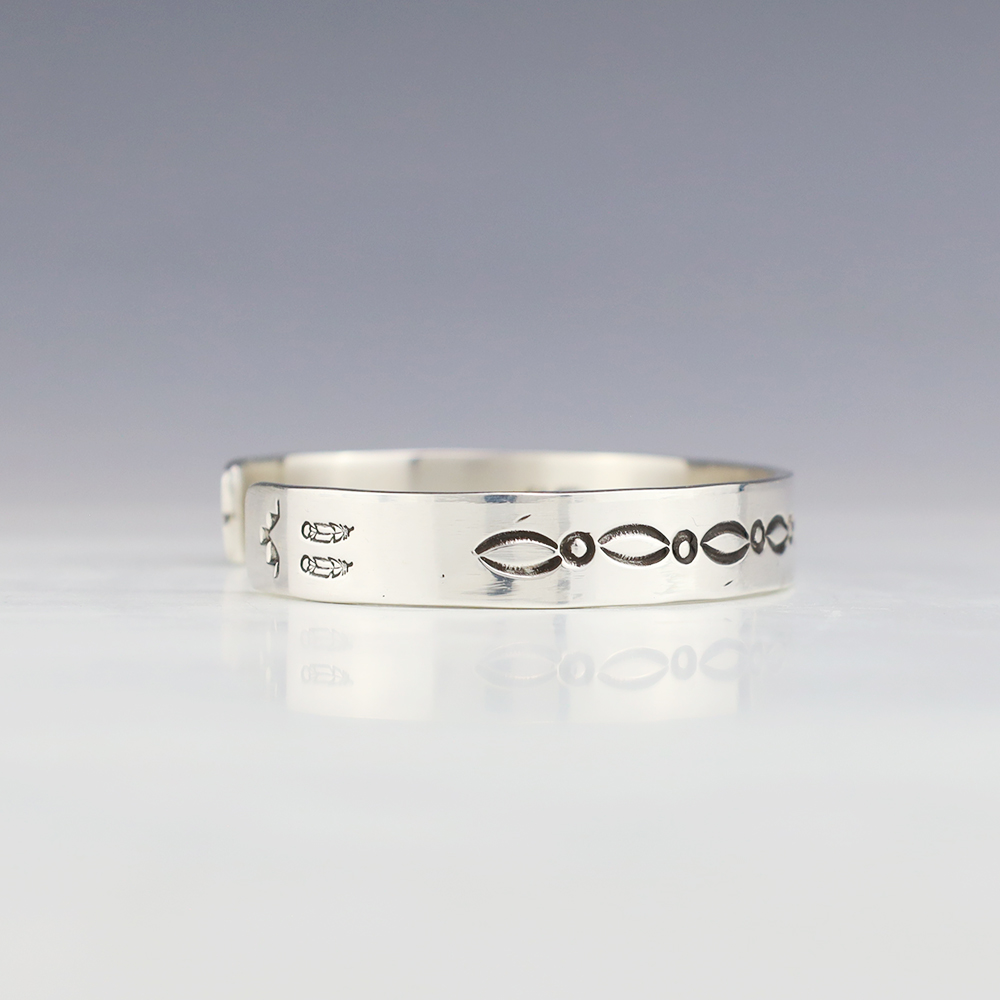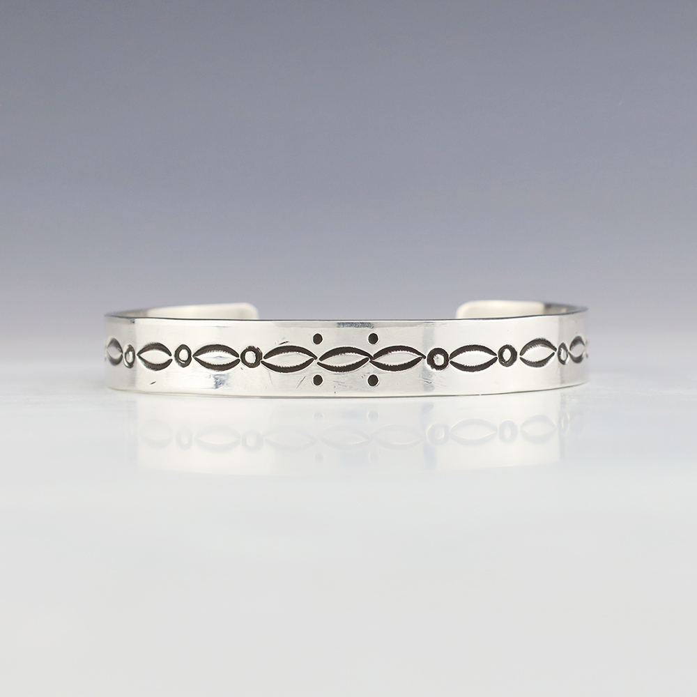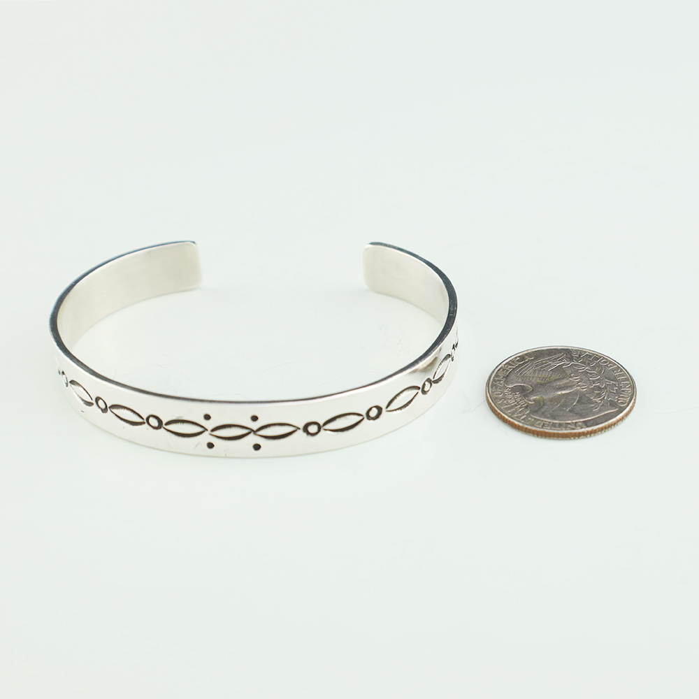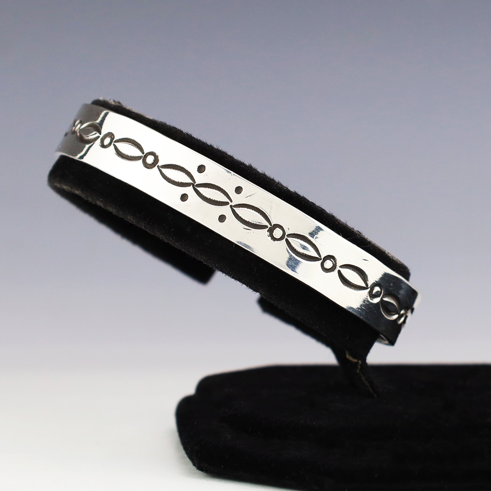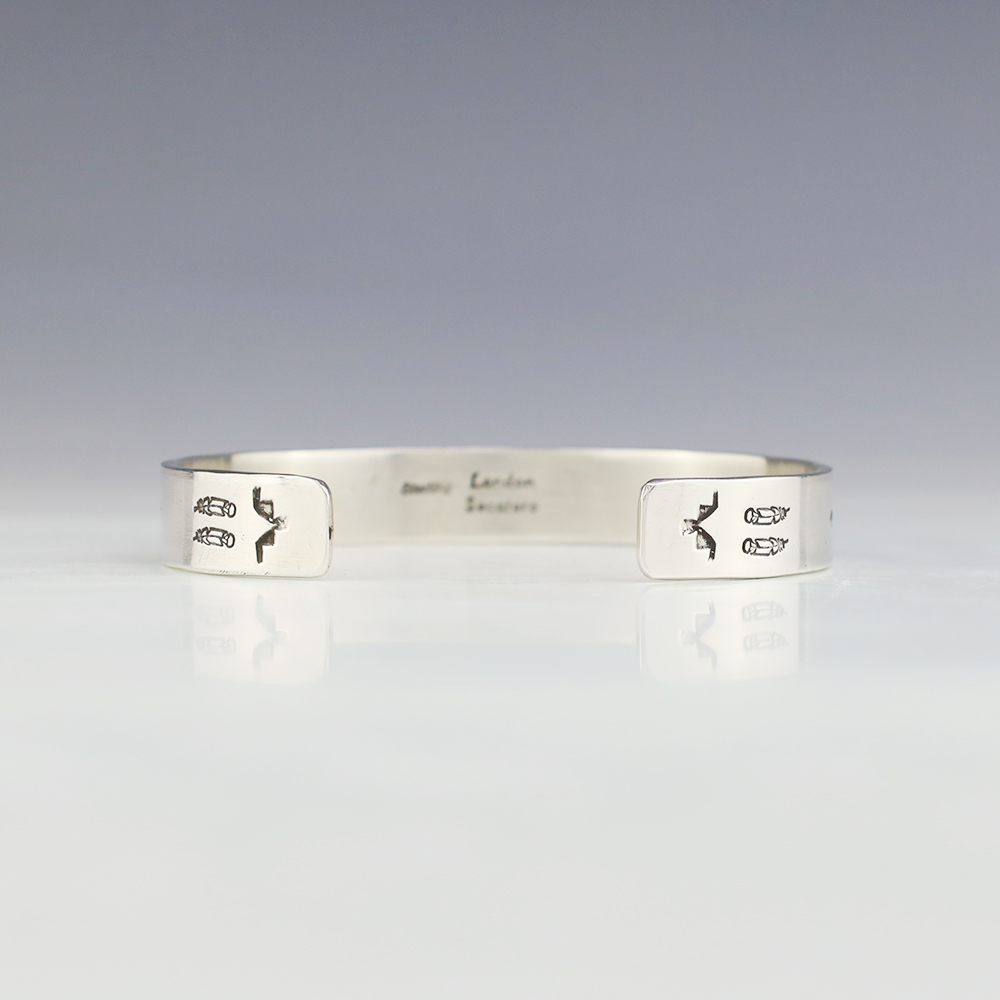 Navajo artist Landon Secatero made this outstanding sterling silver bracelet. Weighs 26 grams. The entire inner circumference is about 7”, including 1 1/16” opening. (Fits a 7″ wrist). Signed.