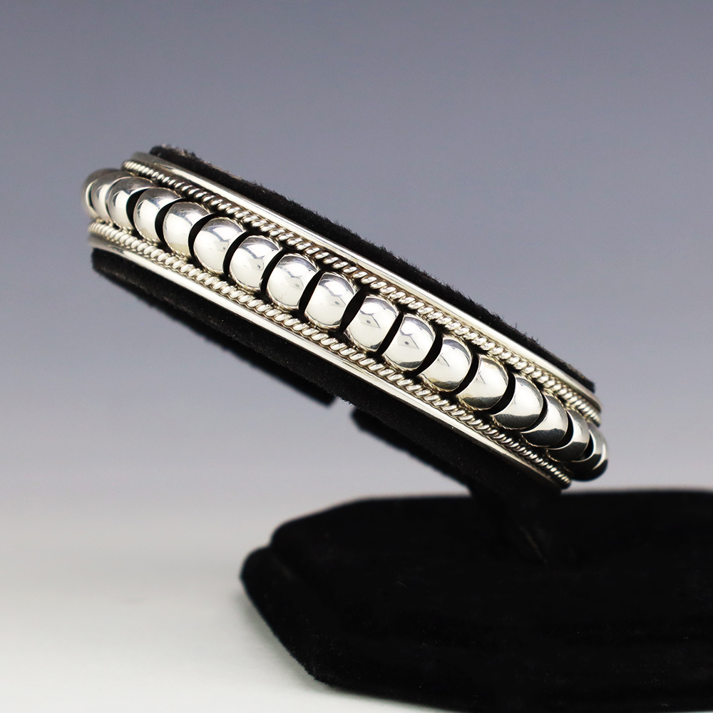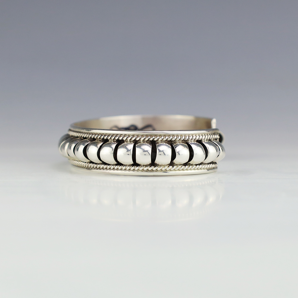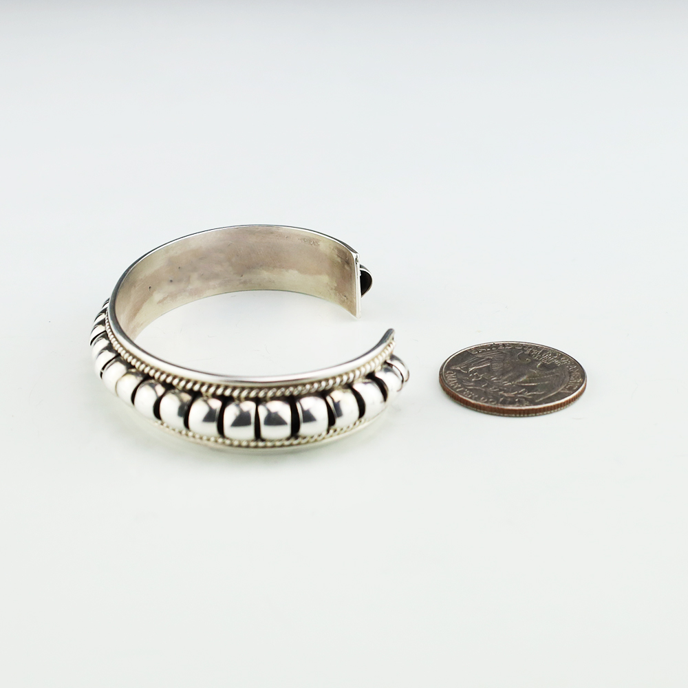 This timeless piece would be a great addition to your jewelry collection. Sterling silver and hand made by Navajo silversmith Priscilla Apache. The entire inner circumference is about 6 1/2”, including 1 1/16” opening. (Fits a 6 1/2″ wrist). Weighs 22 grams. Signed.