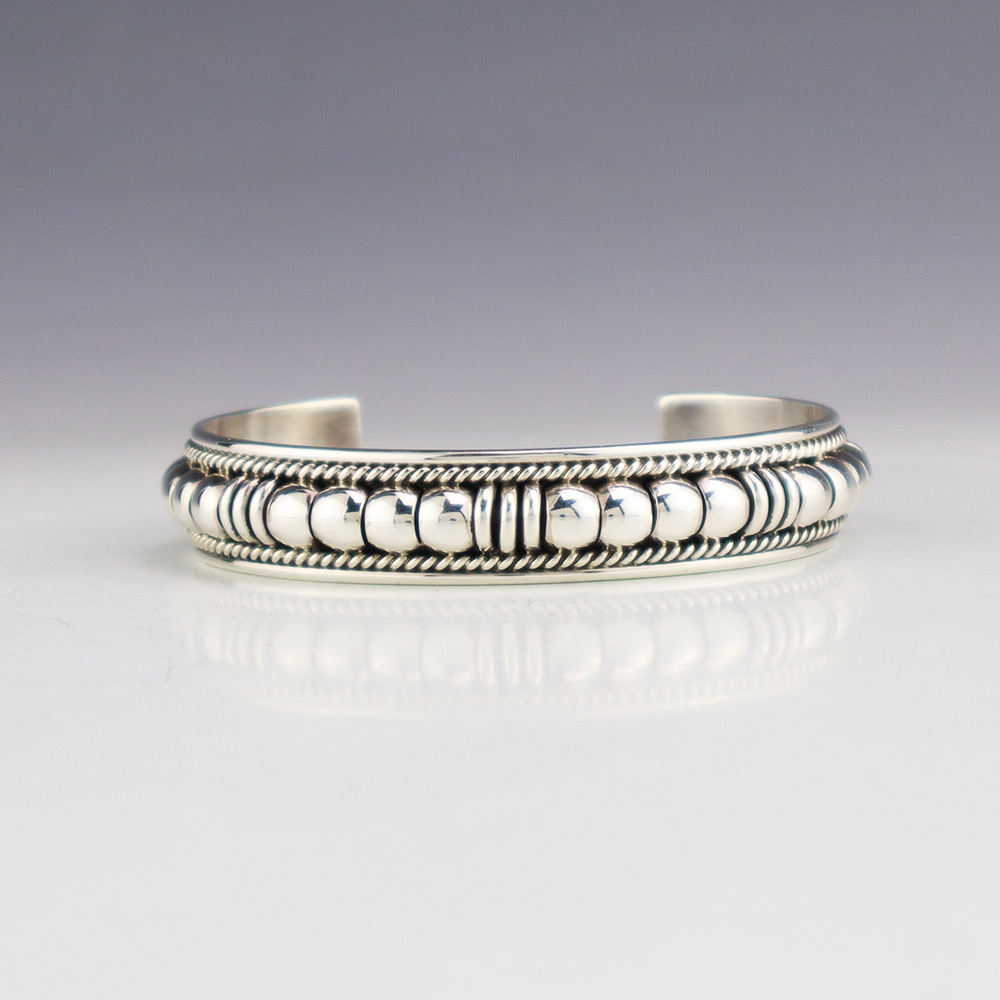 The Navajos began working with silver in the 19th century, and began making things like buckles, bridles, buttons, rings, canteens, hollow beads, earrings, crescent-shaped pendants (called “najas”), bracelets, crosses, powder chargers, tobacco canteens, and conchos (for belts). Their silversmithing skills has evolved and changed throughout the years, and in about 1880 Navajo silversmiths started to set turquoise in their silver work. Traditionally, Navajo artists worked with jewelry techniques like repousee and stamp work, but today they explored in other Native American jewelry making techniques like Zuni inlay work and Hopi overlay work