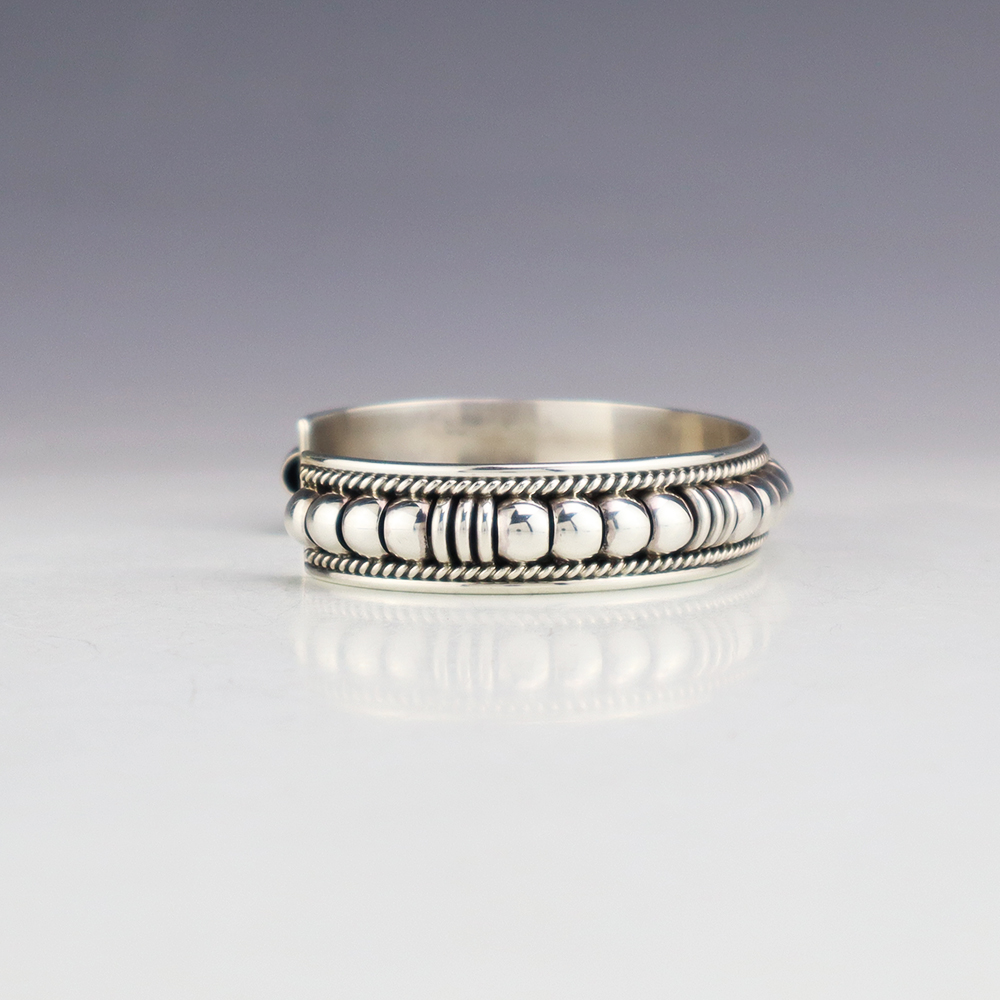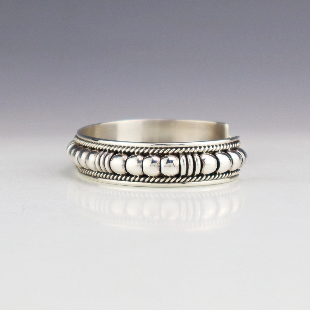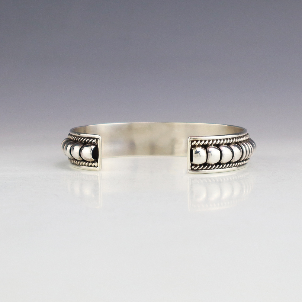 This timeless piece would be a great addition to your jewelry collection. Sterling silver and hand made by Navajo silversmith Thomas Charley. The entire inner circumference is about 6 1/2”, including 1 1/8” opening. Fits a wrist that measures 6 1/2″. (not a size 6 1/2) Weighs 18 grams. Signed.