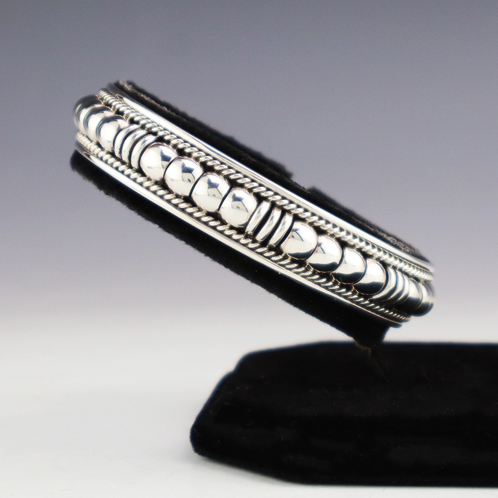 This timeless piece would be a great addition to your jewelry collection. Sterling silver and hand made by Navajo silversmith Thomas Charley. The entire inner circumference is about 6 1/2”, including 1 1/8” opening. Fits a wrist that measures 6 1/2″. (not a size 6 1/2) Weighs 18 grams. Signed.
