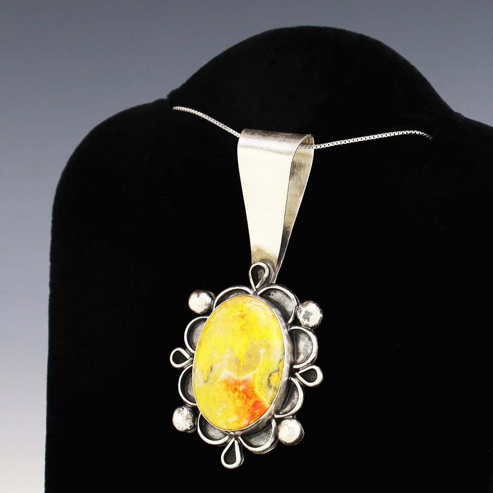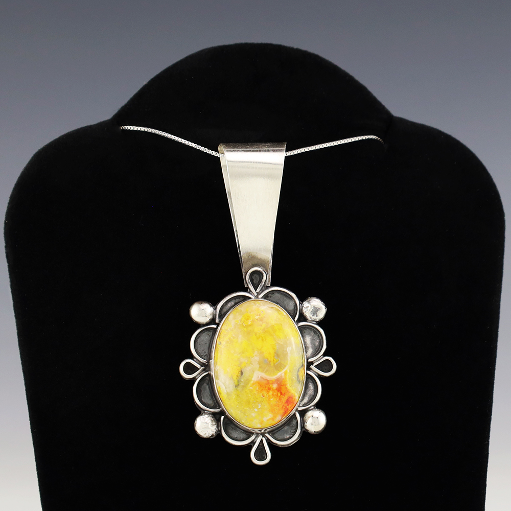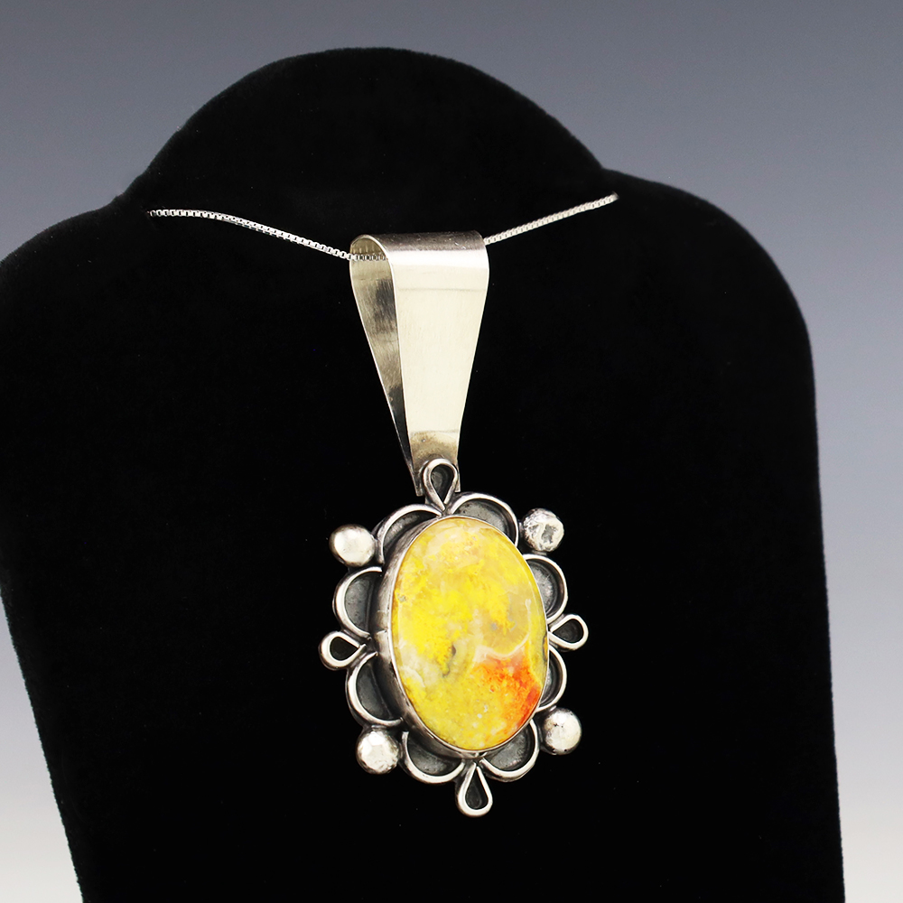 Gorgeous pendant hand made out of sterling silver and Bumblebee Jasper by Navajo artist Danny Henio. A timeless beauty that you will enjoy for years to come. Weighs 14 grams. Signed (Chain not included)
