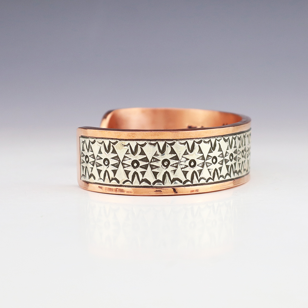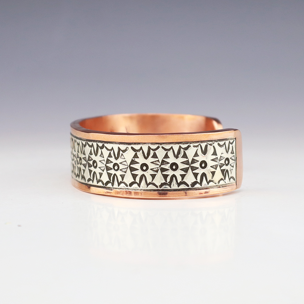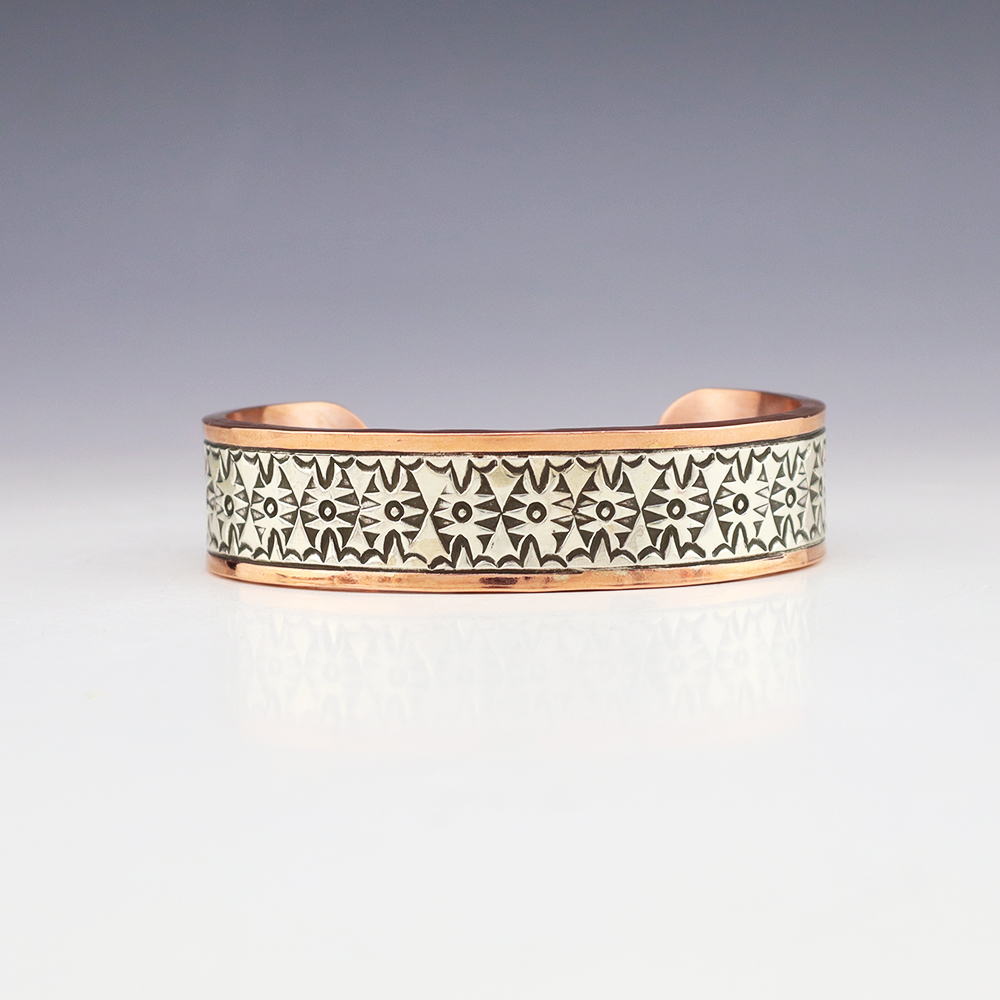 This wonderful bracelet is made out of sterling silver and Copper with a traditional hand stamped design. Weighs 94 grams. The entire inner circumference is about 8″, including 1 1/2” opening. Fits a wrist that measures 8″. (not a size 8). Signed