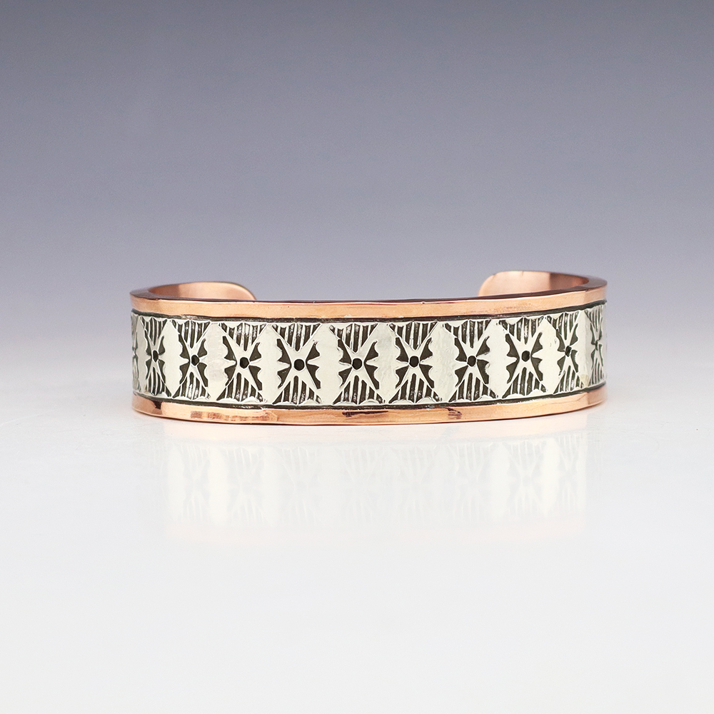 This wonderful bracelet is made out of sterling silver and Copper with a traditional hand stamped design. Weighs 94 grams. The entire inner circumference is about 8″, including 1 1/2” opening. Fits a wrist that measures 8″. (not a size 8). Signed