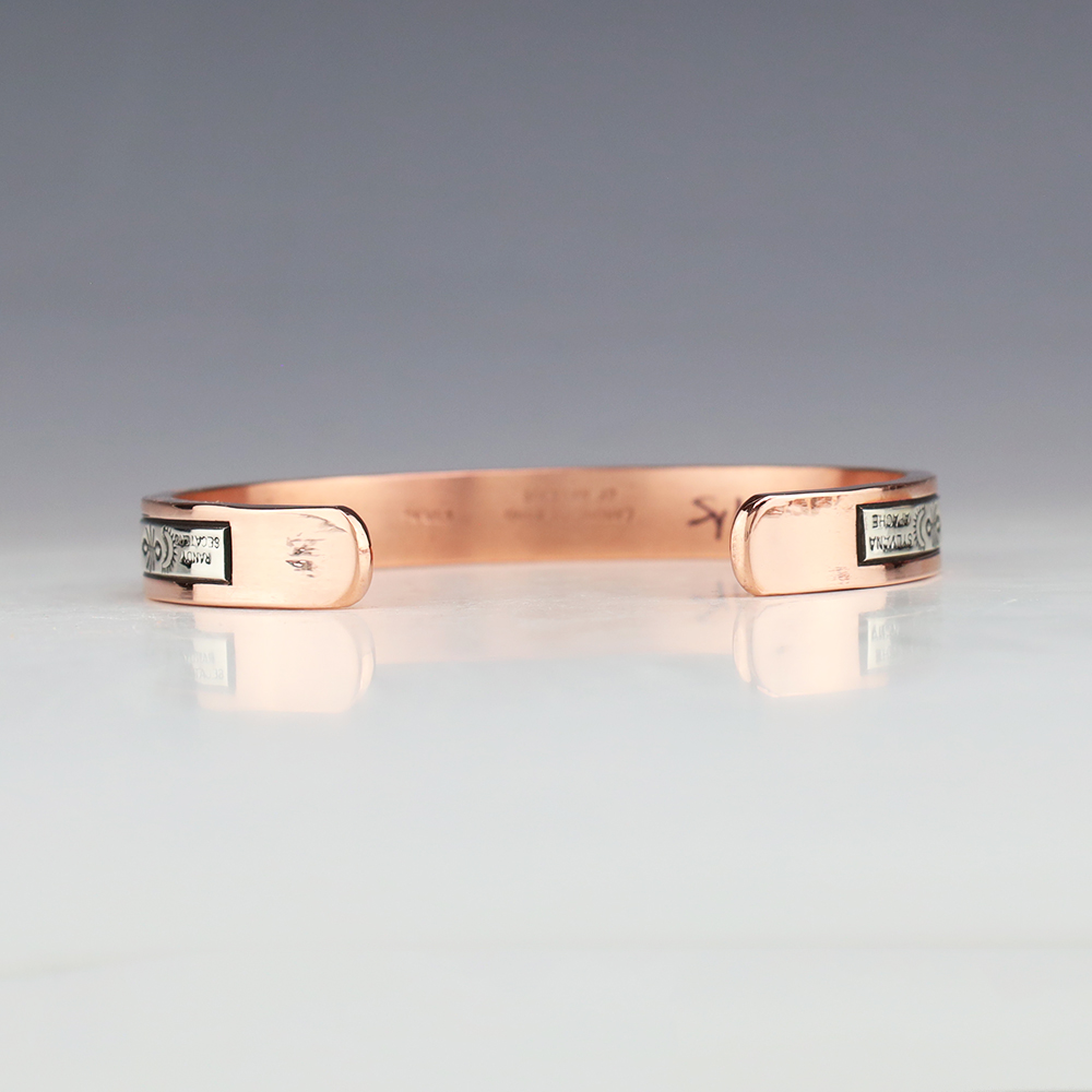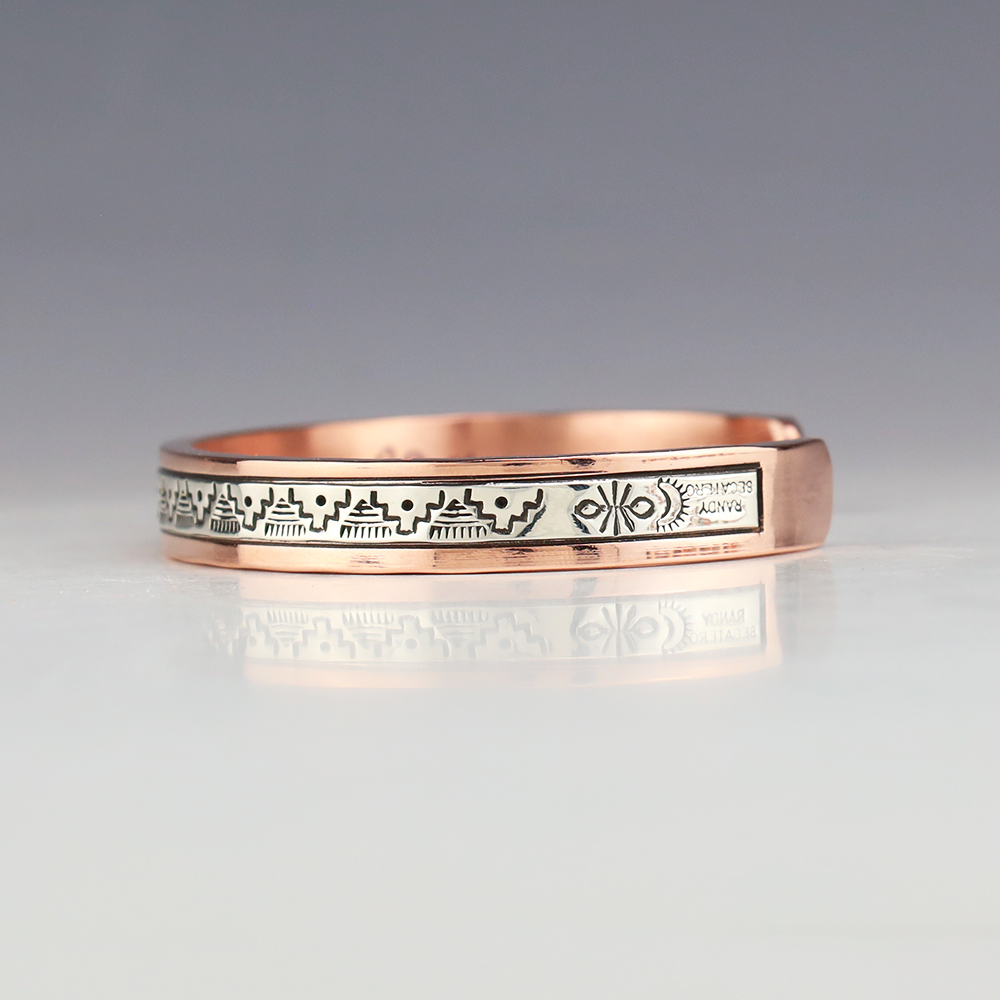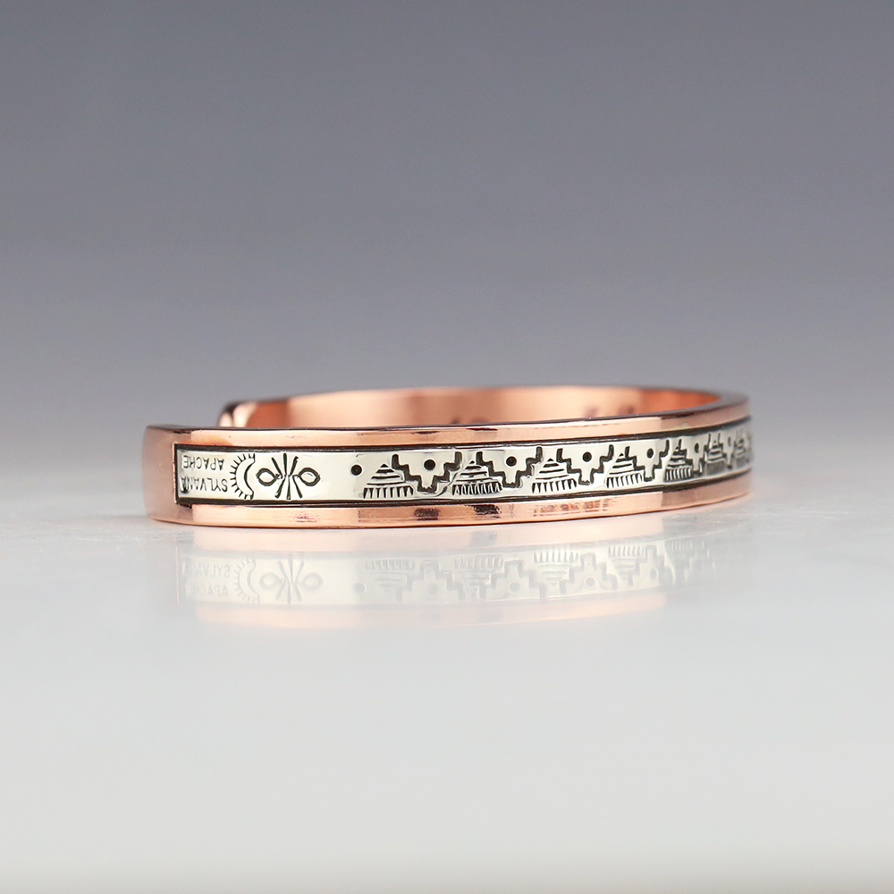Navajo artists Randy Secatero and Sylvana Apache made this marvelous bracelet. Sterling silver and Copper with a traditional hand stamped design. Weighs 50 grams. The entire inner circumference is about 8”, including 1 1/8” opening. (Fits a 8″ wrist) Signed