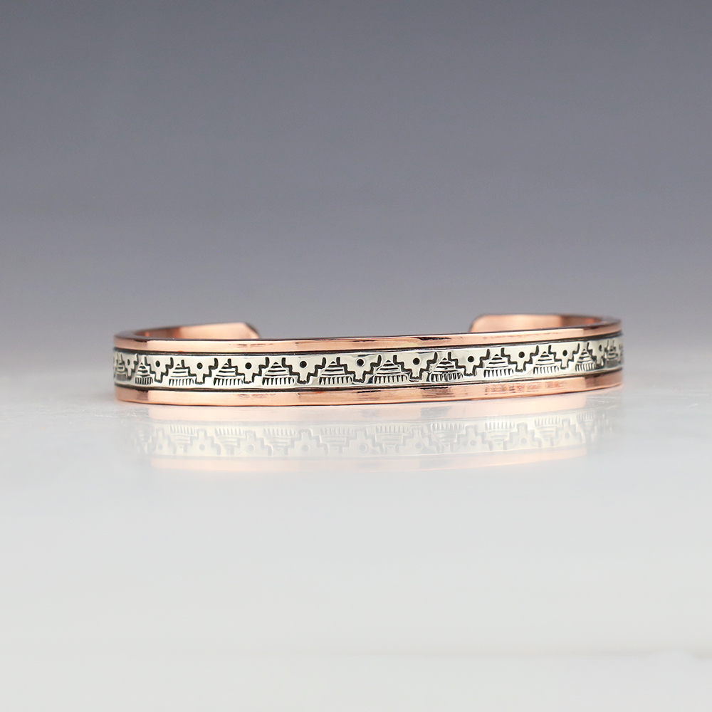 Navajo artists Randy Secatero and Sylvana Apache made this marvelous bracelet. Sterling silver and Copper with a traditional hand stamped design. Weighs 50 grams. The entire inner circumference is about 8”, including 1 1/8” opening. (Fits a 8″ wrist) Signed