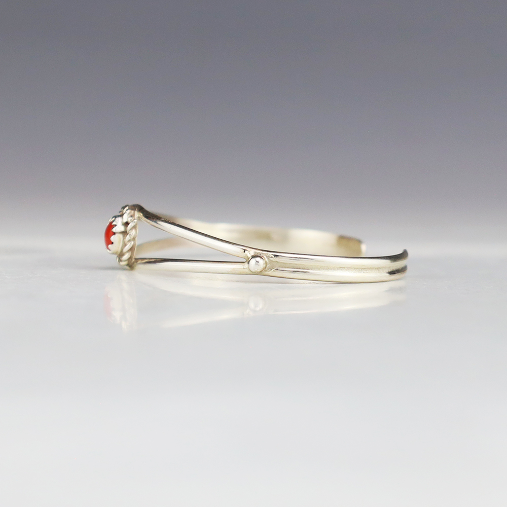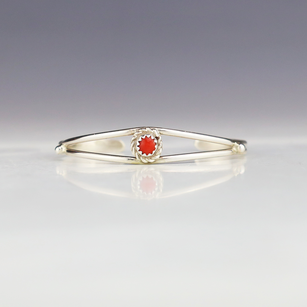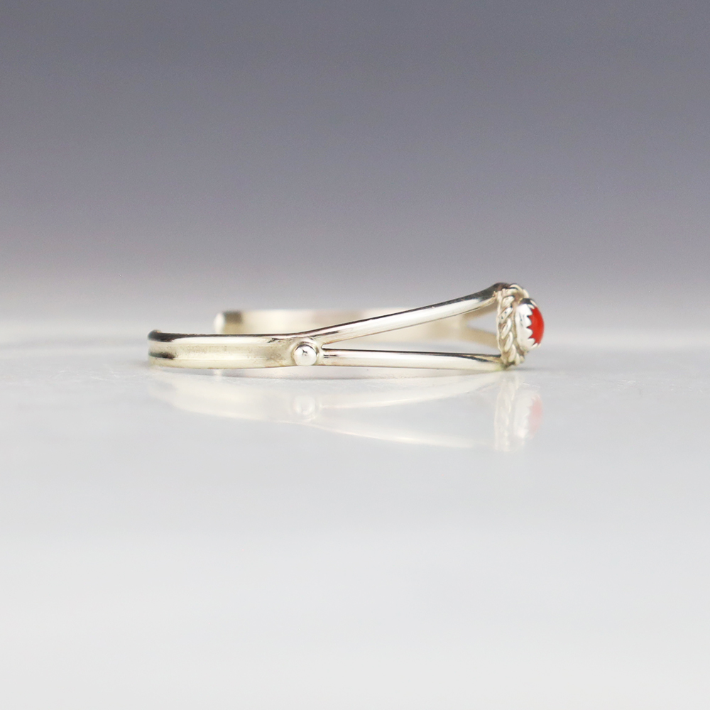 Lovely baby bracelet made out of sterling silver and Coral. This beautiful baby bracelet will be a great addition to your Native American jewelry collection. Weighs 4 grams.