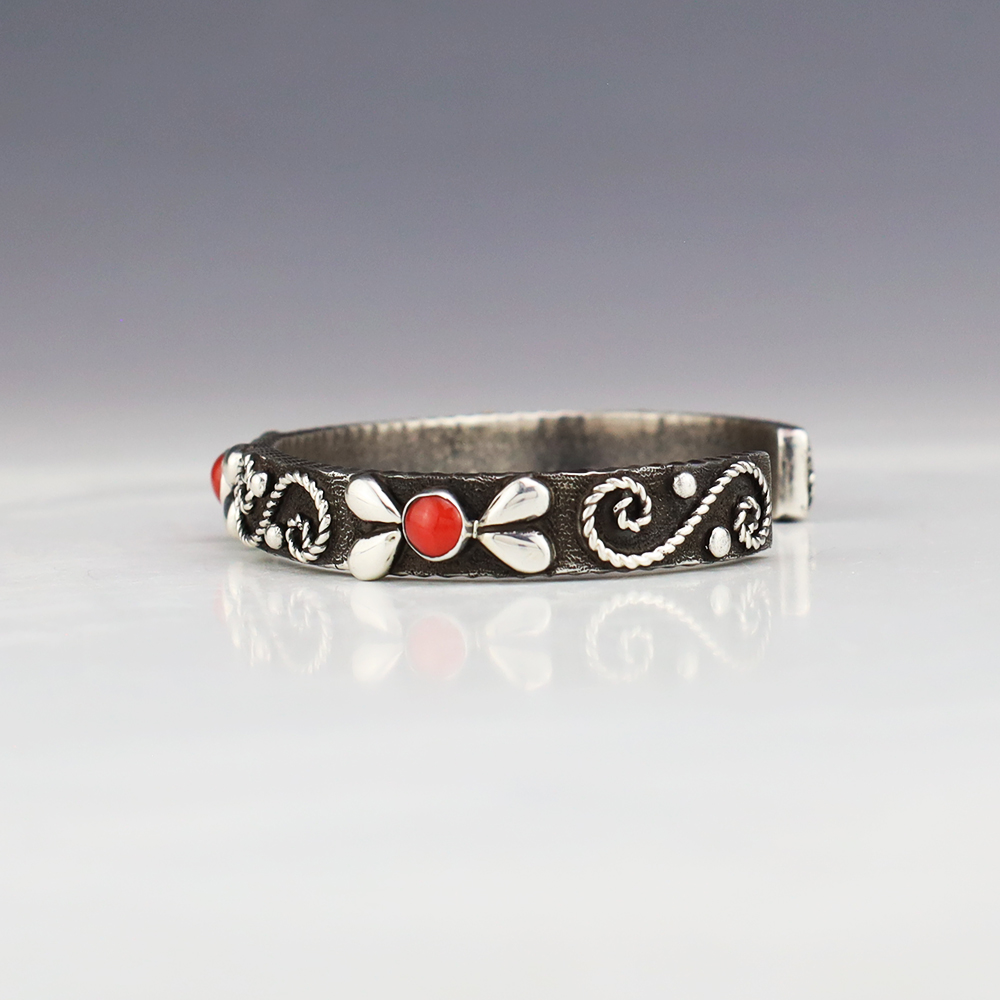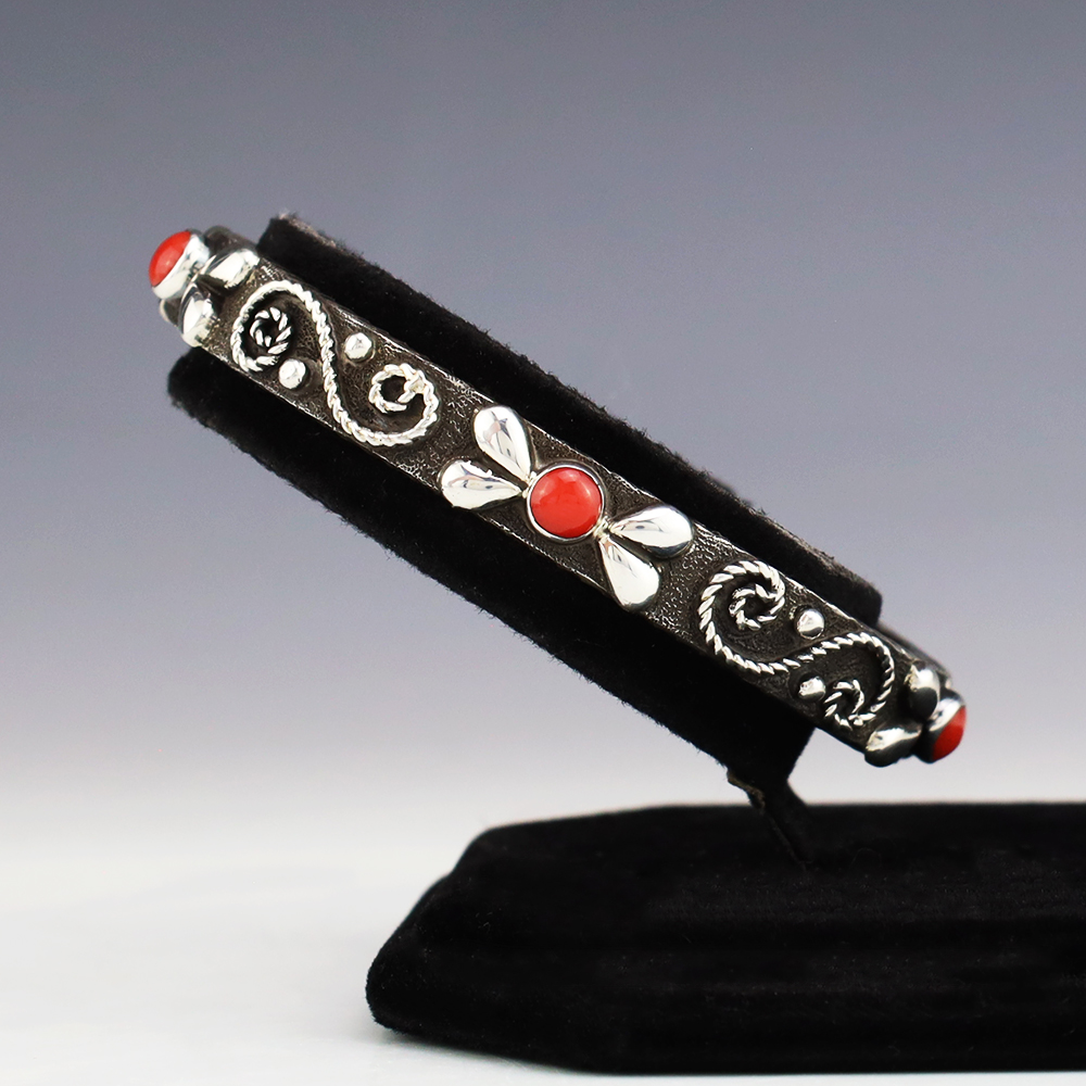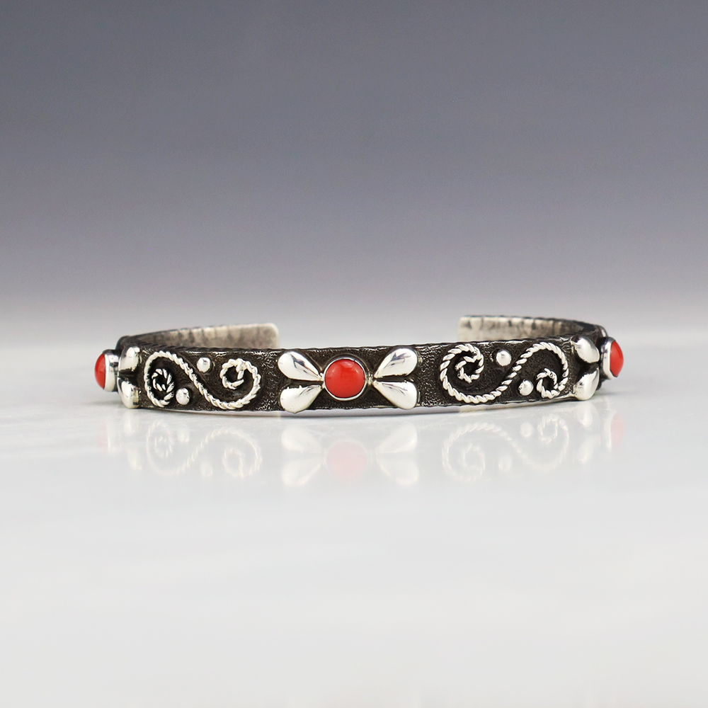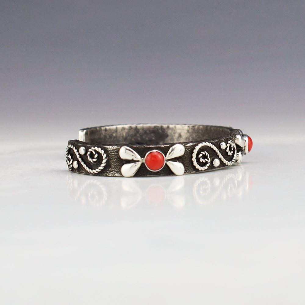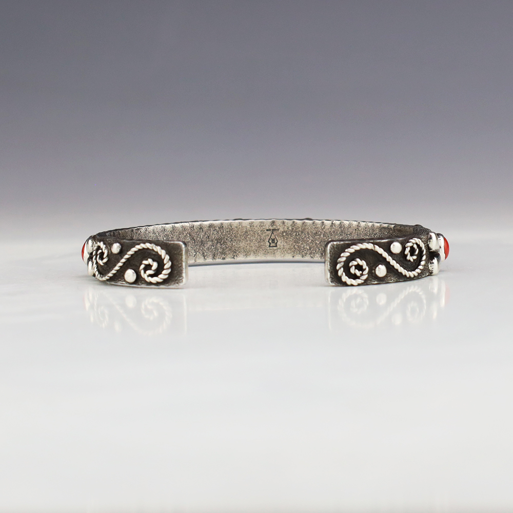 Exquisite design! This sterling silver and Coral bracelet was hand made by Navajo silversmith Ernest Rangel. Weighs 36 grams. The entire inner circumference is about 6 1/2”, including 1” opening. (Fits a 6 1/2″ wrist) Signed.
