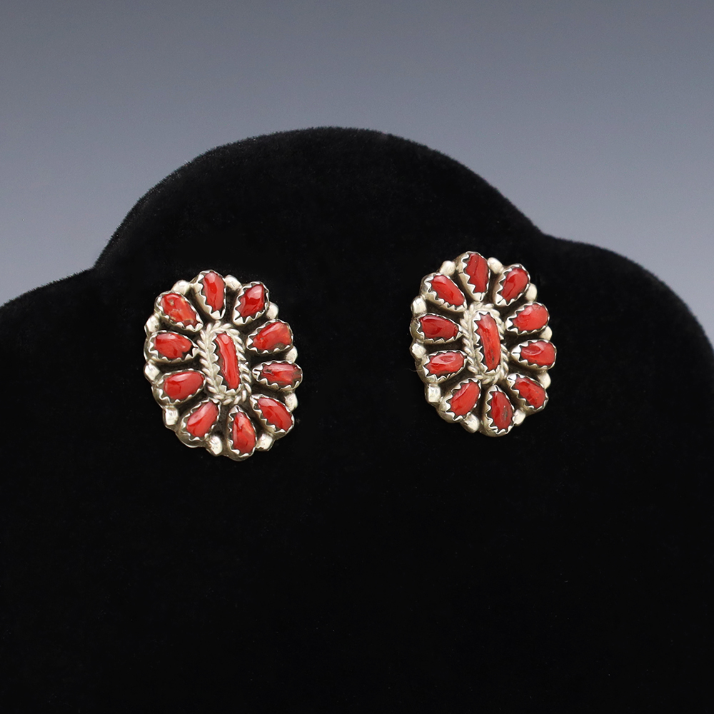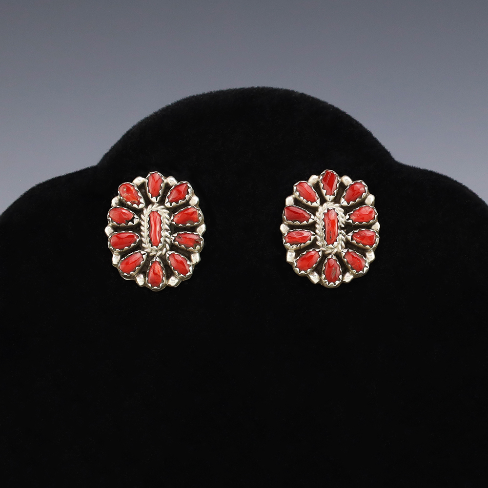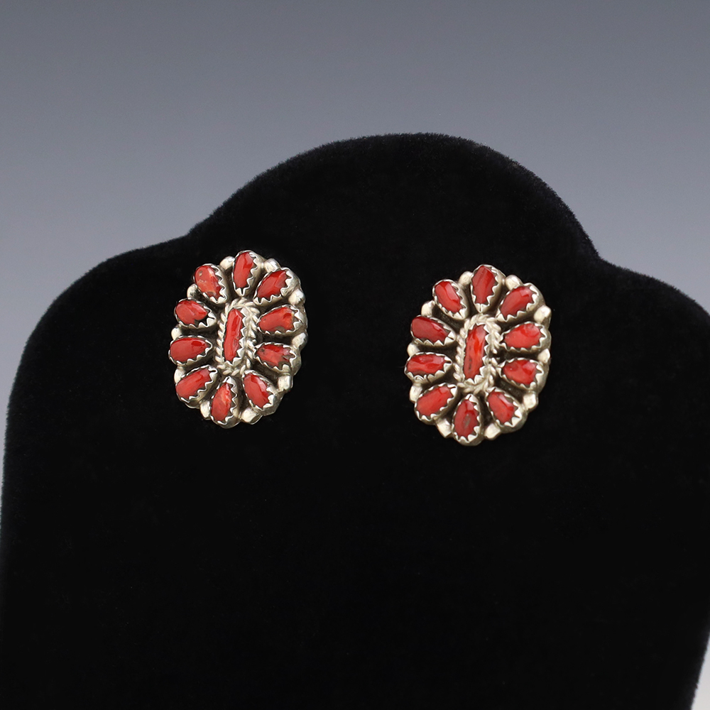 Lovely cluster earrings hand made by Navajo artist Jeffrey James. The earrings are sterling silver and set with Coral stones. These fabulous earrings will become a versatile accessory in your jewelry collection. Weighs 6 grams.