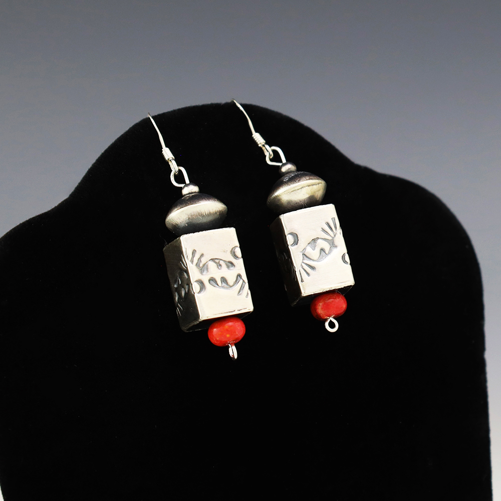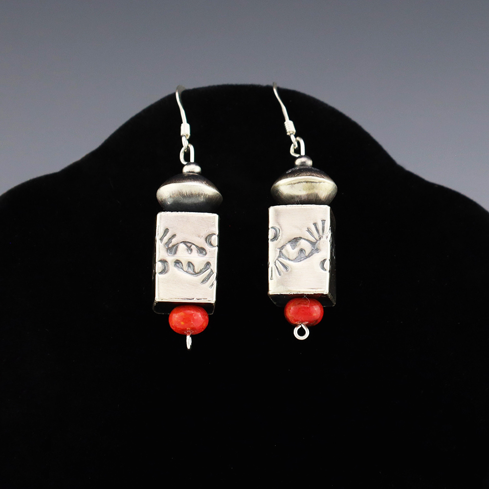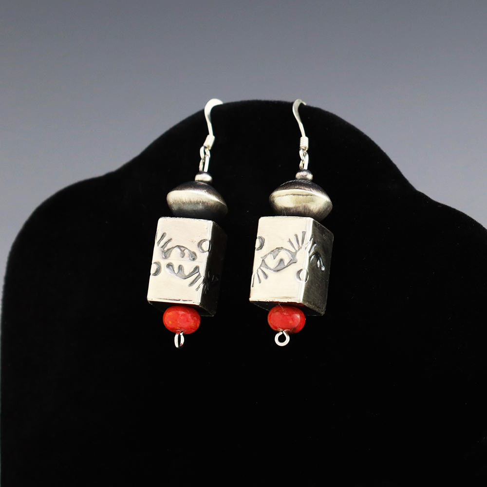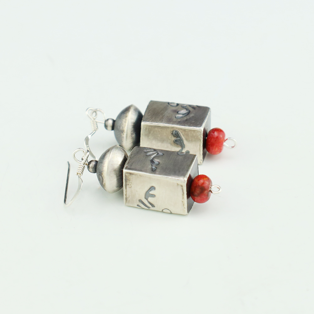 Lovely bead earrings hand made out of sterling silver and Coral by Navajo silversmith Samantha Martin. These wonderful earrings will become a versatile accessory in your jewelry collection. Weighs 6 grams. Signed