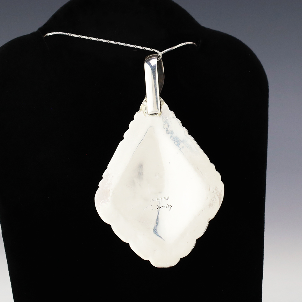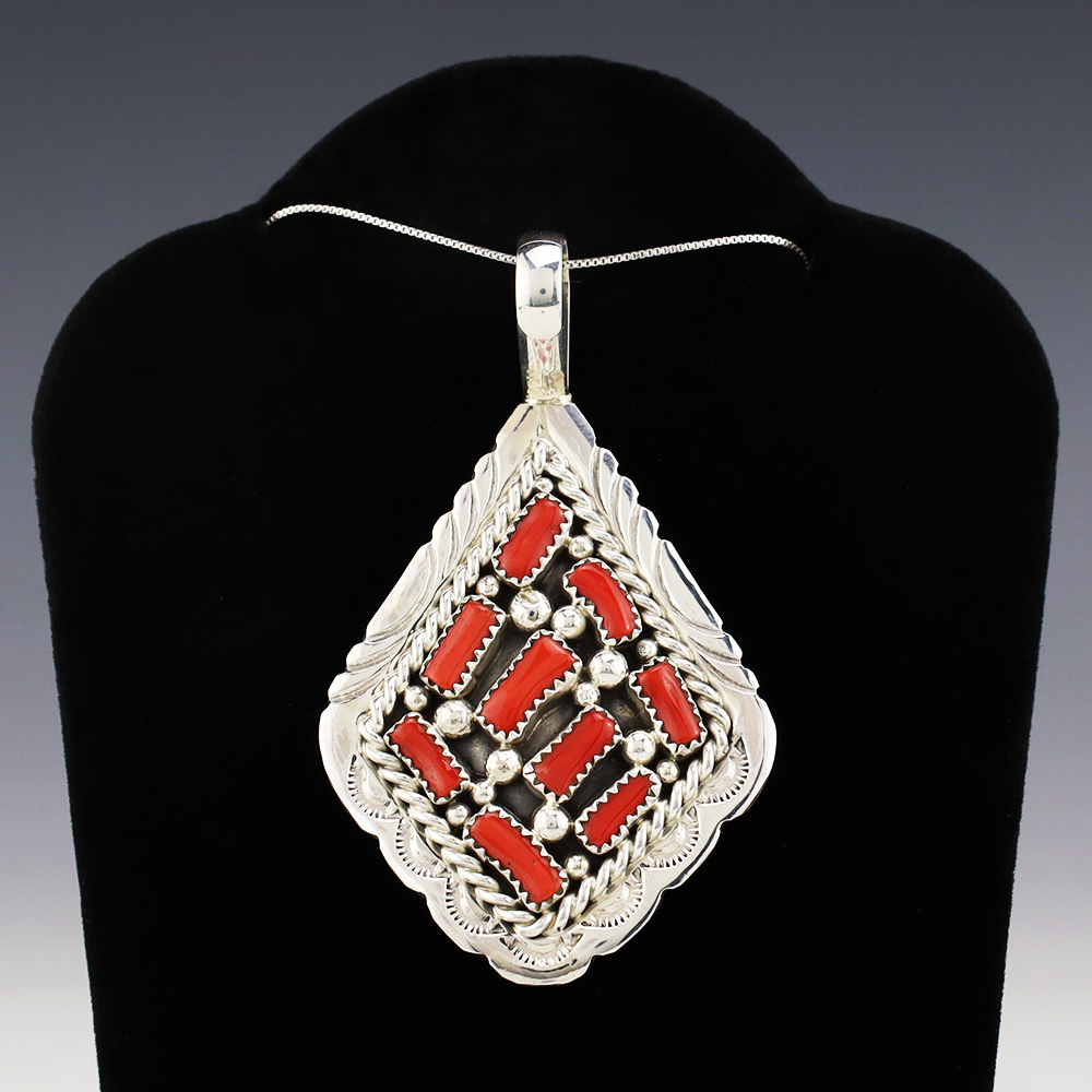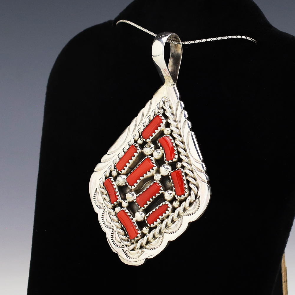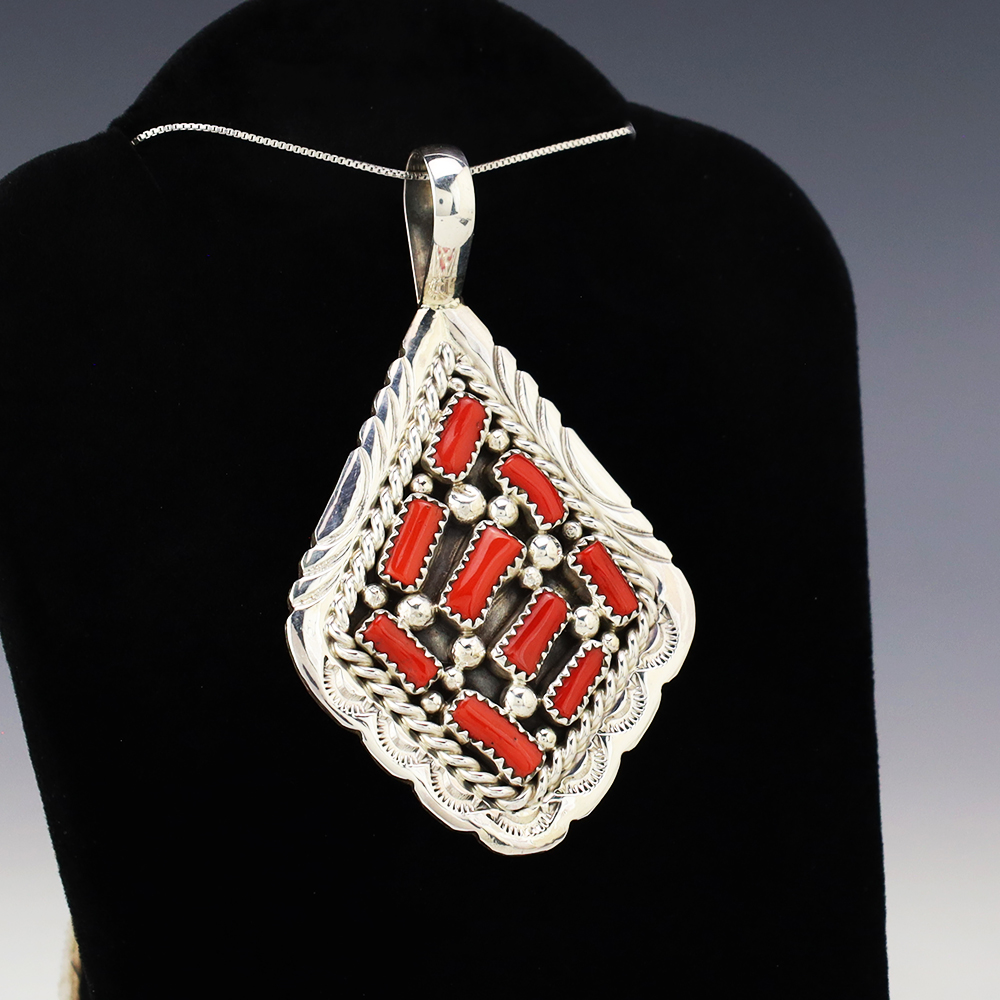 Gorgeous sterling silver and Coral pendant by Navajo artist Chester Charley. A timeless beauty that you will enjoy for years to come. Weighs 18 grams. Signed (Chain not included)