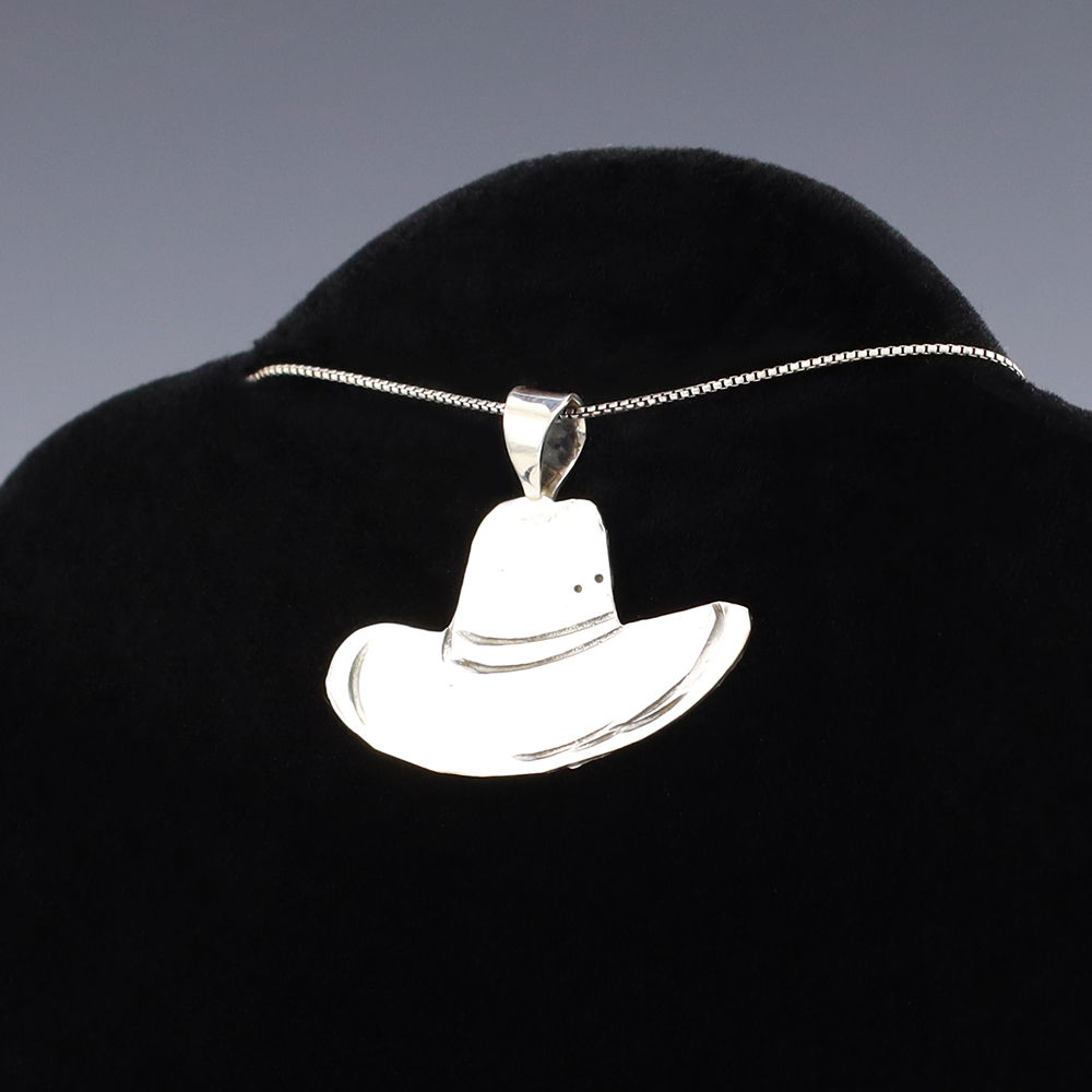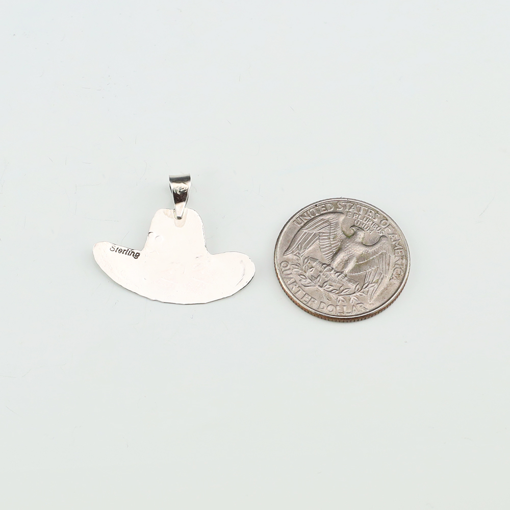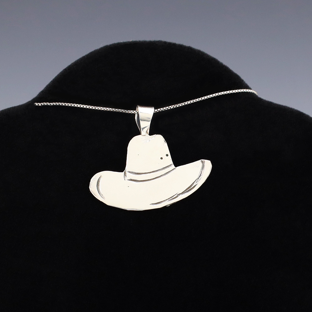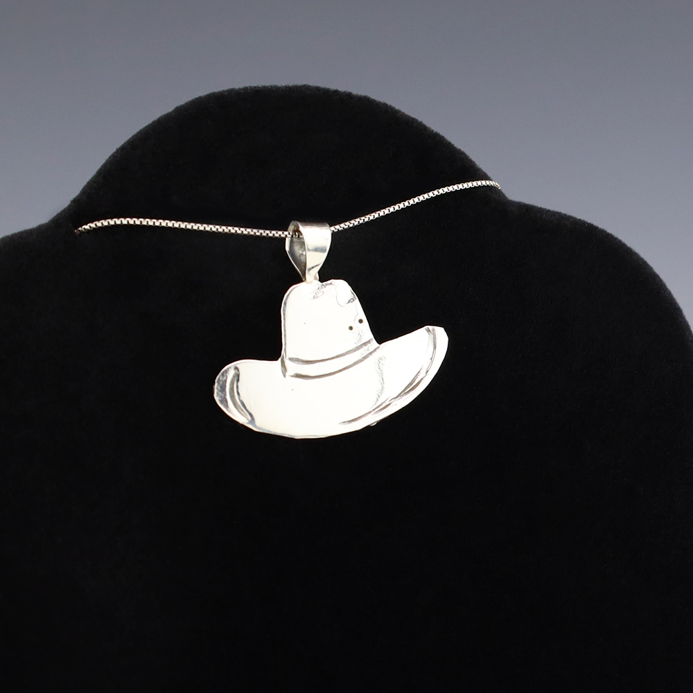 Navajo silversmith Lucille Platero made this stellar Cowboy hat pendant out of sterling silver. A timeless beauty that you will enjoy for years to come. Weighs 2 grams. (Chain not included)