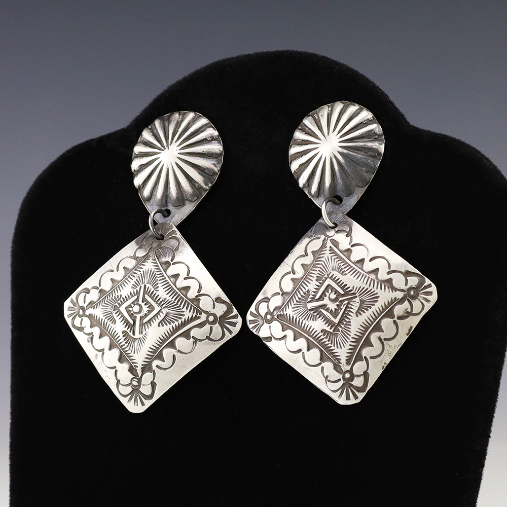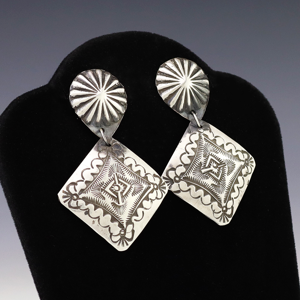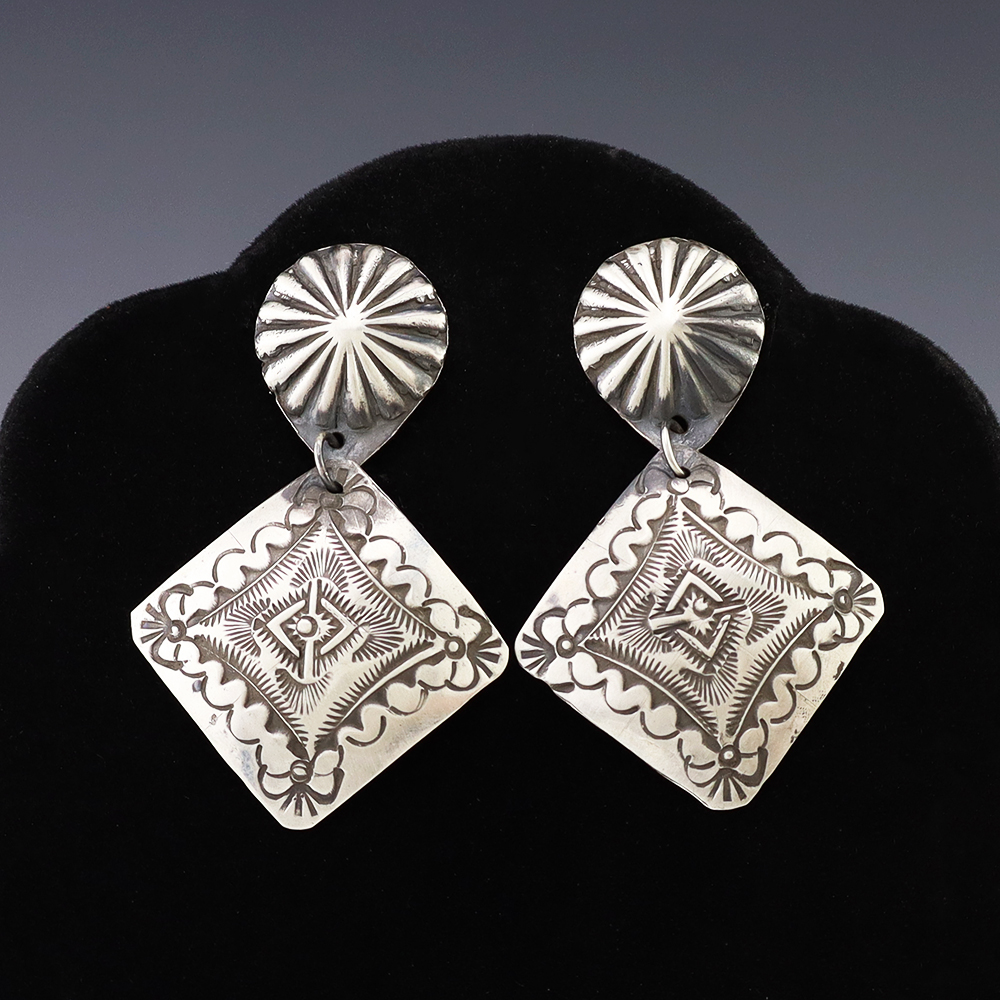 The Navajos began working with silver in the 19th century, and began making things like buckles, bridles, buttons, rings, canteens, hollow beads, earrings, crescent-shaped pendants (called “najas”), bracelets, crosses, powder chargers, tobacco canteens, and conchos (for belts). Their silversmithing skills has evolved and changed throughout the years, and in about 1880 Navajo silversmiths started to set turquoise in their silver work. Traditionally, Navajo artists worked with jewelry techniques like repousee and stamp work, but today they explored in other Native American jewelry making techniques like Zuni inlay work and Hopi overlay work.