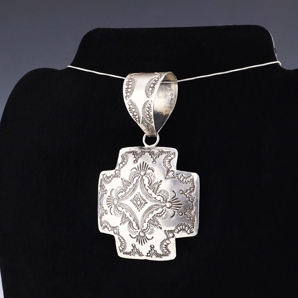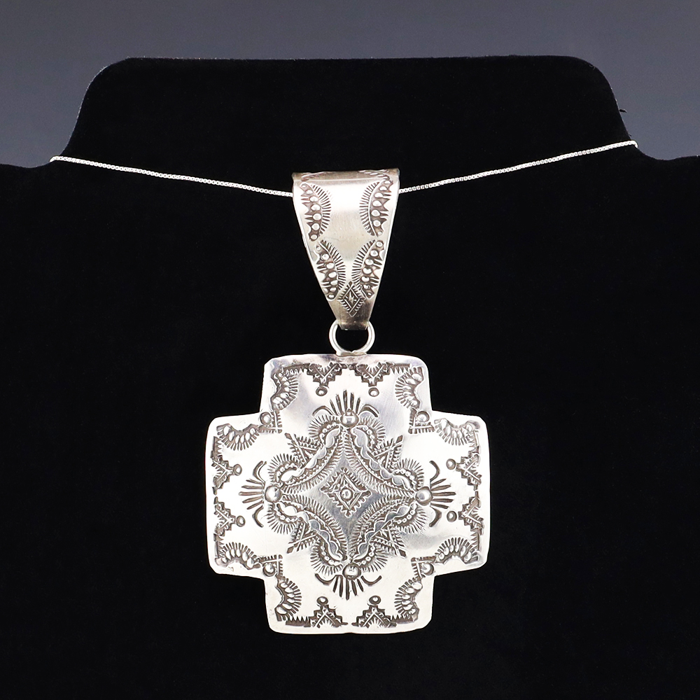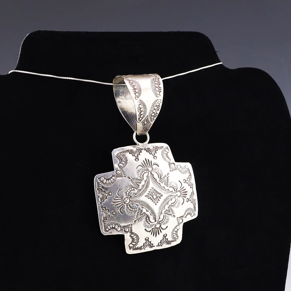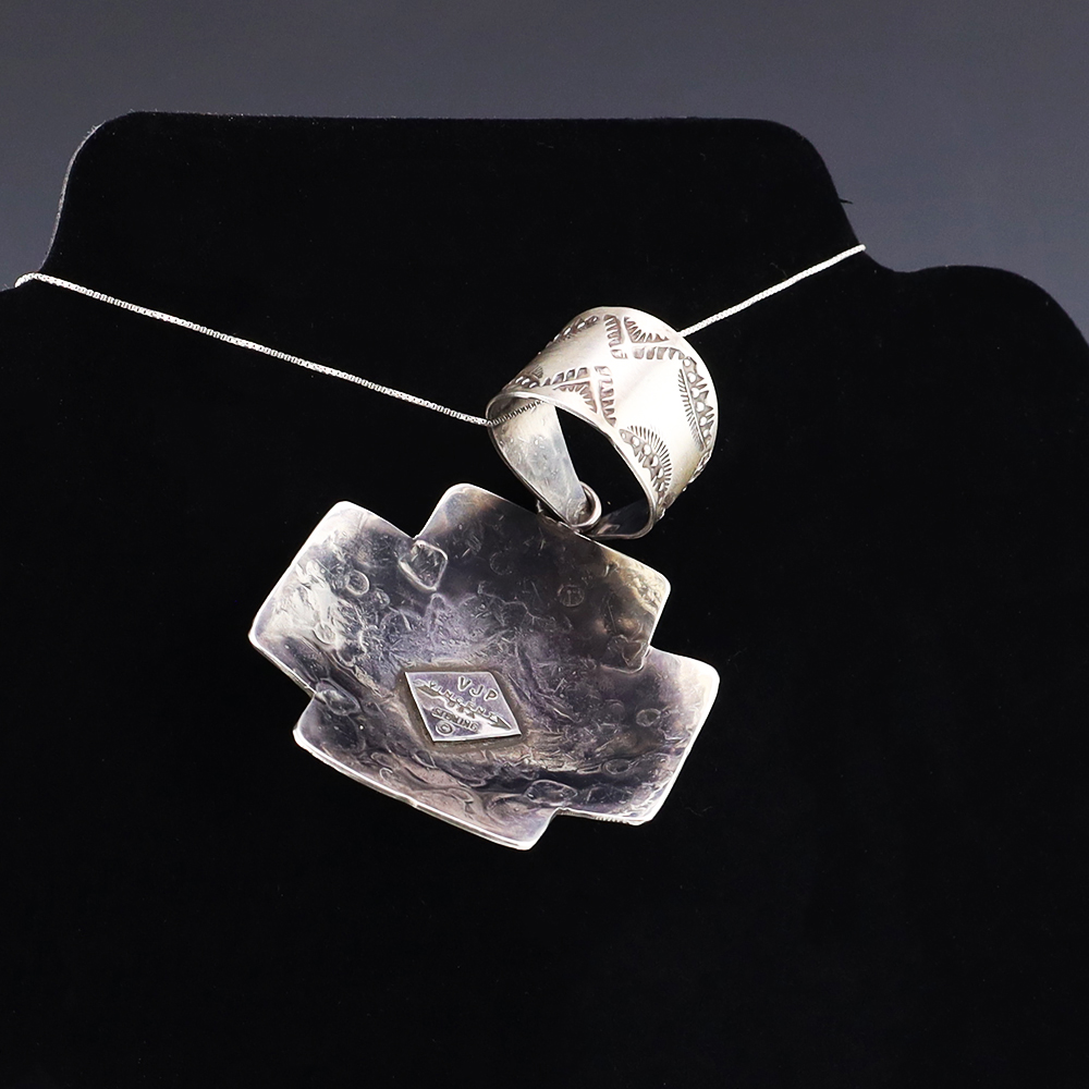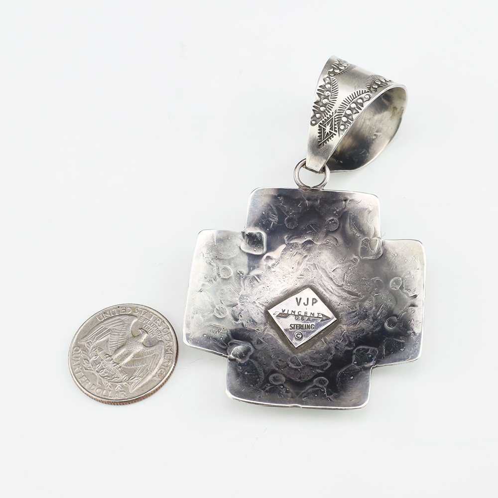 Navajo silversmith Vincent Platero handcrafted this beautiful cross pendant out of sterling silver. The pendant is hand stamped and has a satin finish. A timeless beauty that you will enjoy for years to come. Weighs 26 grams. Signed. (Chain not included)