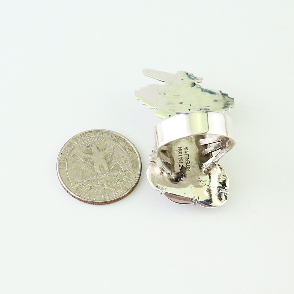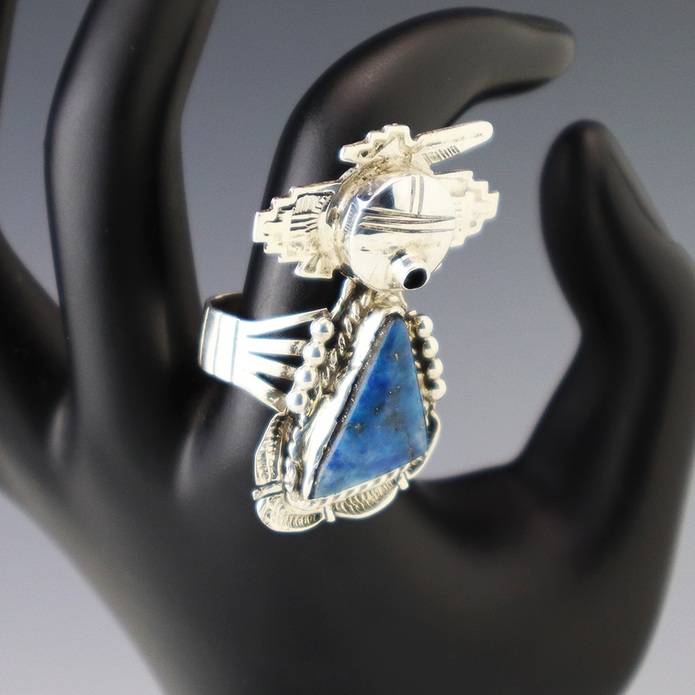 This ring is a great representation of hand made Navajo jewelry and will make a statement on your hand. A beautiful piece of Denim Lapis is set into a sterling silver setting. Hand made by Navajo silversmith Bennie Ration. Weighs 16 grams. Size 9 3/4. Signed
