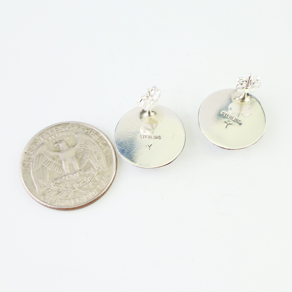 Outstanding sterling silver earrings with Mother of Pearl Shell and Turquoise inlay. Hand crafted by Zuni jewelry makers, Nancy and Sheldon Westika. The Westikas have been making jewelry since the 1970’s and they are known for their fine inlay work. Weighs 6 grams. Signed 7/8” wide x 7/8” tall 1 ...