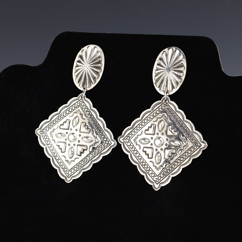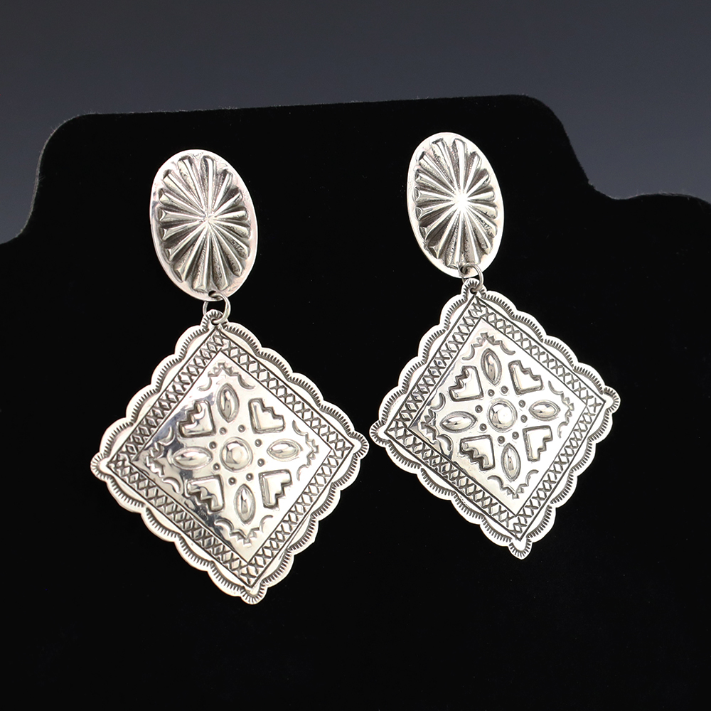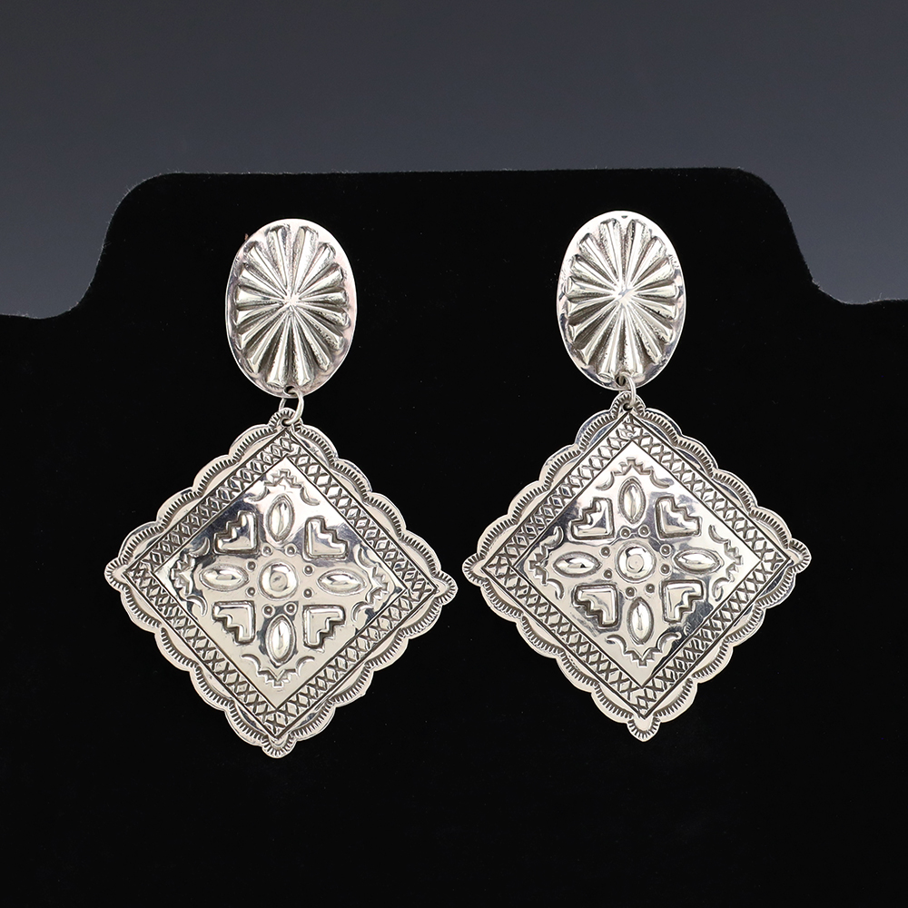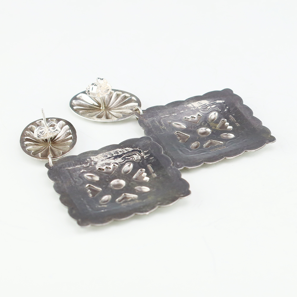 Beautiful earrings hand made out of sterling silver. Hand made by Navajo silversmith Harris Joe. These fabulous earrings will become a versatile accessory in your jewelry collection. Weighs 20 grams. Signed.