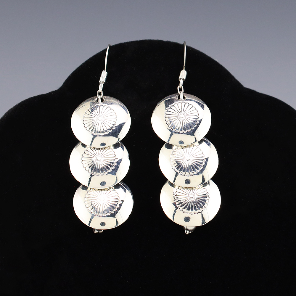 The Navajos began working with silver in the 19th century, and began making things like buckles, bridles, buttons, rings, canteens, hollow beads, earrings, crescent-shaped pendants (called “najas”), bracelets, crosses, powder chargers, tobacco canteens, and conchos (for belts). Their silversmithing skills has evolved and changed throughout the years, and in about 1880 Navajo silversmiths started to set turquoise in their silver work. Traditionally, Navajo artists worked with jewelry techniques like repousee and stamp work, but today they explored in other Native American jewelry making techniques like Zuni inlay work and Hopi overlay work.