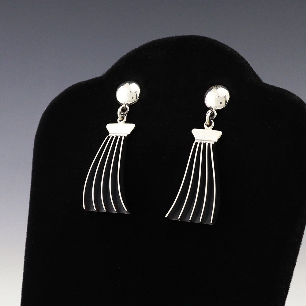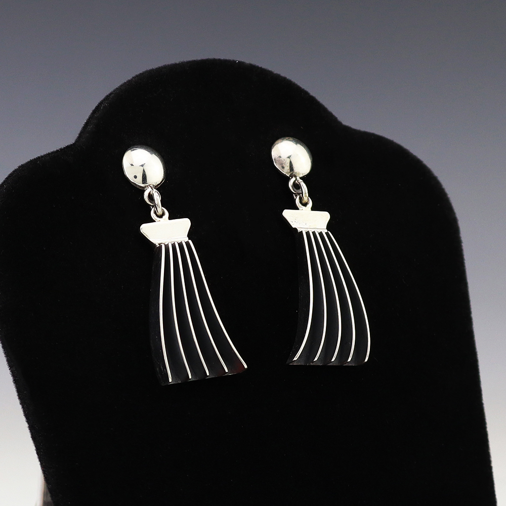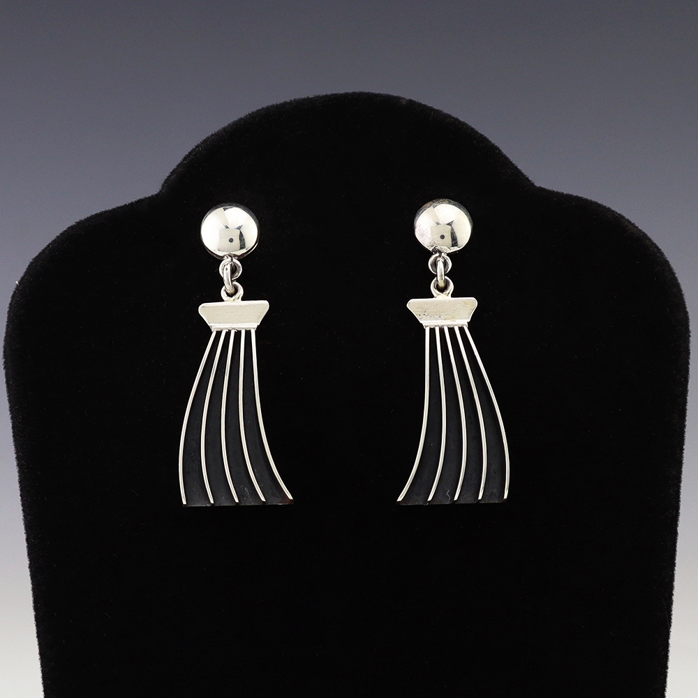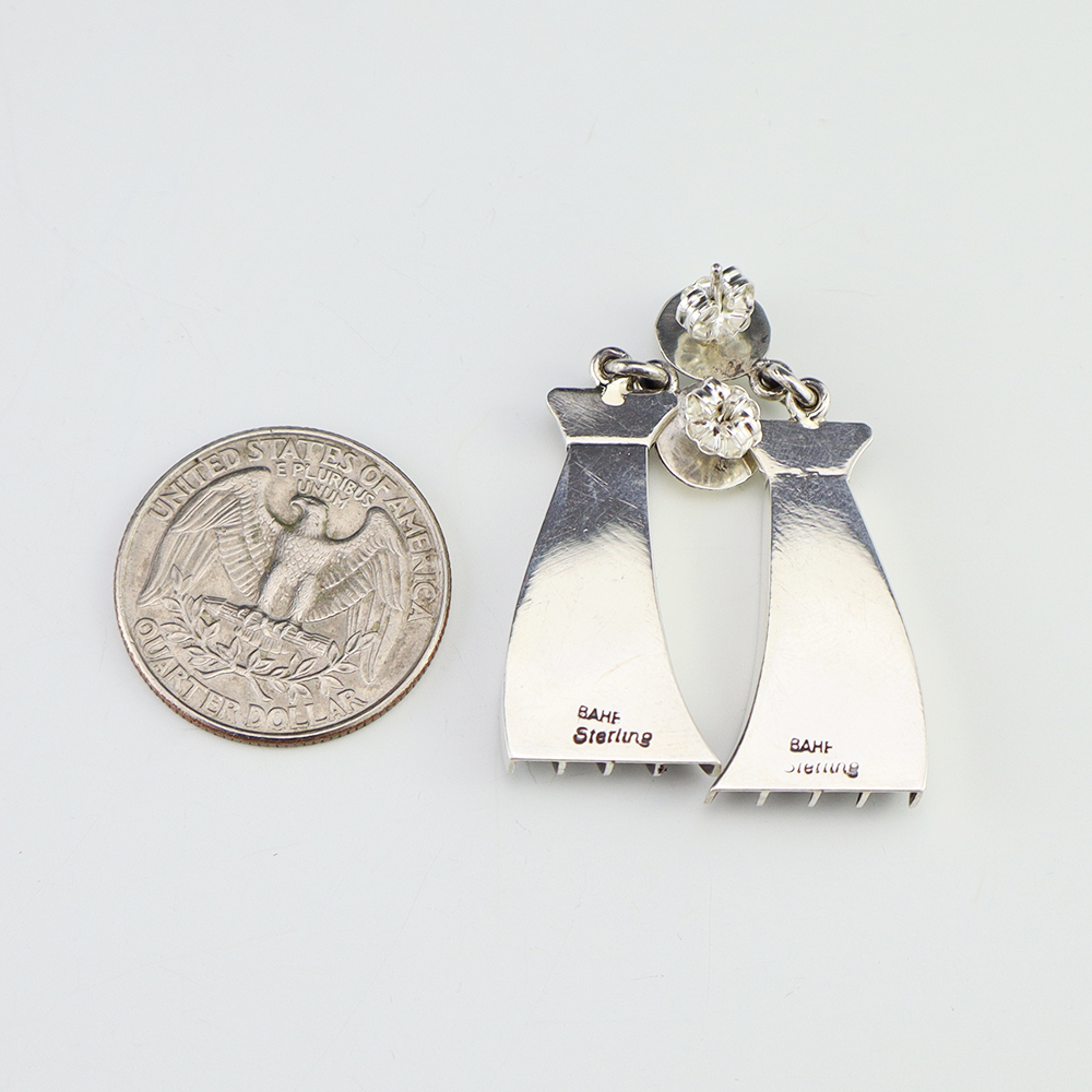 Stunning earrings hand made out of sterling silver. Hand made by Navajo silversmith James Bahe. These fabulous earrings will become a versatile accessory in your jewelry collection. Weighs 8 grams. Signed.