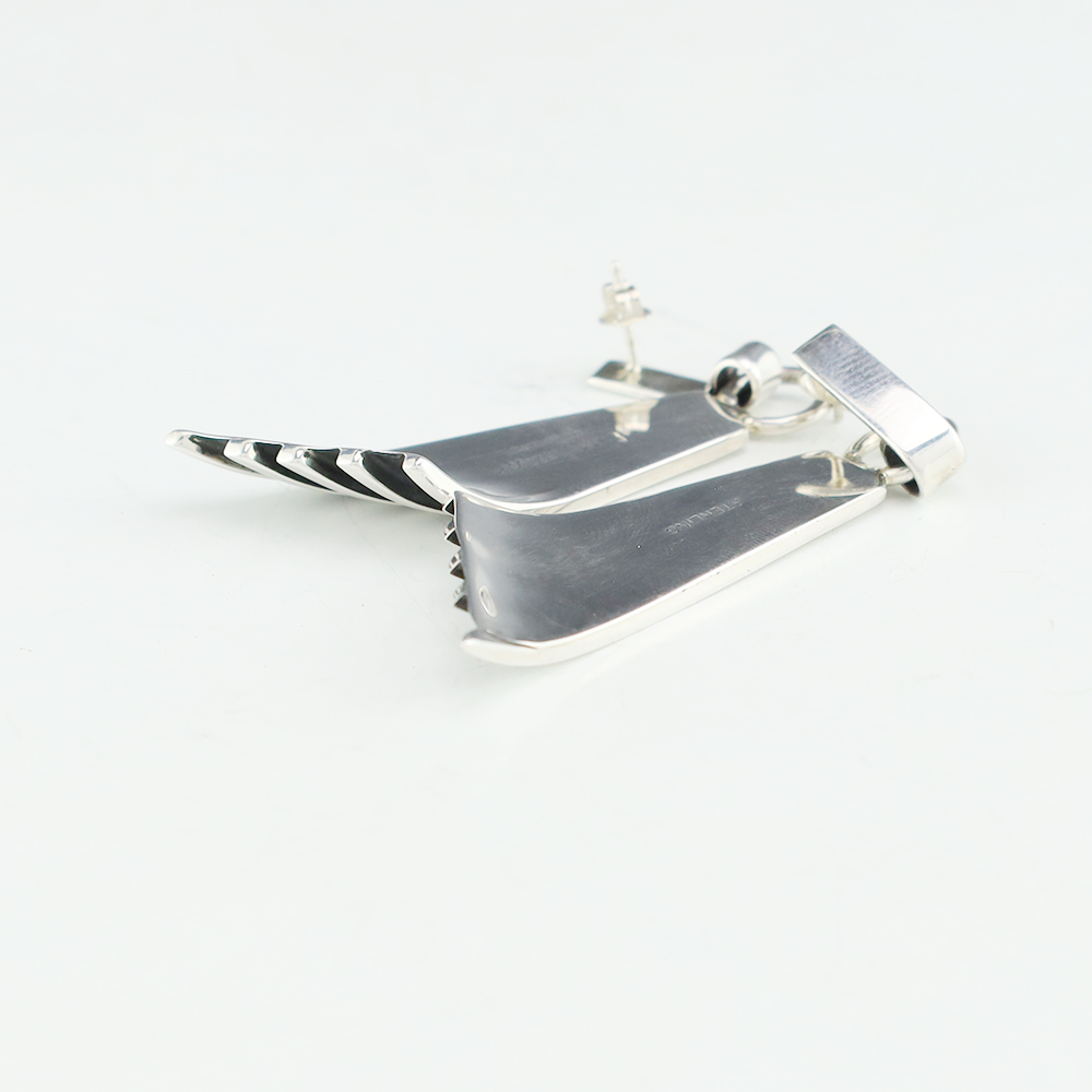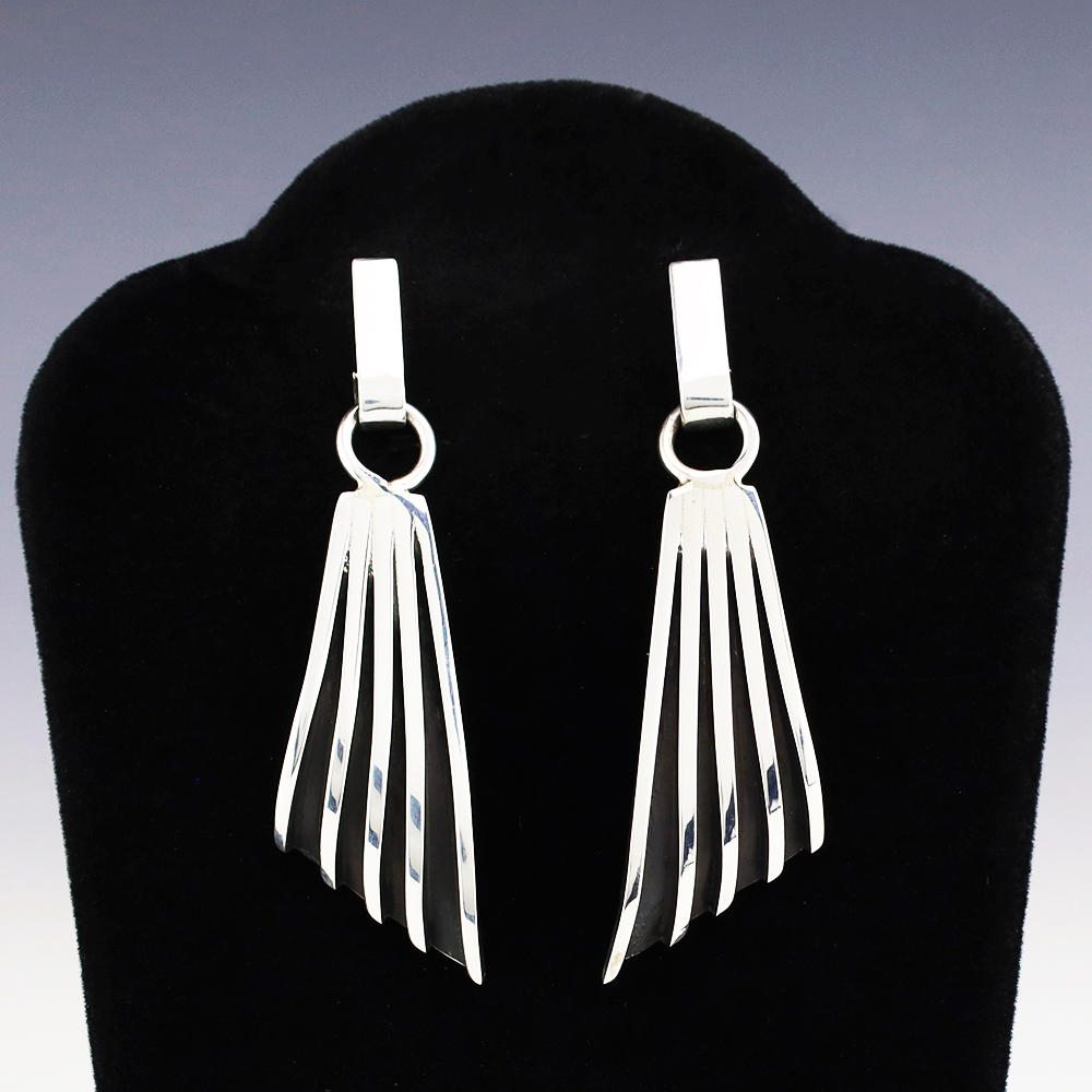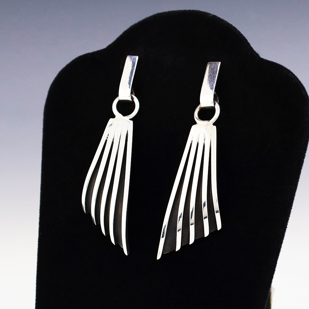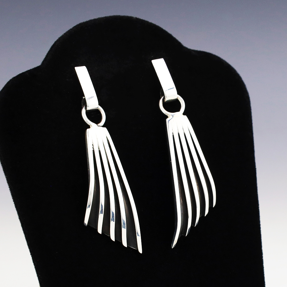 Stunning earrings hand made out of sterling silver. Hand made by Navajo silversmith Tom Hawk. These fabulous earrings will become a versatile accessory in your jewelry collection. Weighs 16 grams. Signed.