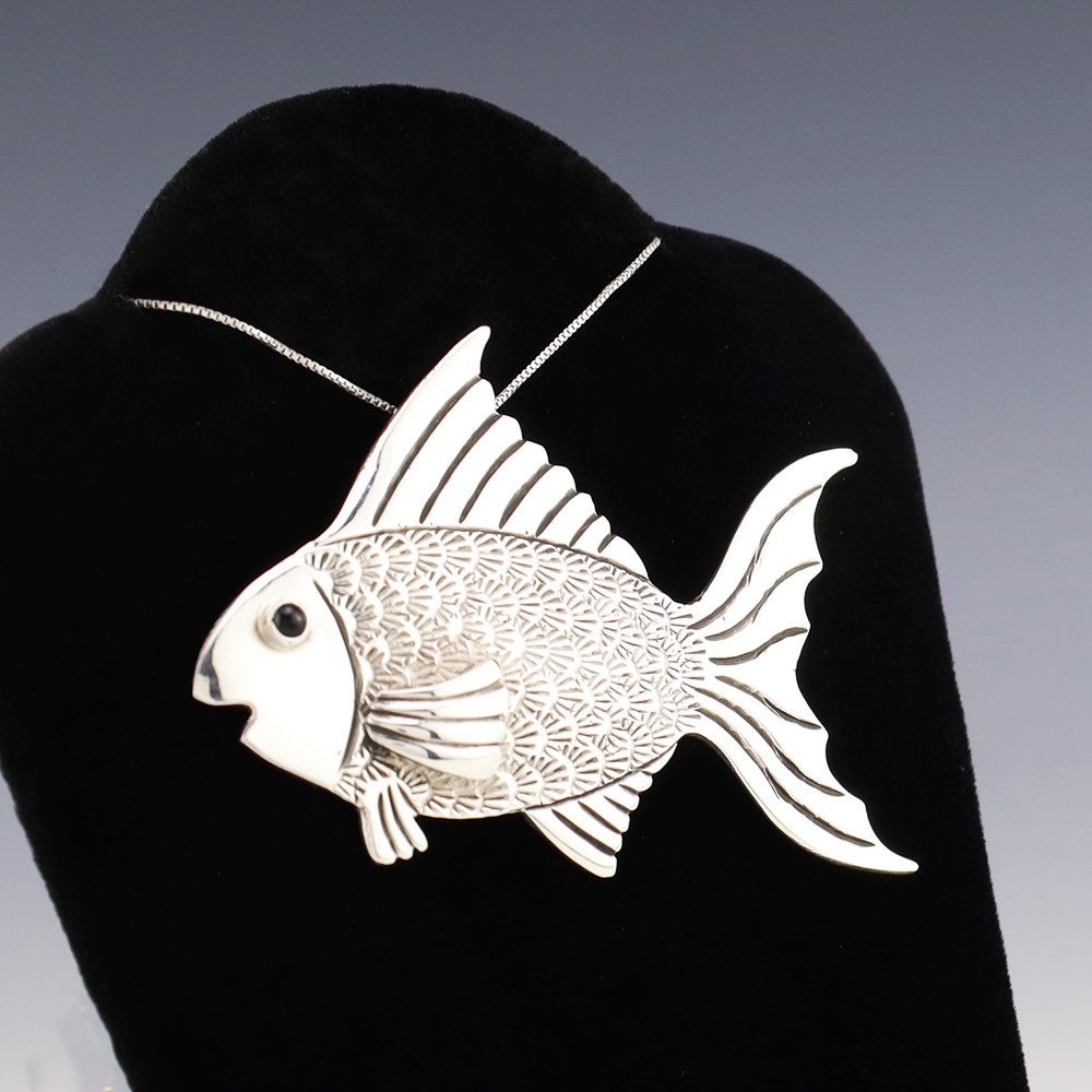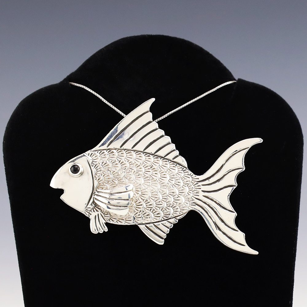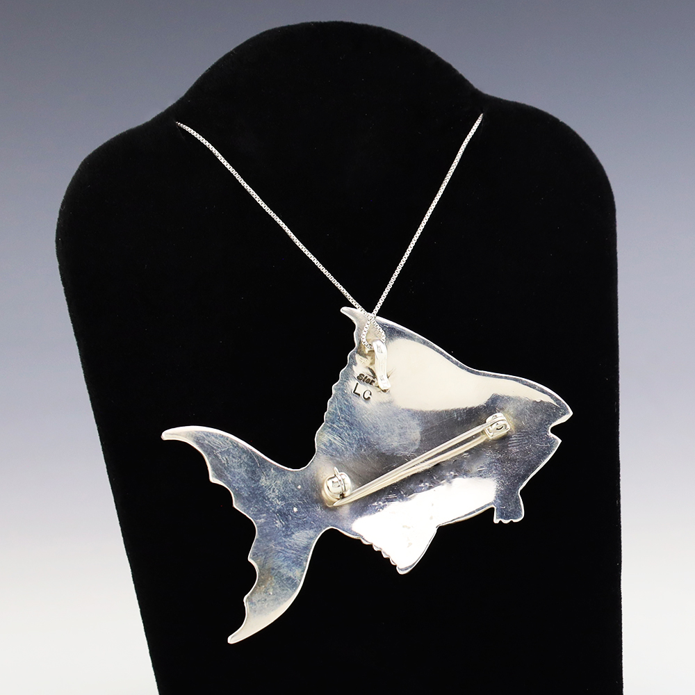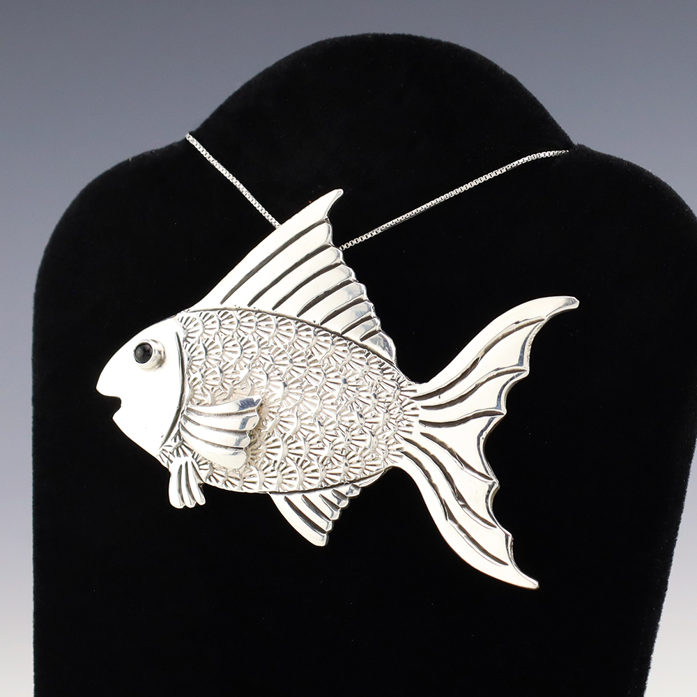 Wonderful sterling silver Fish pin by Navajo artist Lee Charley. The eye is made out of Onyx. Can also be worn as a pendant. (Chain not included) A timeless beauty that you will enjoy for years to come. Weighs 16 grams. Signed