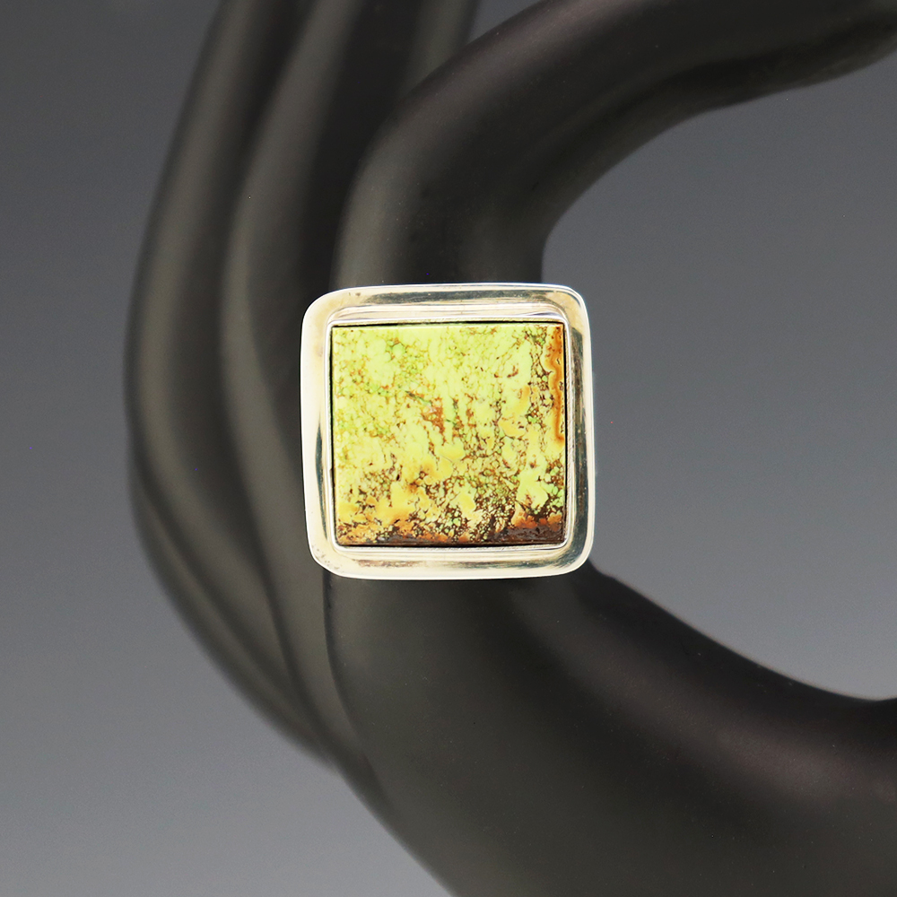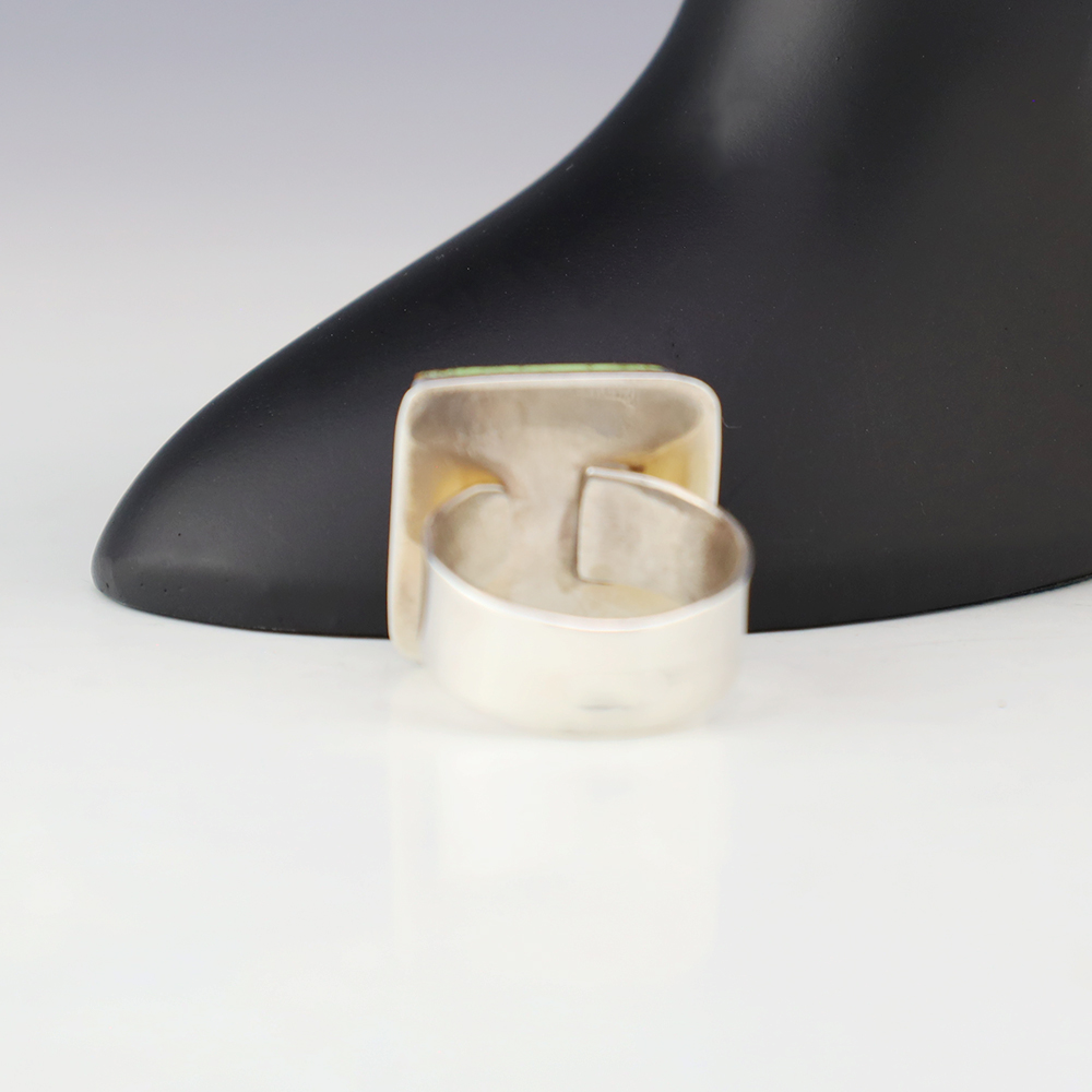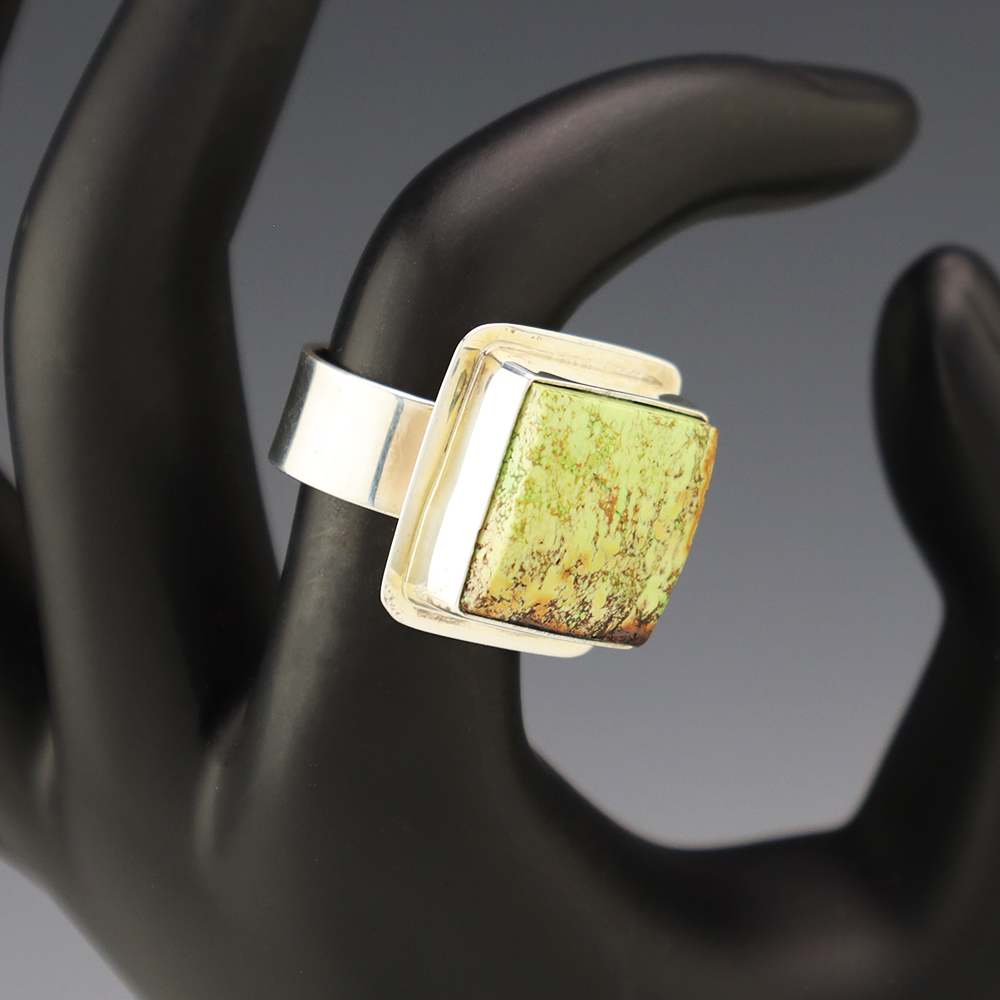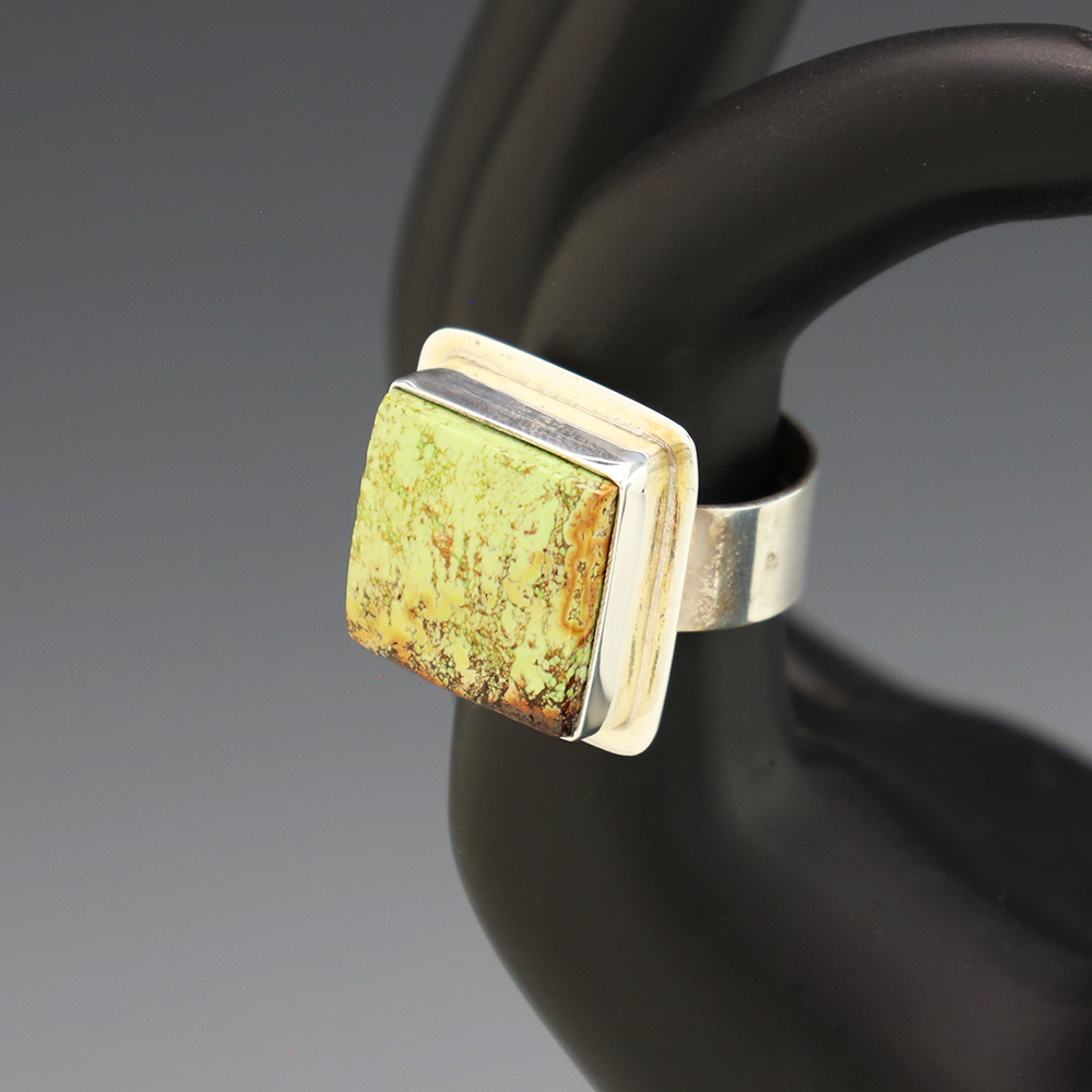 This ring is a great representation of hand made Navajo jewelry and will make a statement on your hand. Beautiful piece of Gaspeite is set into a sterling silver setting. Weighs 10 grams. Size 7 1/2 and slightly adjustable.